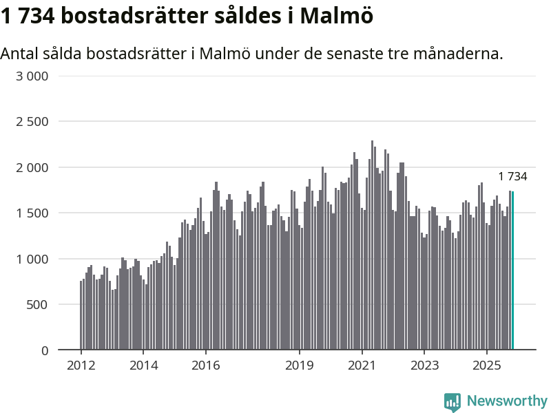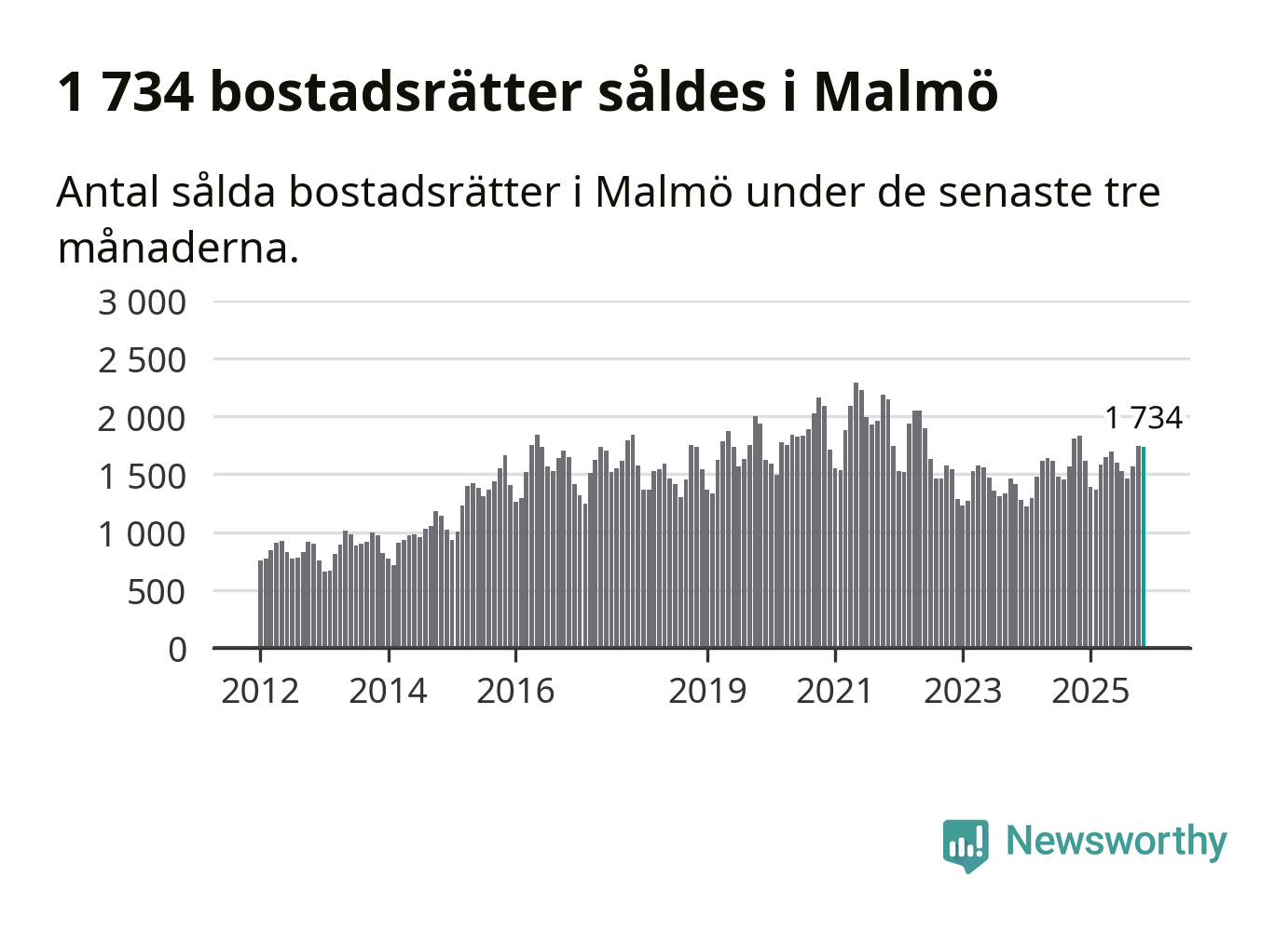 Sammanlagt såldes 1 734 bostadsrätter i Malmö kommun mellan september och november till ett genomsnittligt pris på 2,5 miljoner kronor. I fjol gjordes 1 829 affärer vid den här tiden på året.