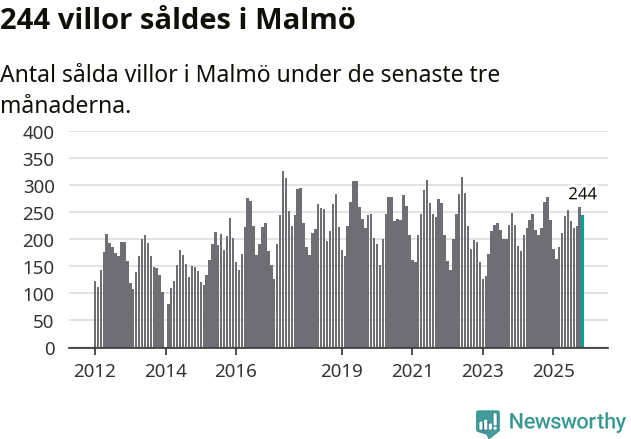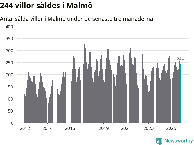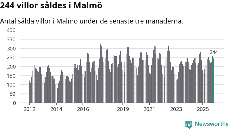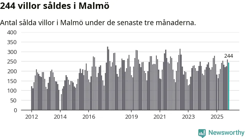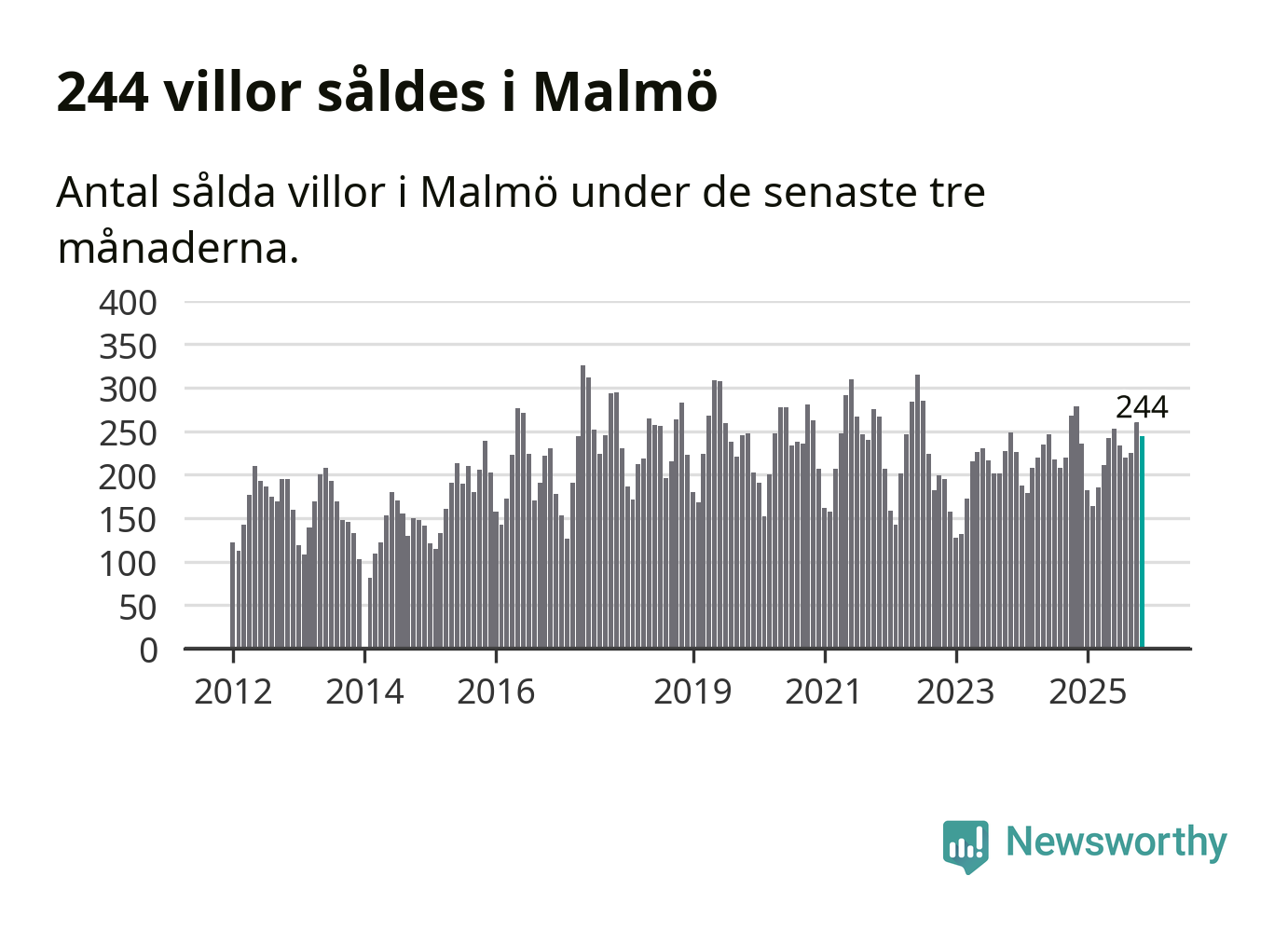 Sammanlagt såldes 244 villor i Malmö kommun mellan september och november till ett genomsnittligt pris på 6,6 miljoner kronor. I fjol gjordes 278 affärer vid den här tiden på året.