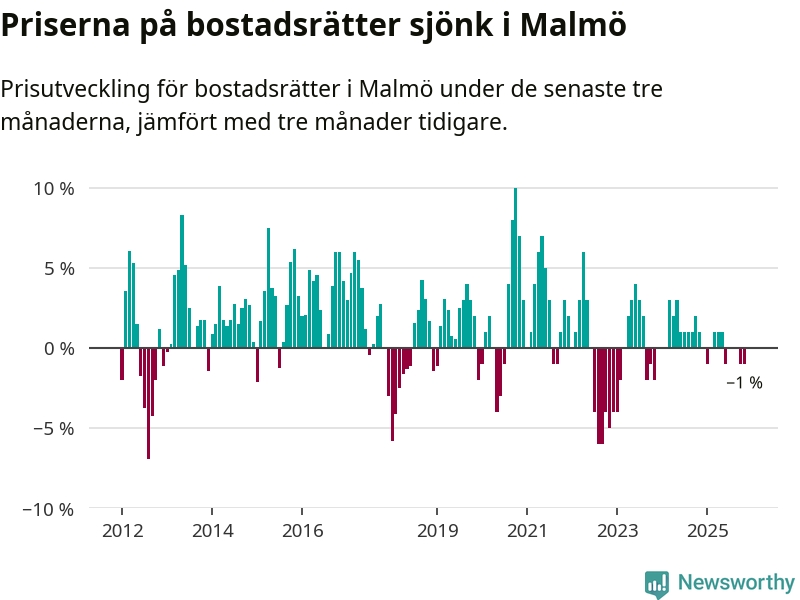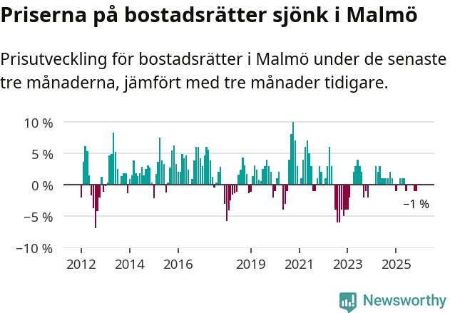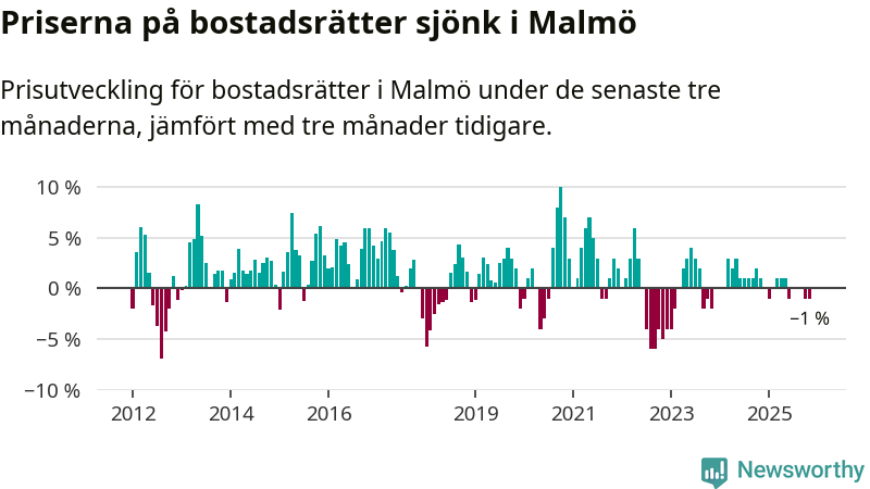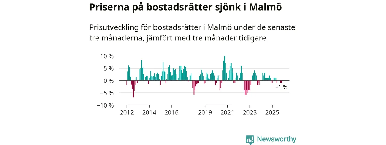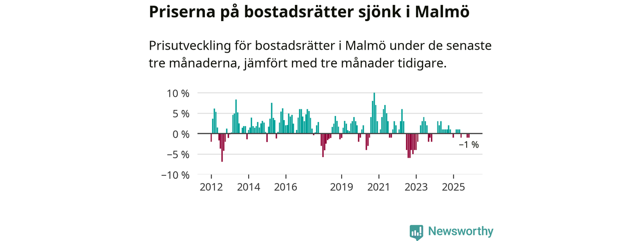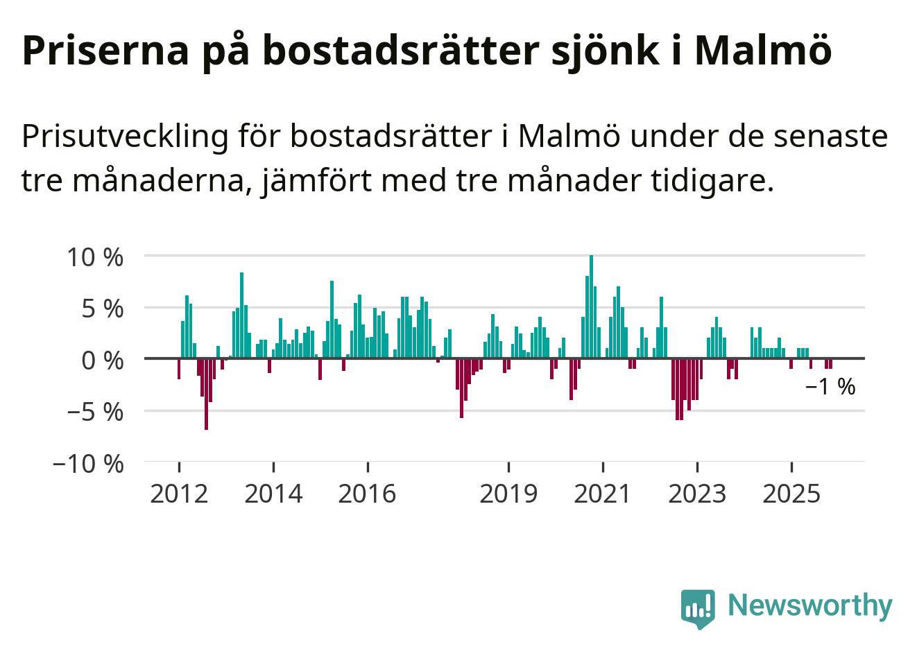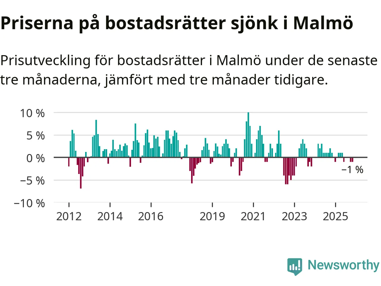 Priserna på bostadsrätter har gått ner i Malmö kommun. Medelpriset på försäljningarna under de senaste tre månaderna visar på en nedgång med 1 procent.