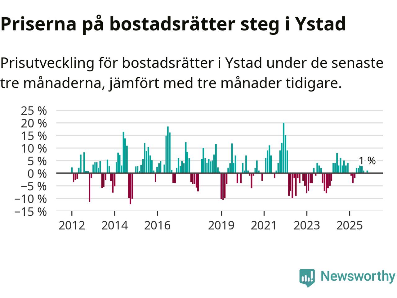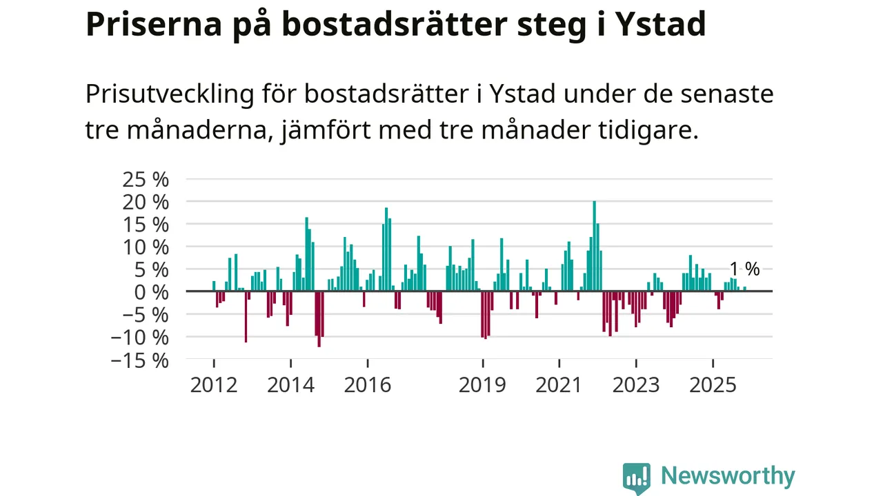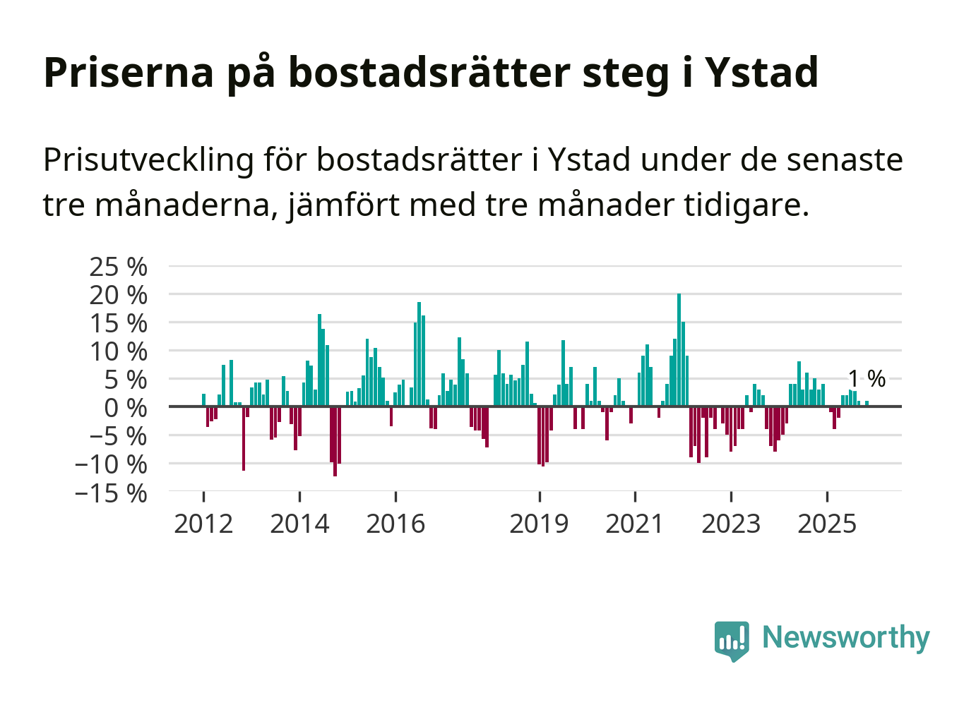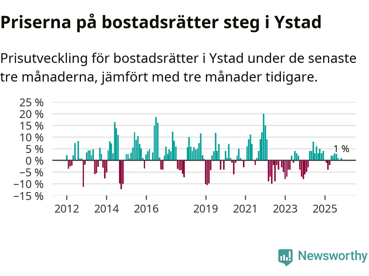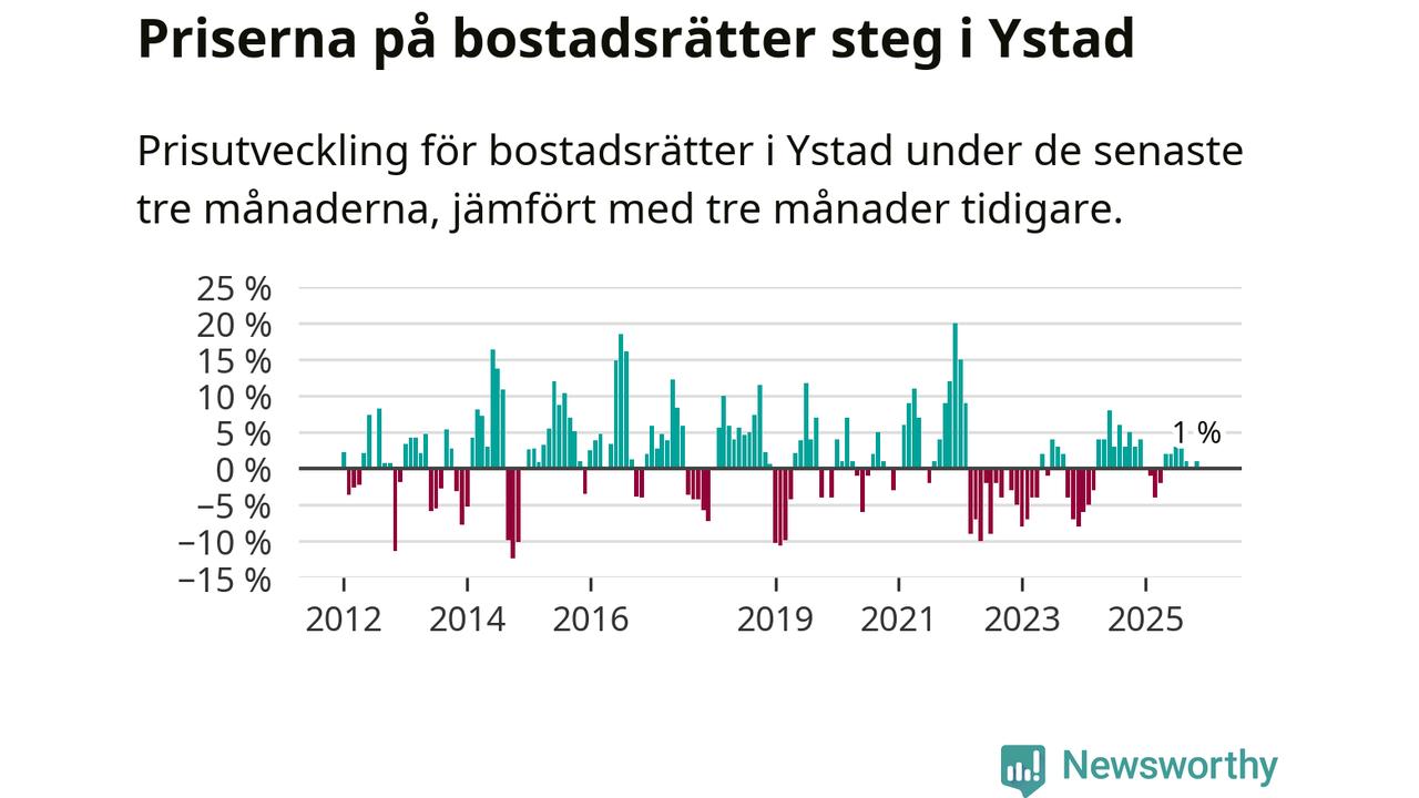 Priserna på bostadsrätter har gått upp i Ystads kommun. Medelpriset på försäljningarna under de senaste tre månaderna visar på en uppgång med 1 procent.