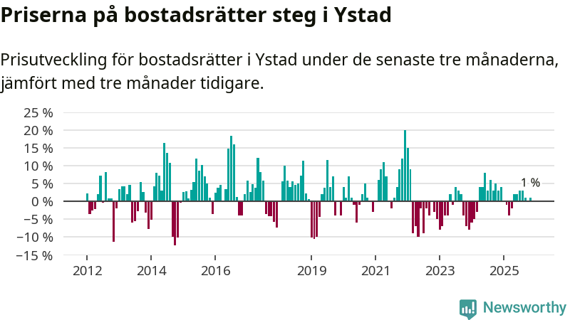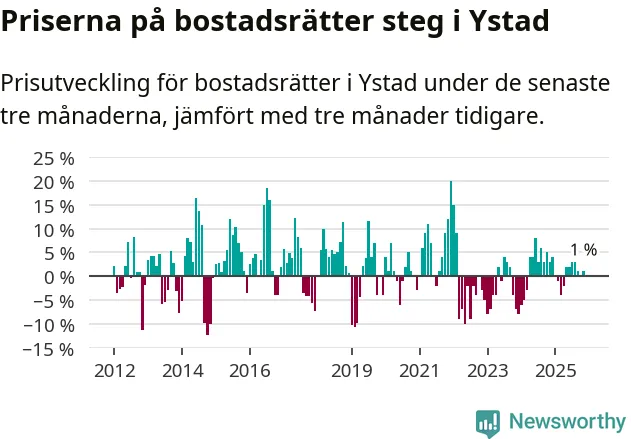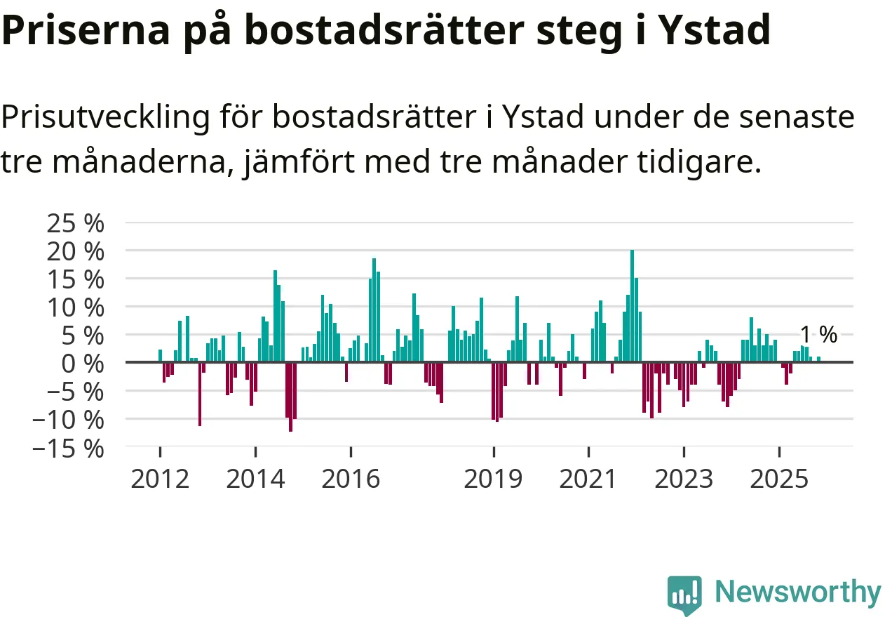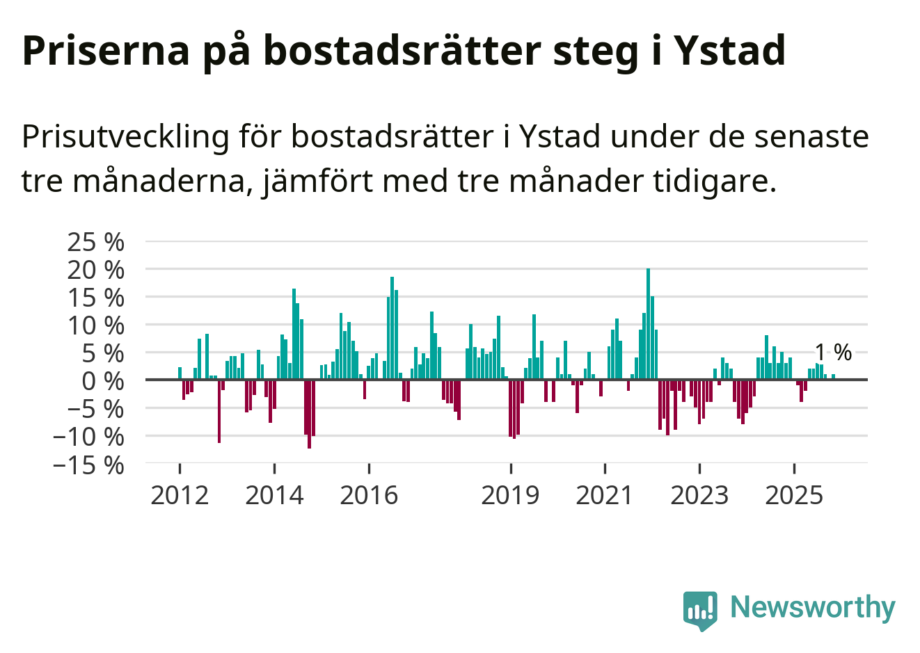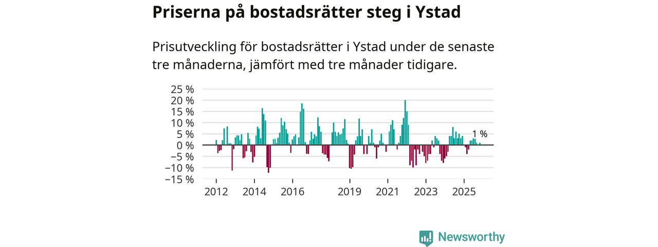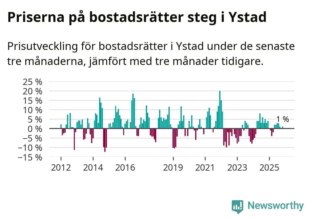Priserna på bostadsrätter har gått upp i Ystads kommun. Medelpriset på försäljningarna under de senaste tre månaderna visar på en uppgång med 1 procent.
