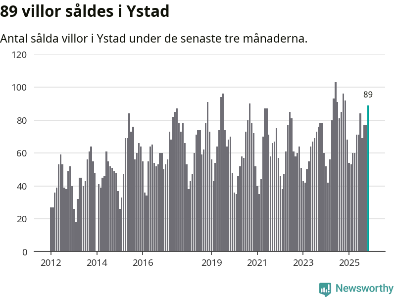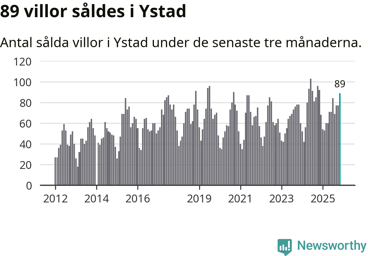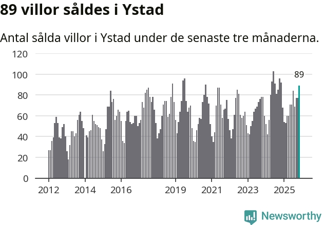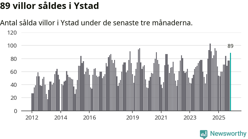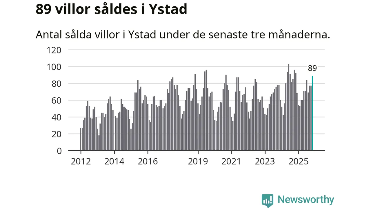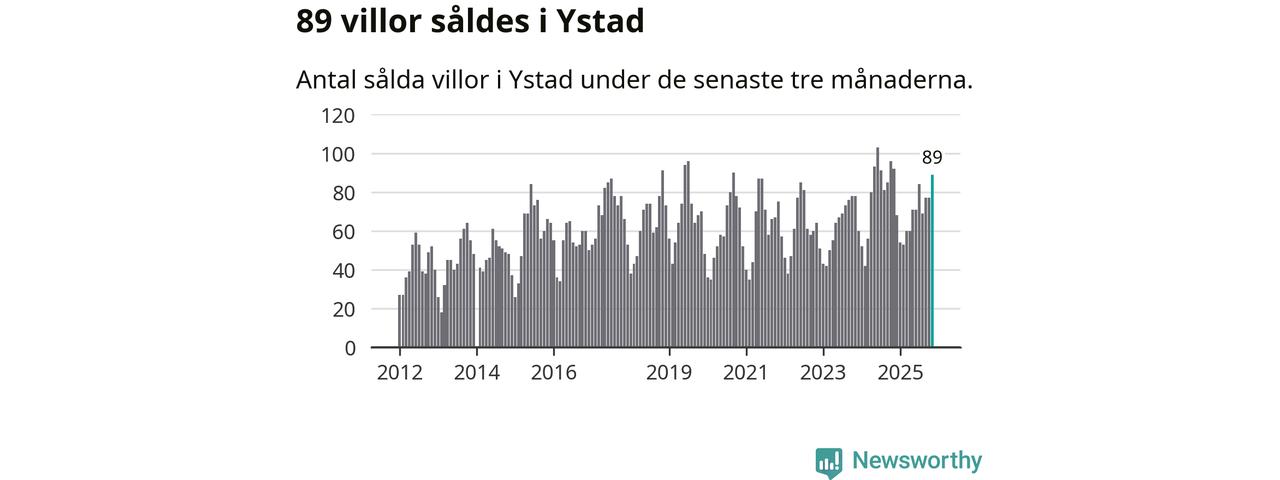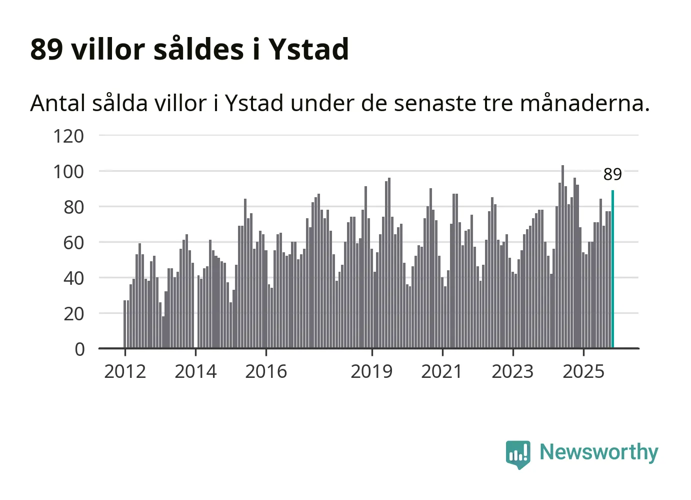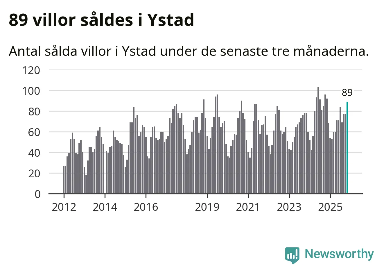 Sammanlagt såldes 89 villor i Ystads kommun mellan september och november till ett genomsnittligt pris på 3,8 miljoner kronor. I fjol gjordes 92 affärer vid den här tiden på året.