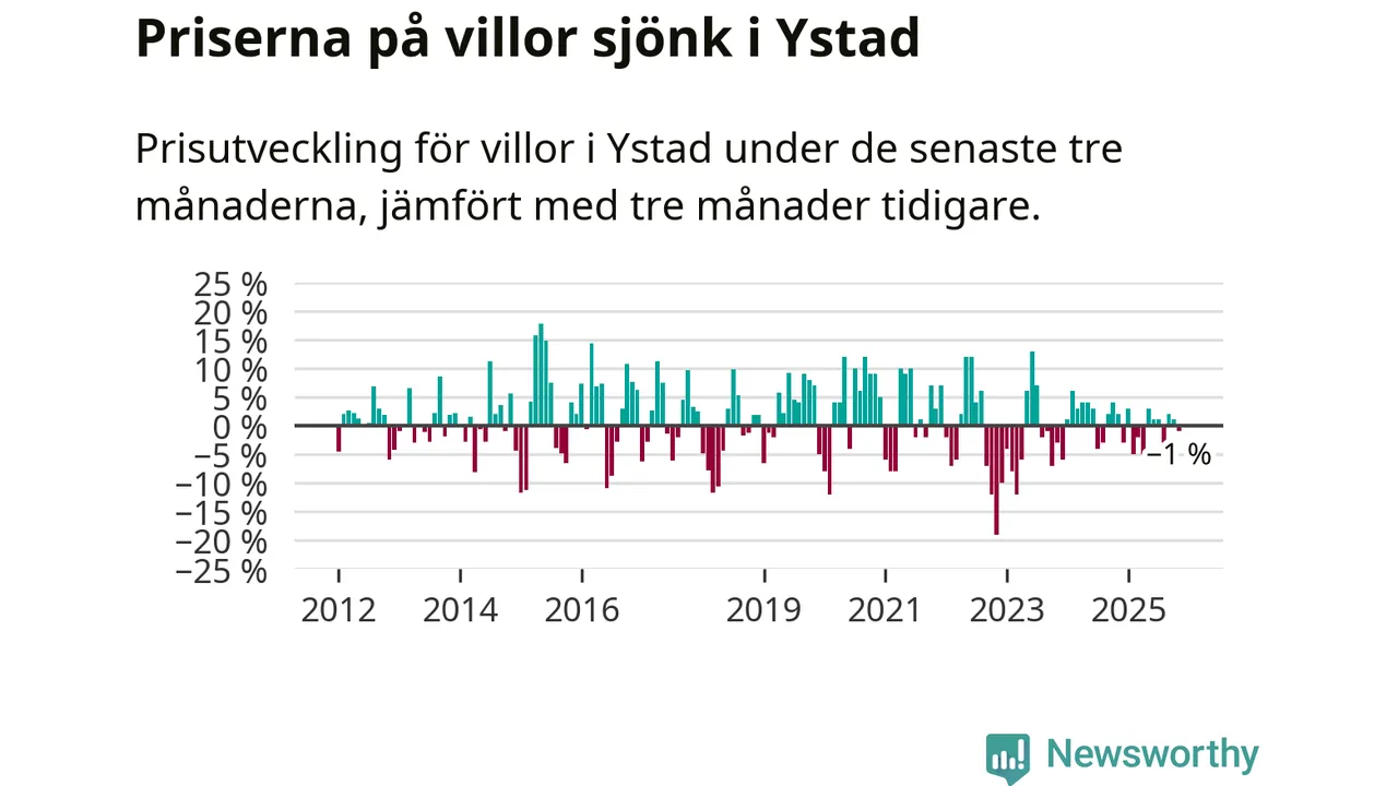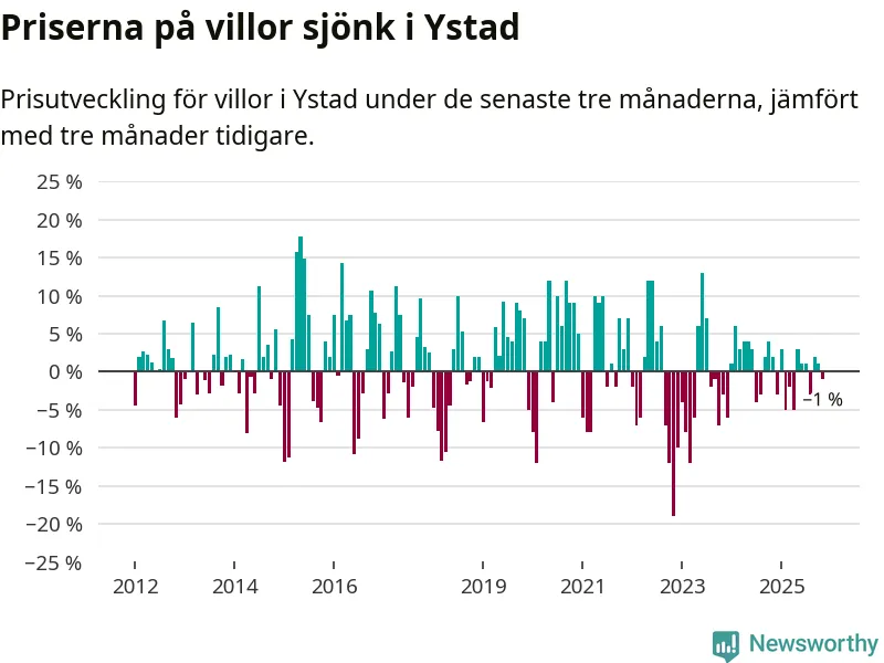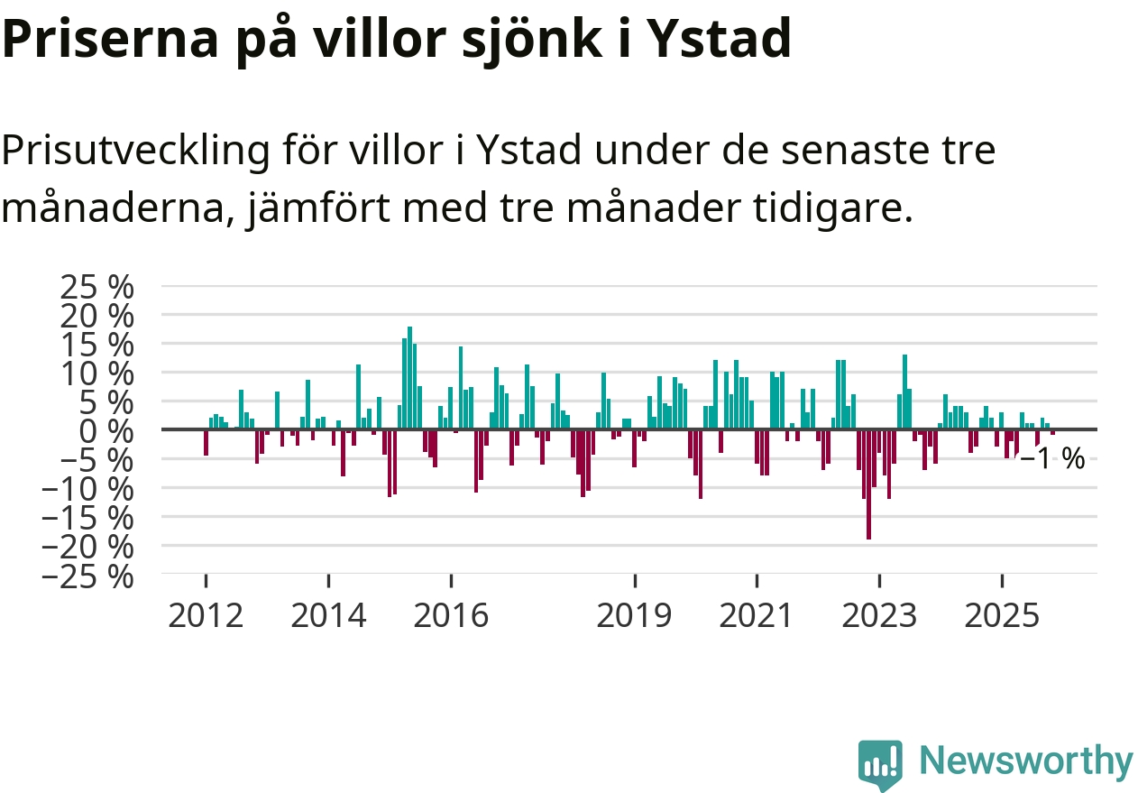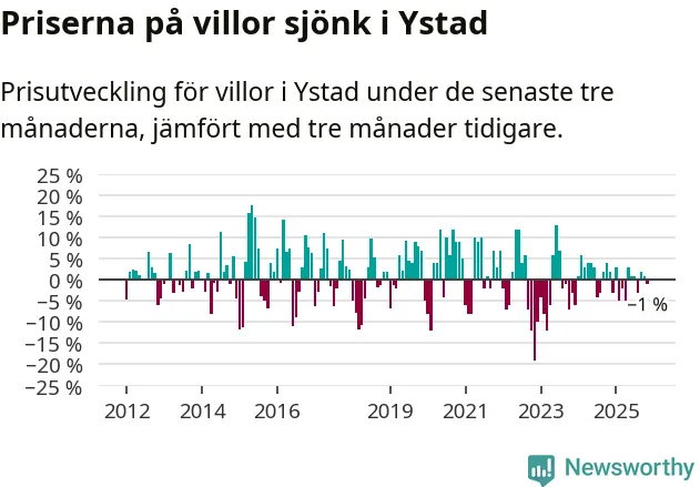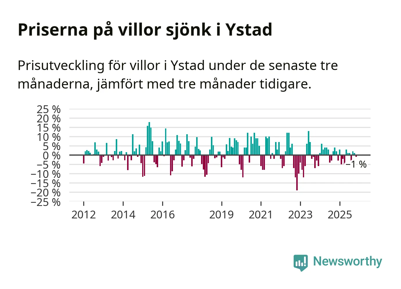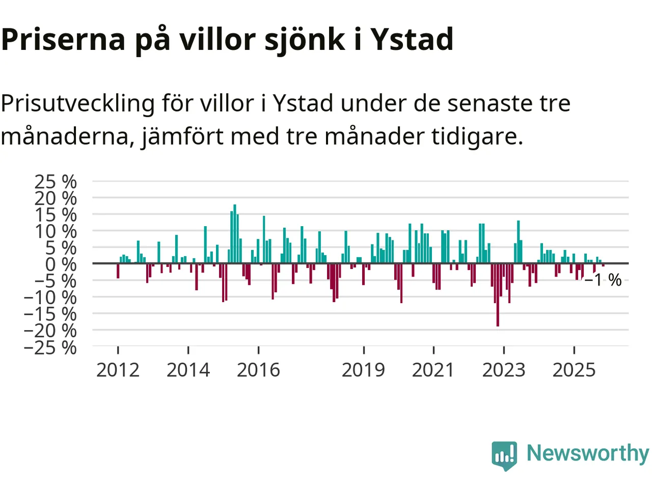 Villapriserna har gått ner i Ystads kommun. Medelpriset på försäljningarna under de senaste tre månaderna visar på en nedgång med 1 procent.