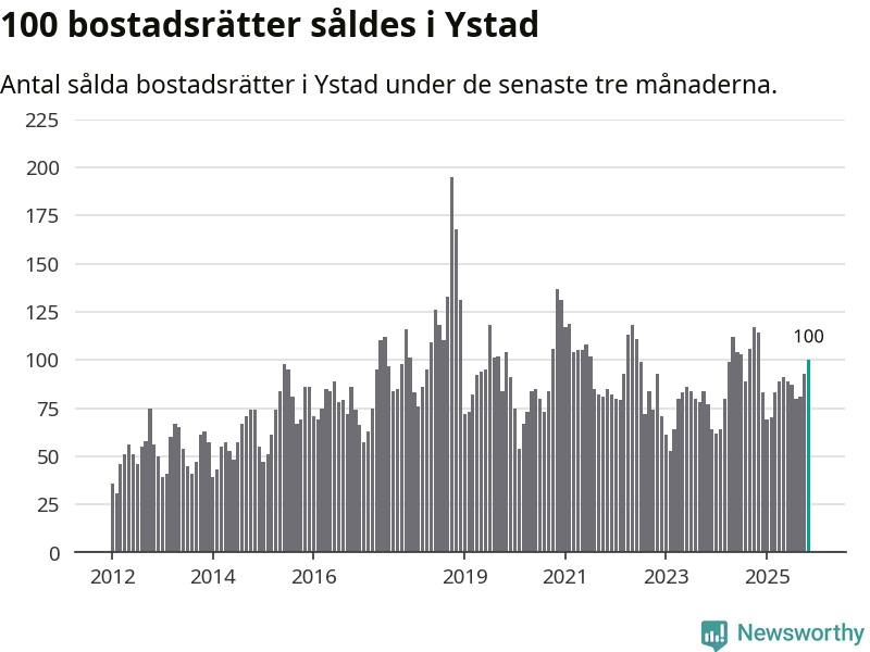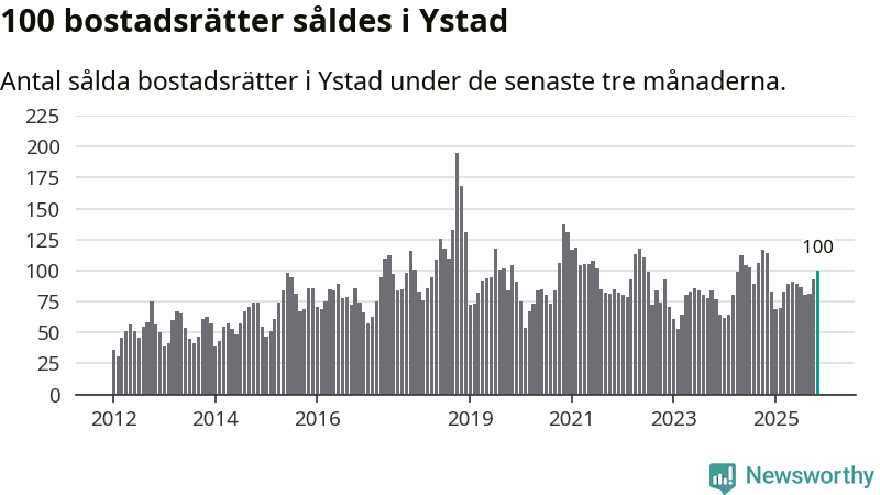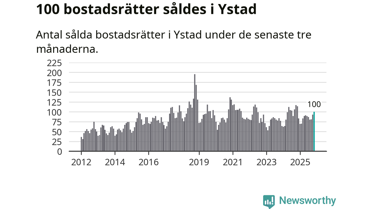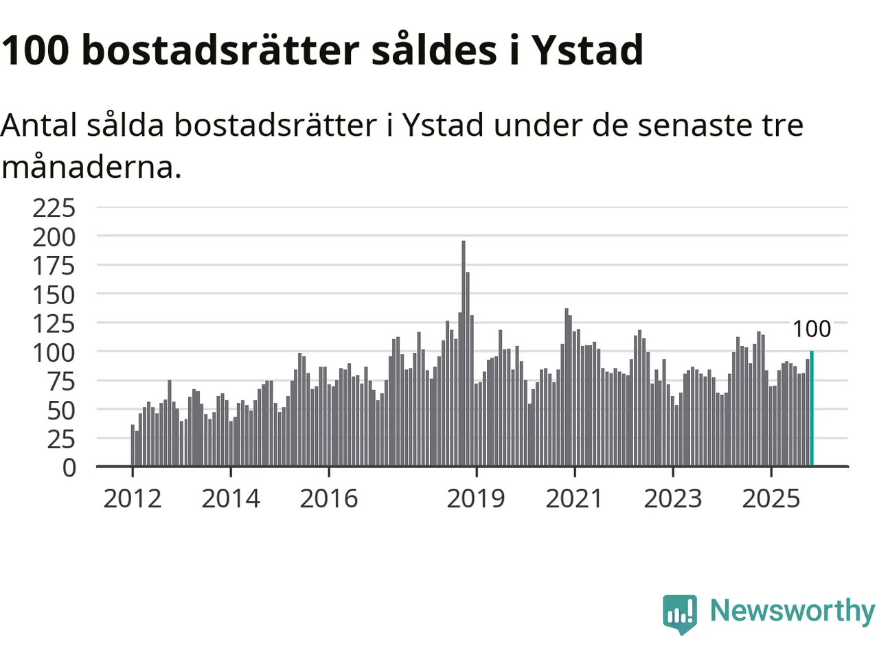Sammanlagt såldes 100 bostadsrätter i Ystads kommun mellan september och november till ett genomsnittligt pris på 1,9 miljoner kronor. I fjol gjordes 114 affärer vid den här tiden på året.