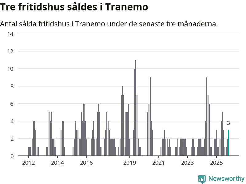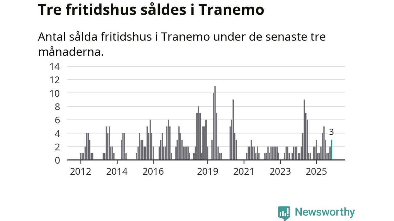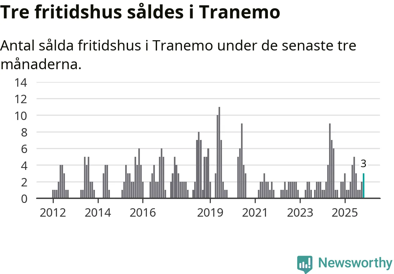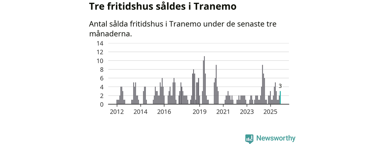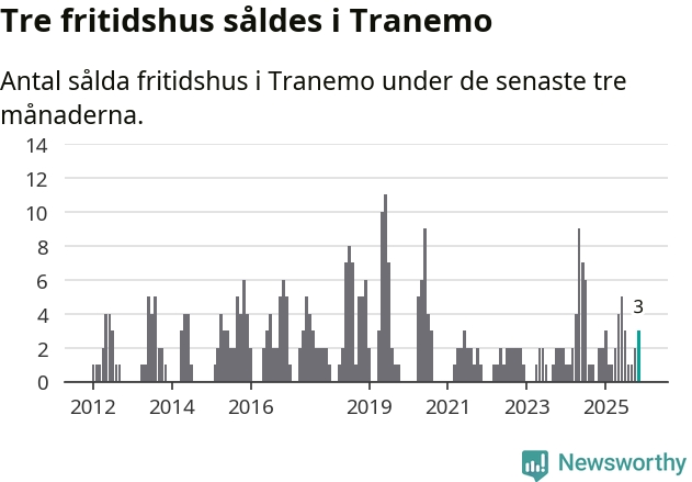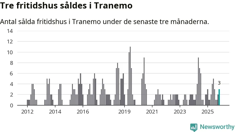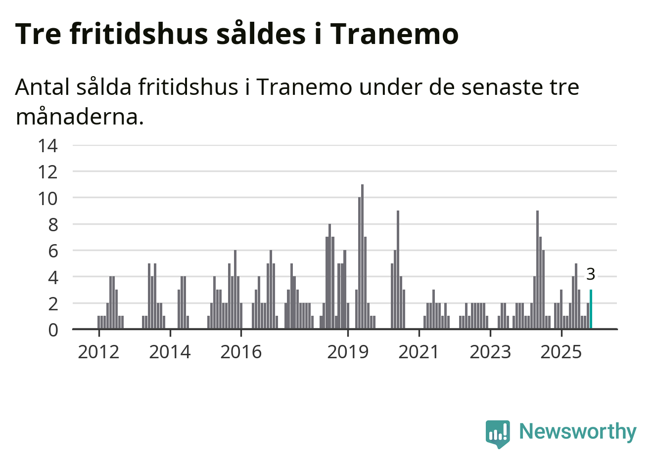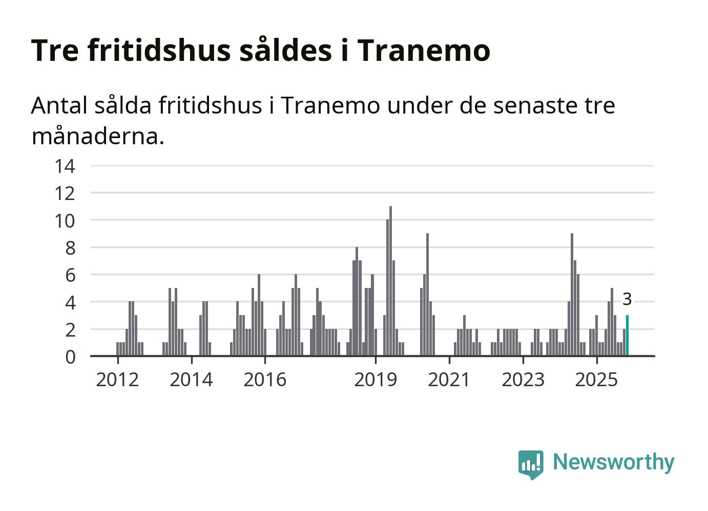 Mellan september och november gjordes sammanlagt tre affärer med fritidshus i Tranemo kommun. Det kan jämföras med två vid motsvarande tid i fjol.