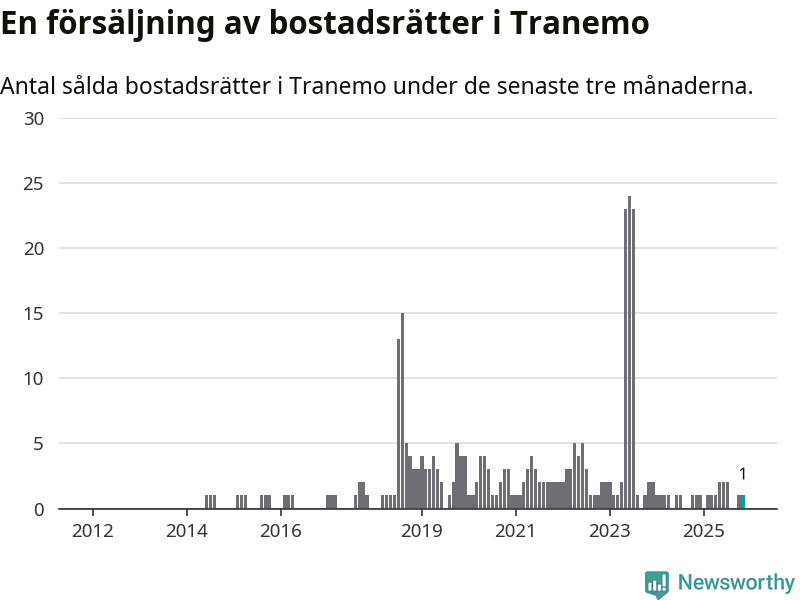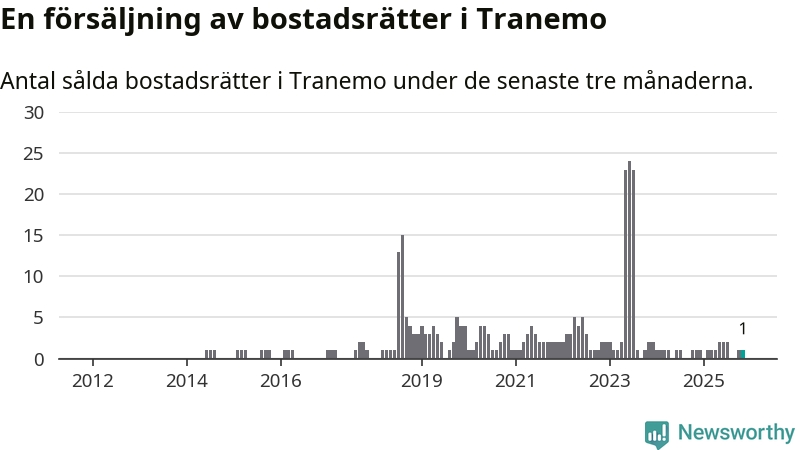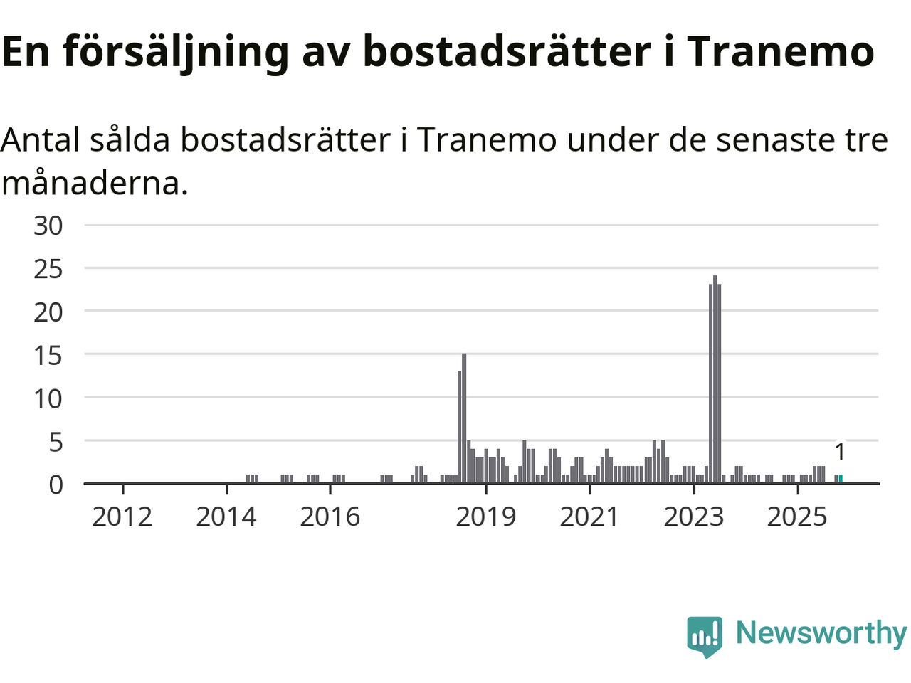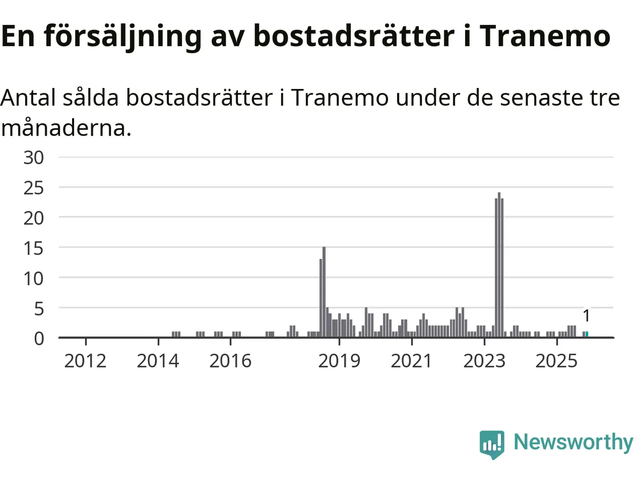 Mellan september och november gjordes sammanlagt en affär med bostadsrätter i Tranemo kommun. Det är lika många affärer som vid motsvarande tid i fjol.