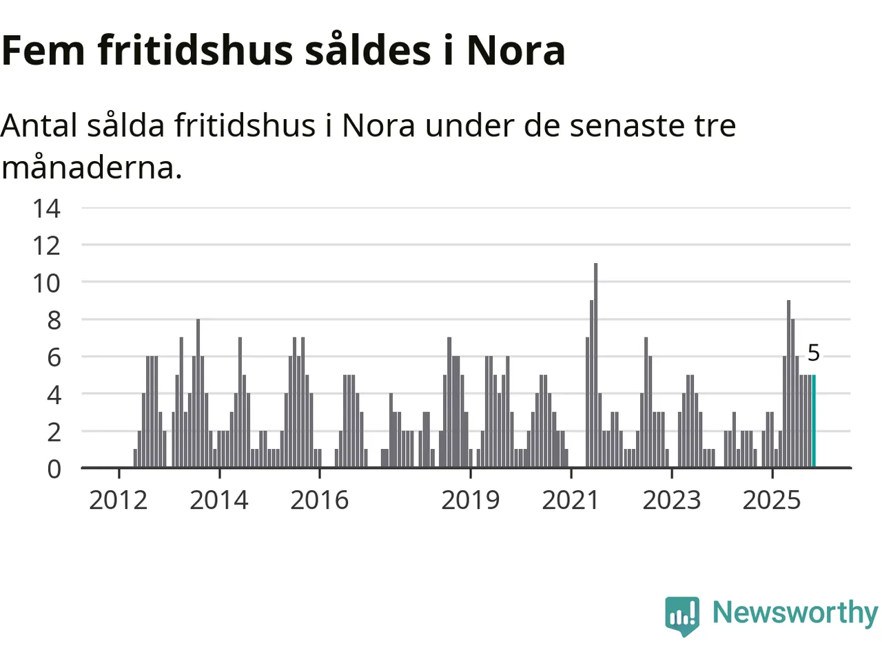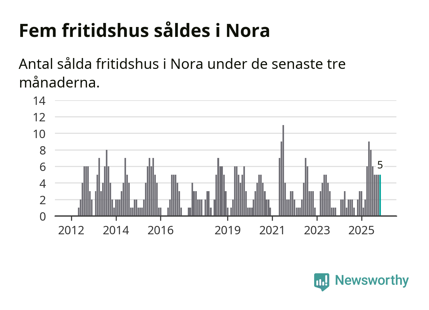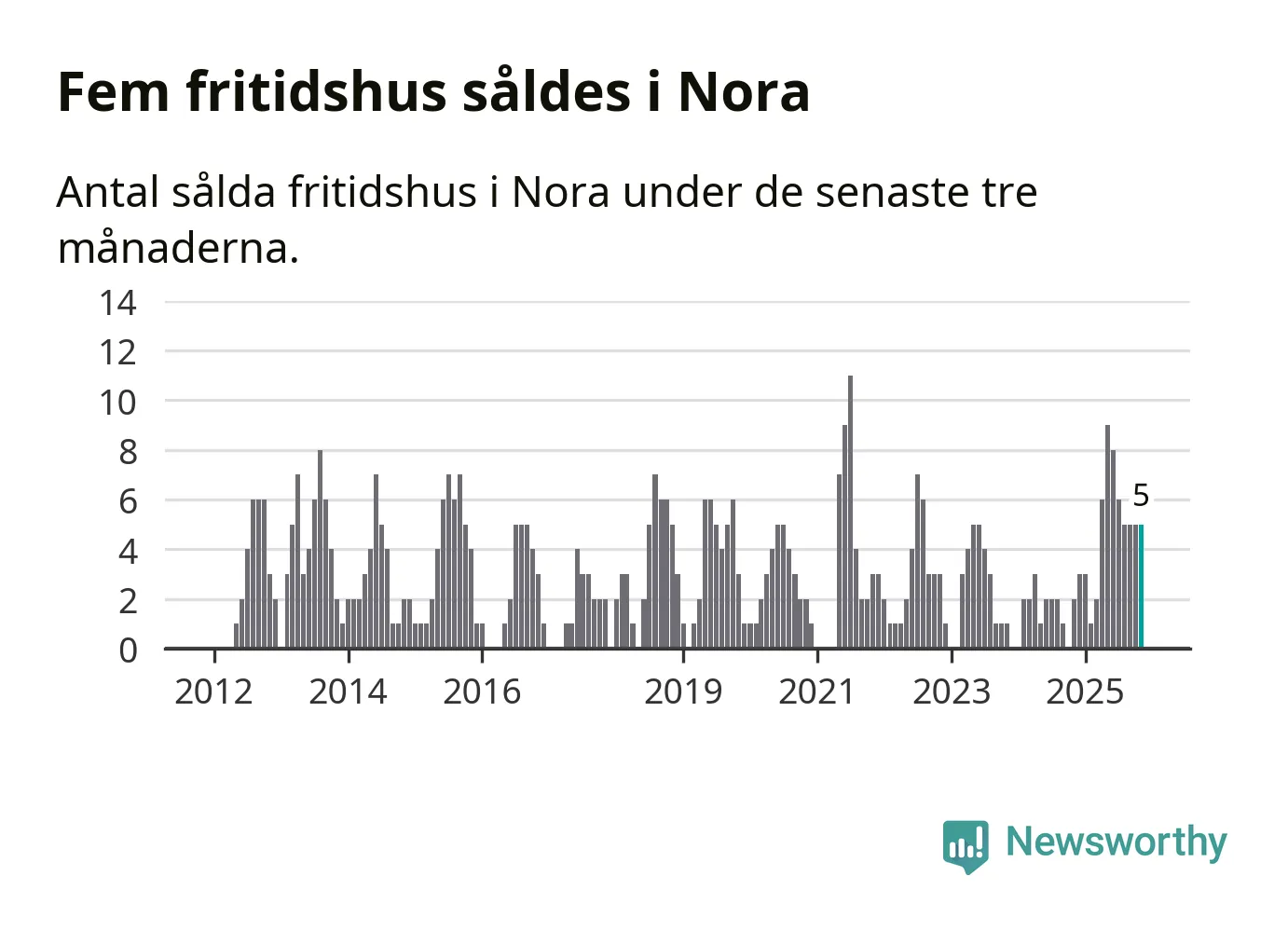 Mellan september och november gjordes sammanlagt fem affärer med fritidshus i Nora kommun. Det kan jämföras med två vid motsvarande tid i fjol.