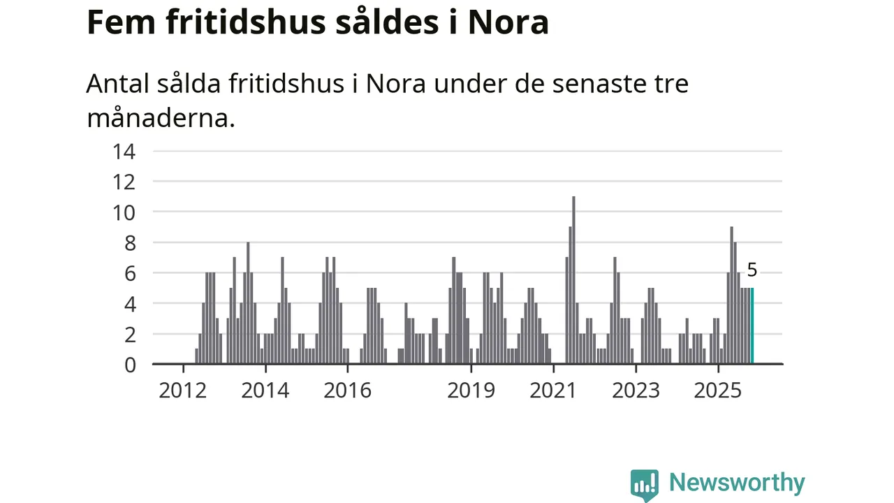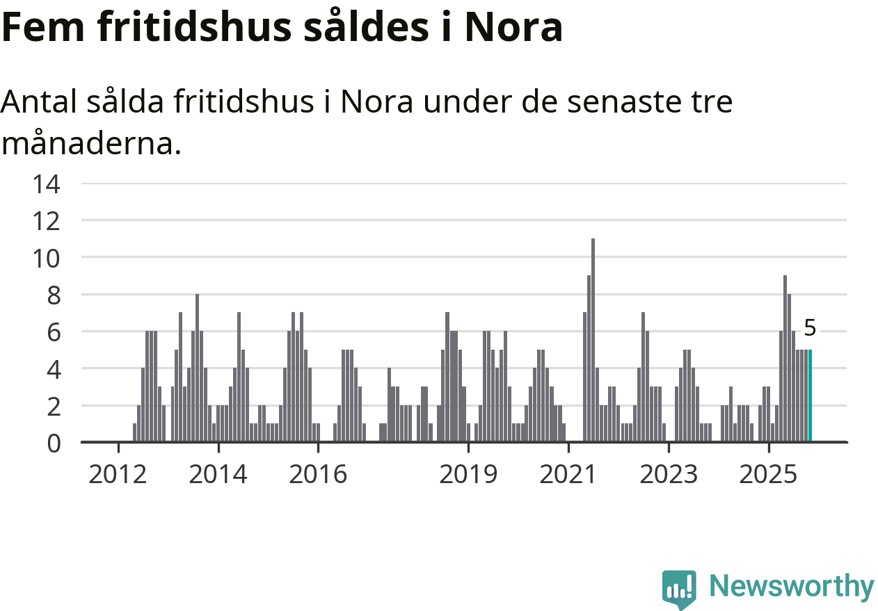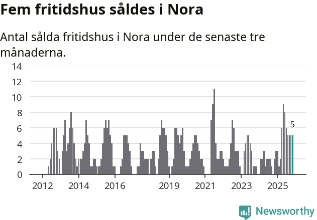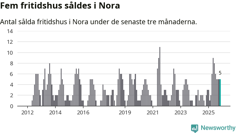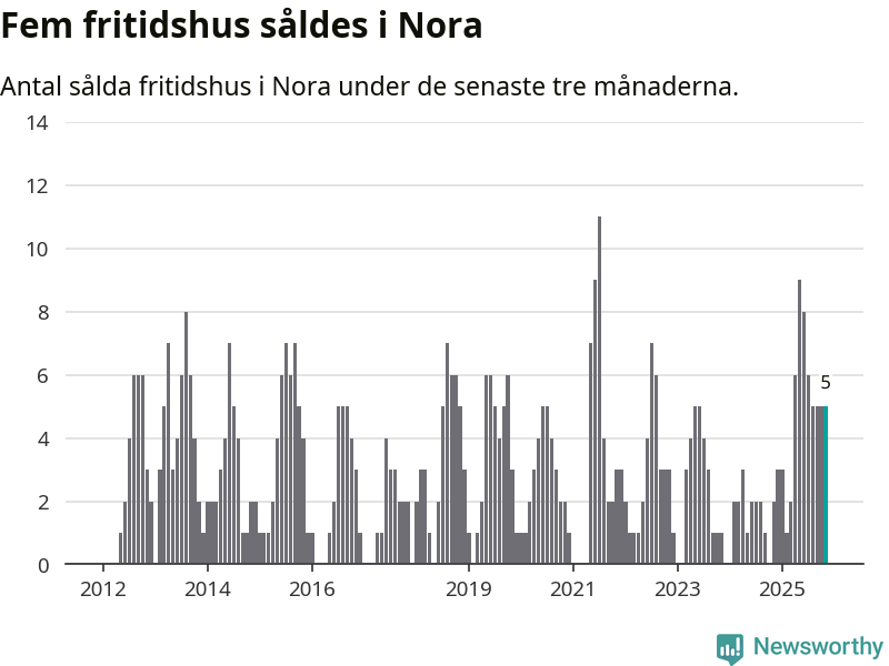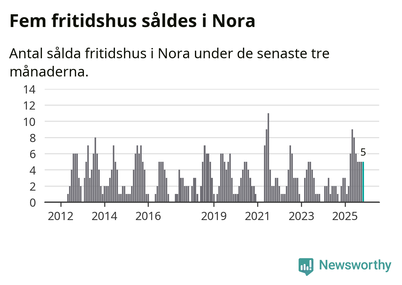 Mellan september och november gjordes sammanlagt fem affärer med fritidshus i Nora kommun. Det kan jämföras med två vid motsvarande tid i fjol.