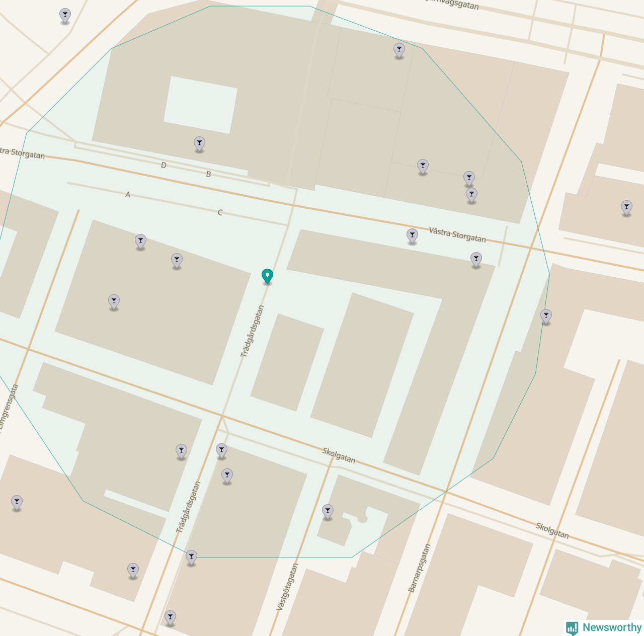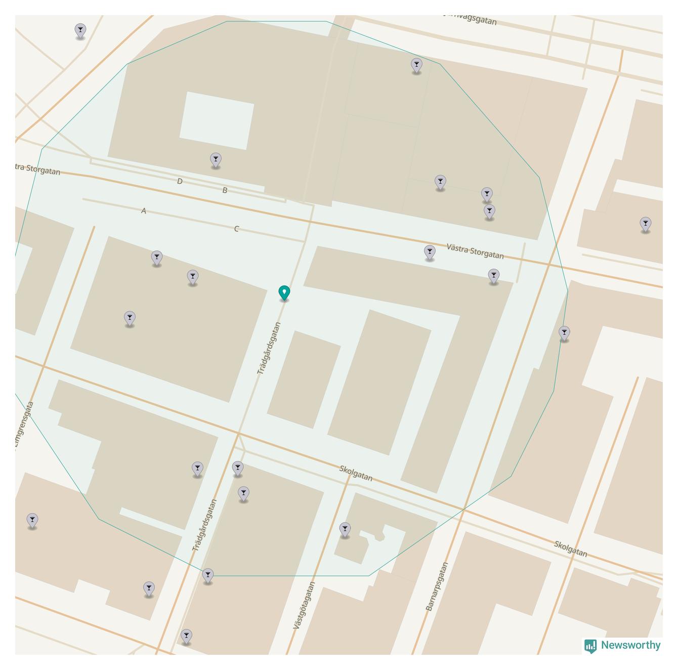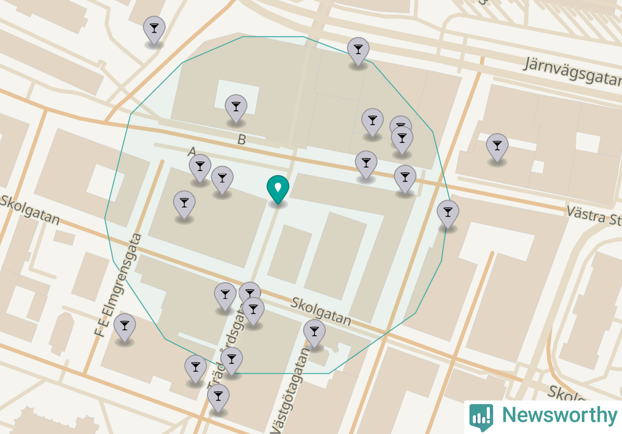Om du står på Trädgårdsgatan har du sisådär 14 krogar, restauranger eller hotell med serveringstillstånd inom en radie på 100 meter. Det är den krogtätaste platsen i Jönköpings kommun och den krogtätaste platsen i Jönköpings län.