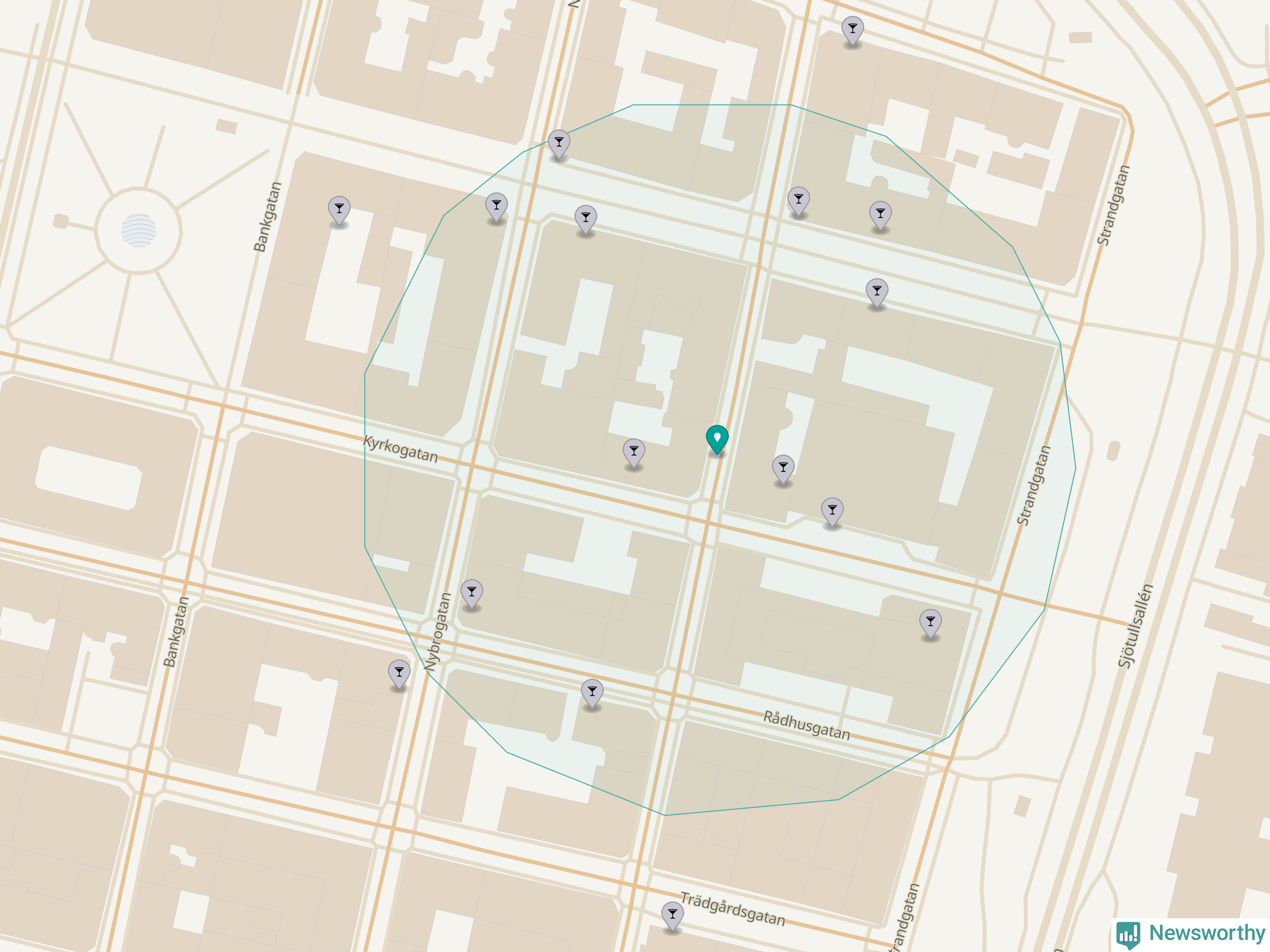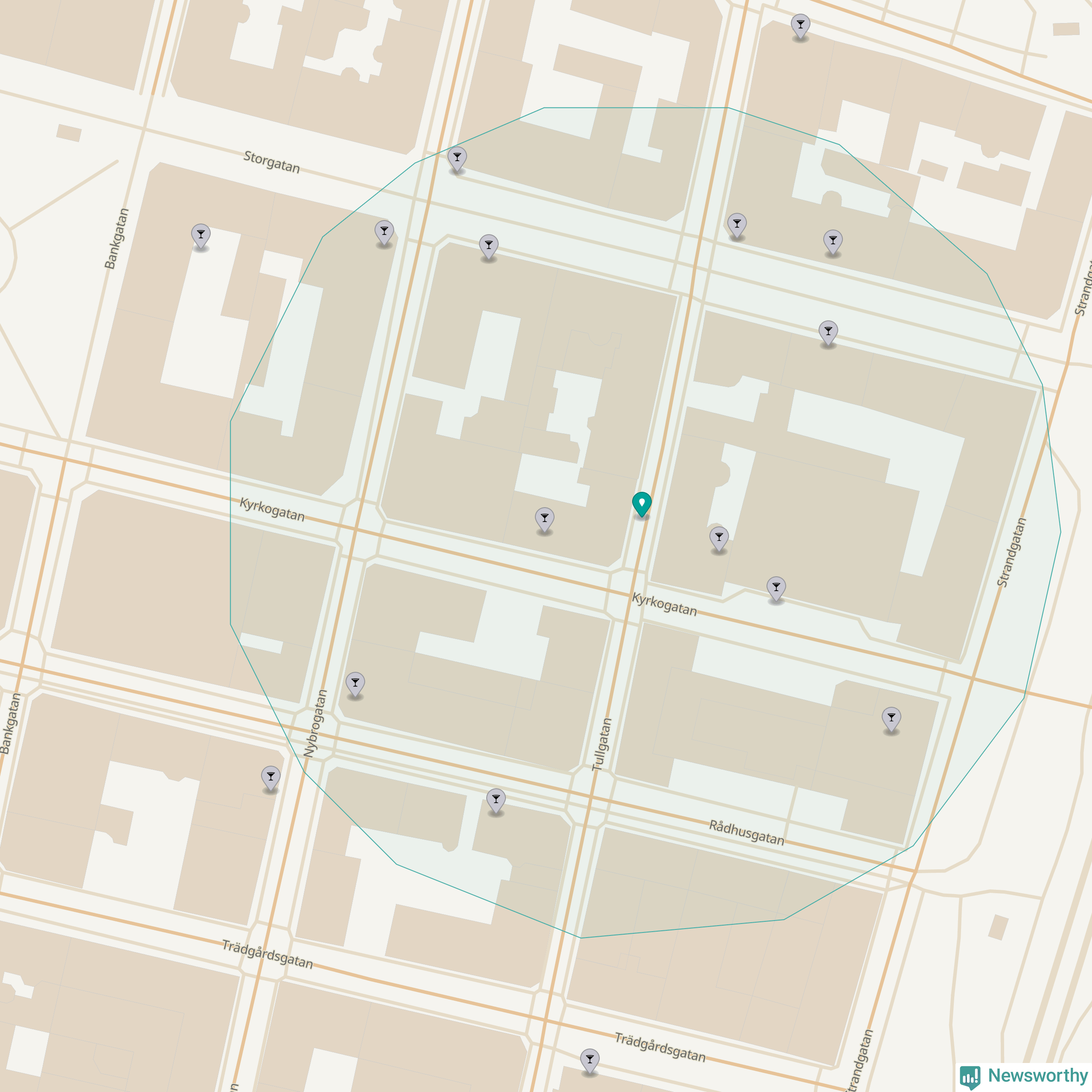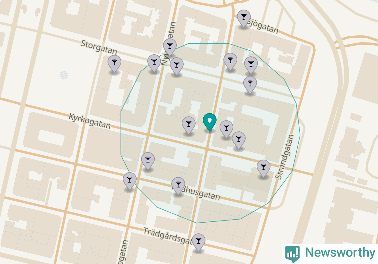 Tätast ligger förstås barerna ofta centralt i större städer. Den plats i Västernorrland där de ligger tätast ligger i Sundsvalls kommun: Om du står på Tullgatan har du tolv krogar, restauranger eller hotell med serveringstillstånd inom en radie på 100 meter.