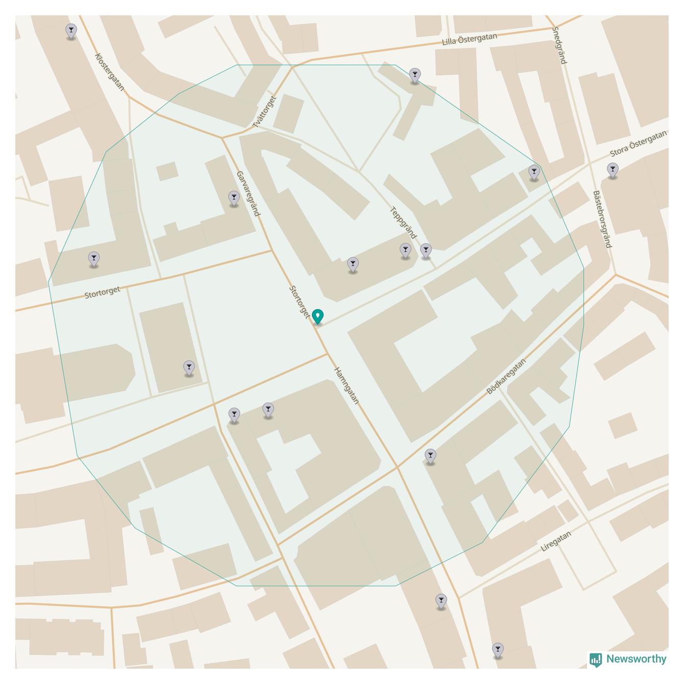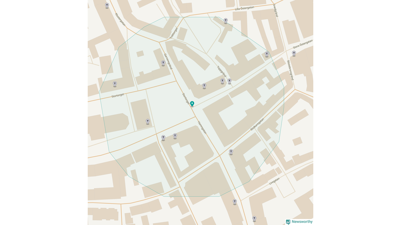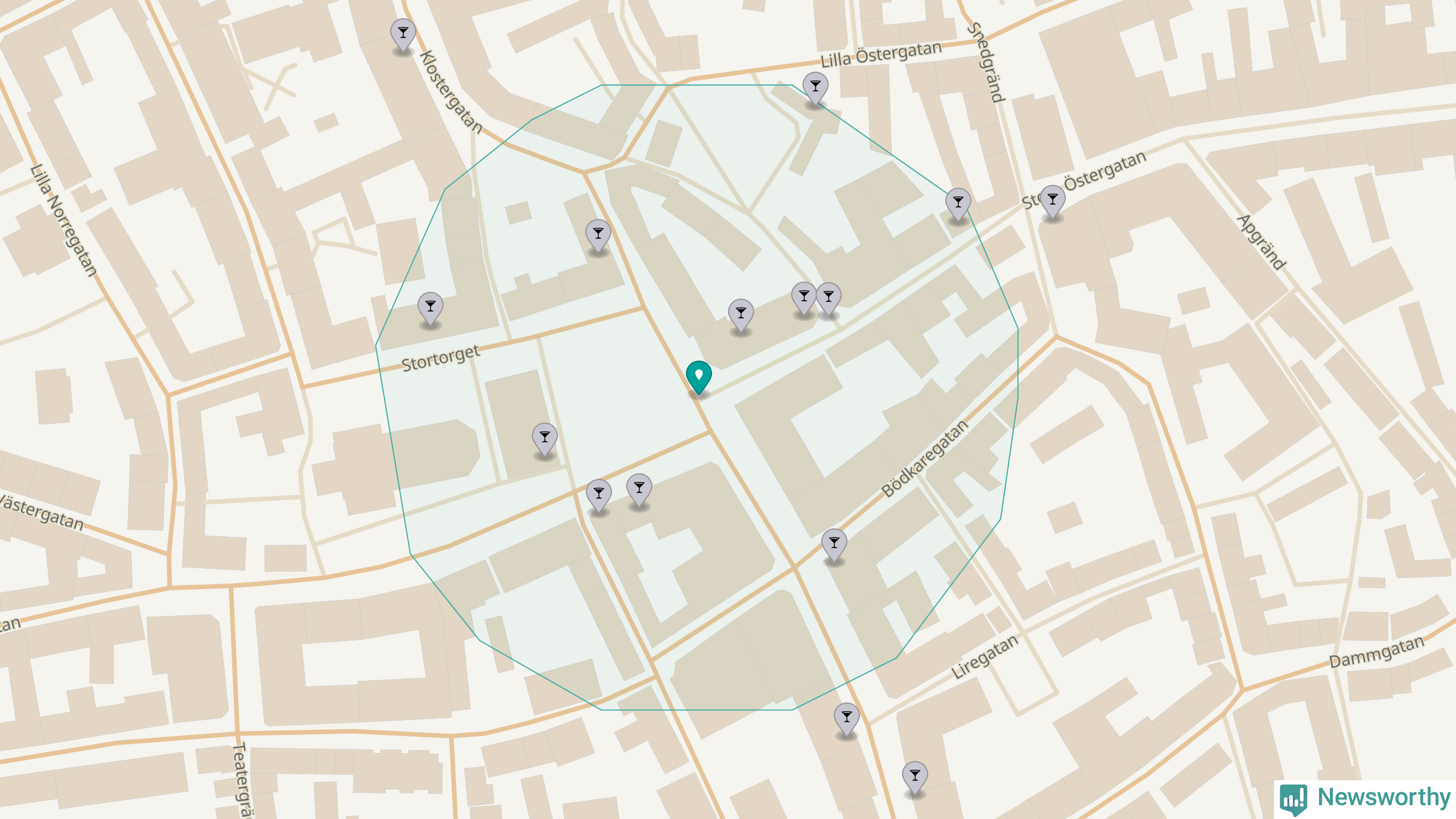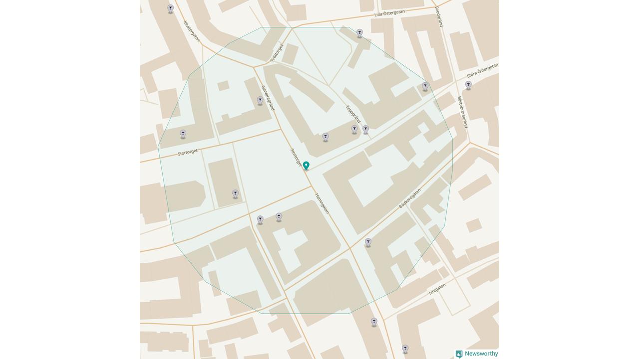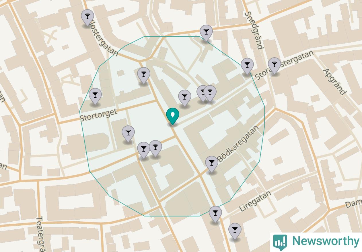 Om du står på Stortorget har du sisådär elva krogar, restauranger eller hotell med serveringstillstånd inom en radie på 100 meter. Det är den krogtätaste platsen i Ystads kommun.