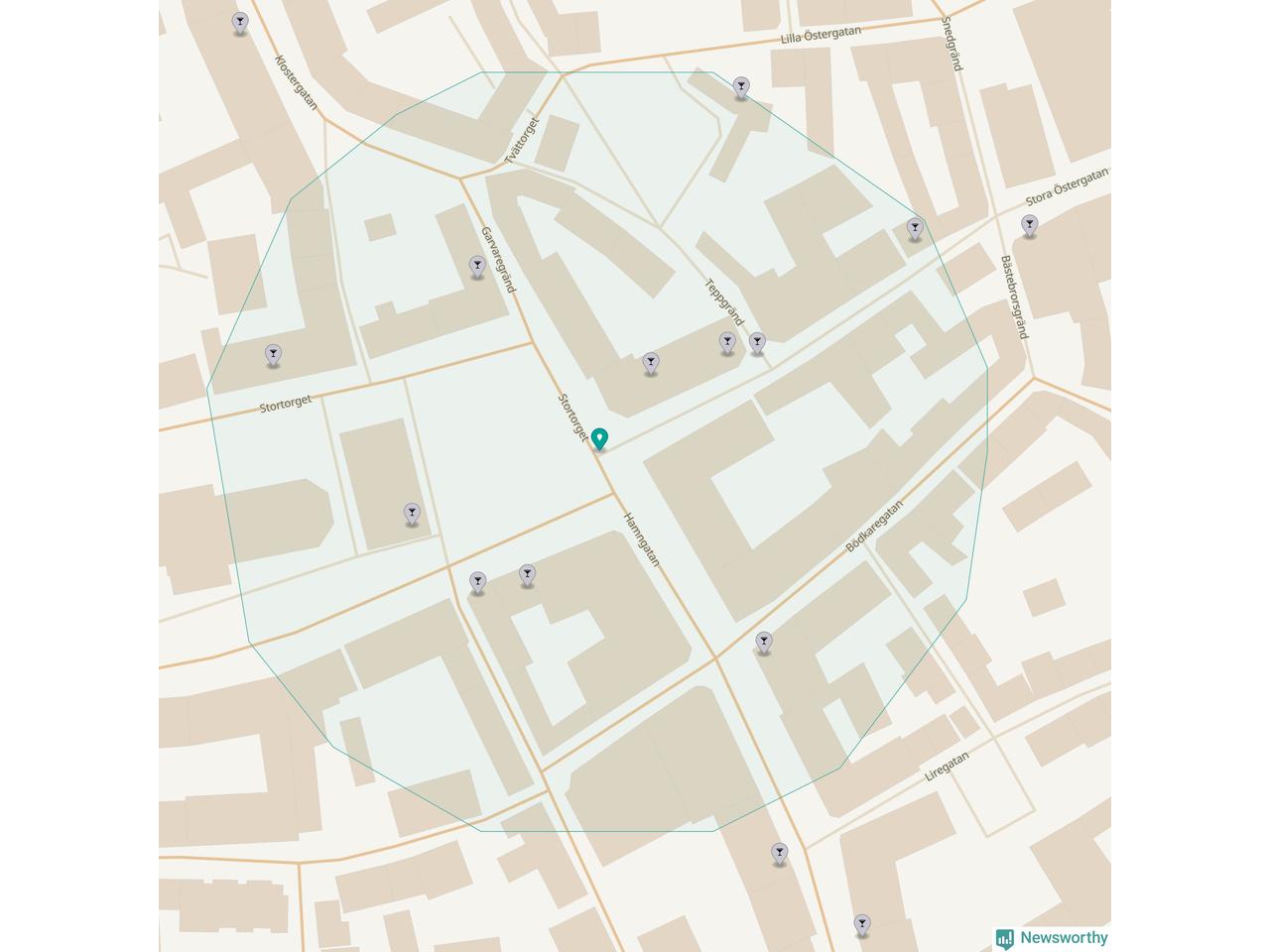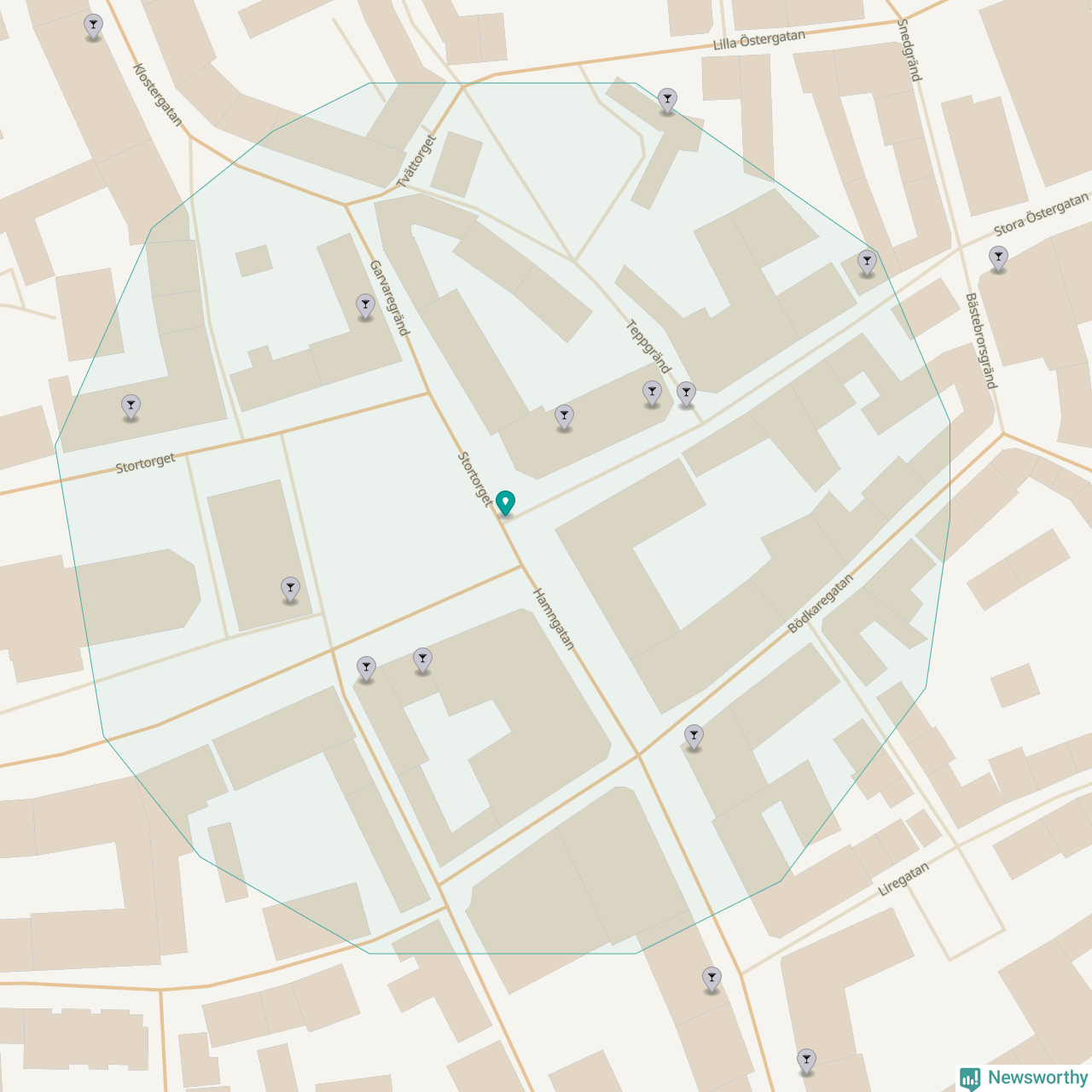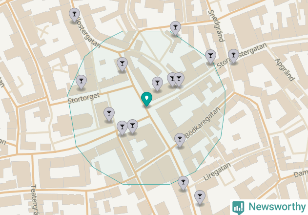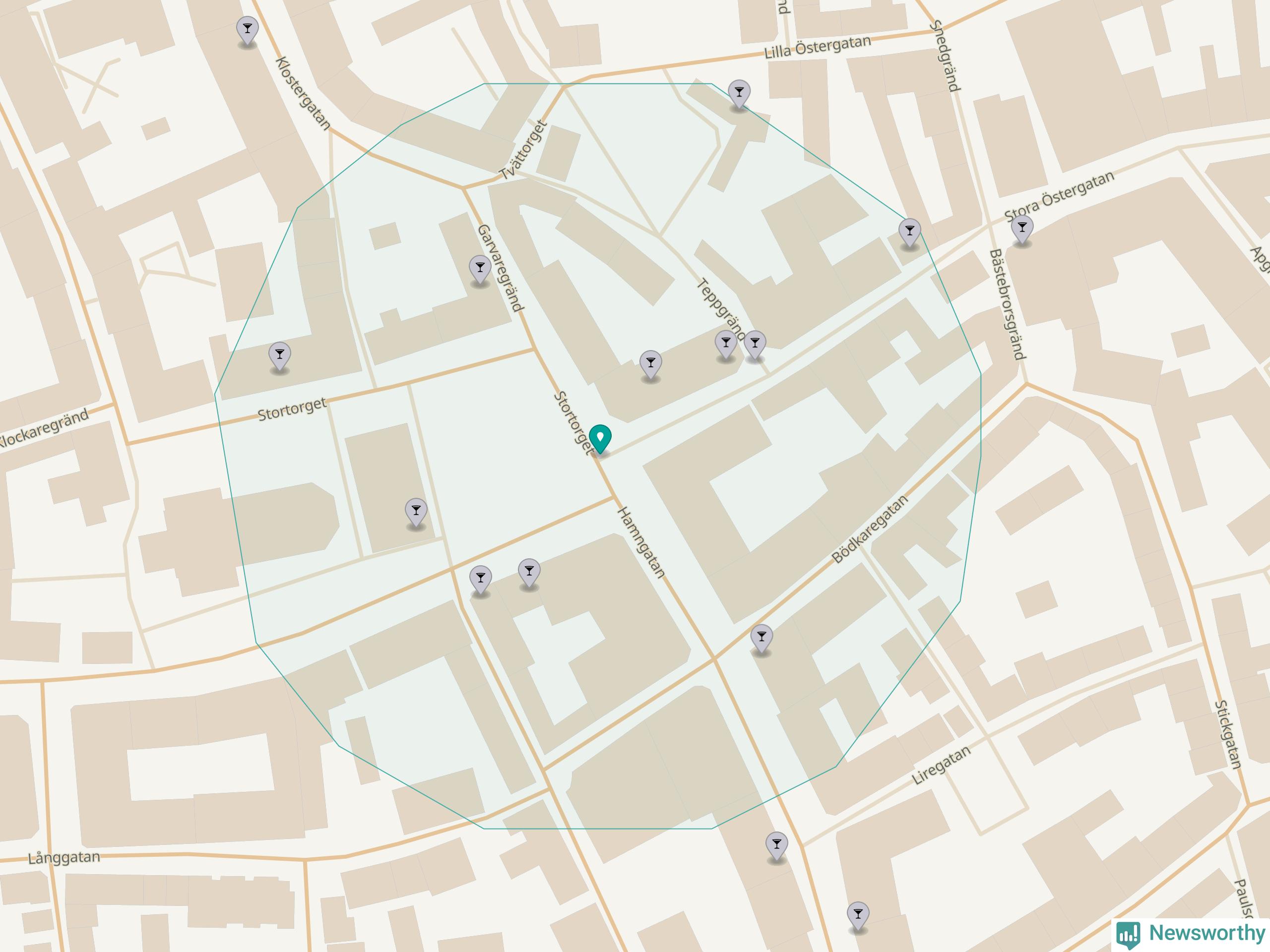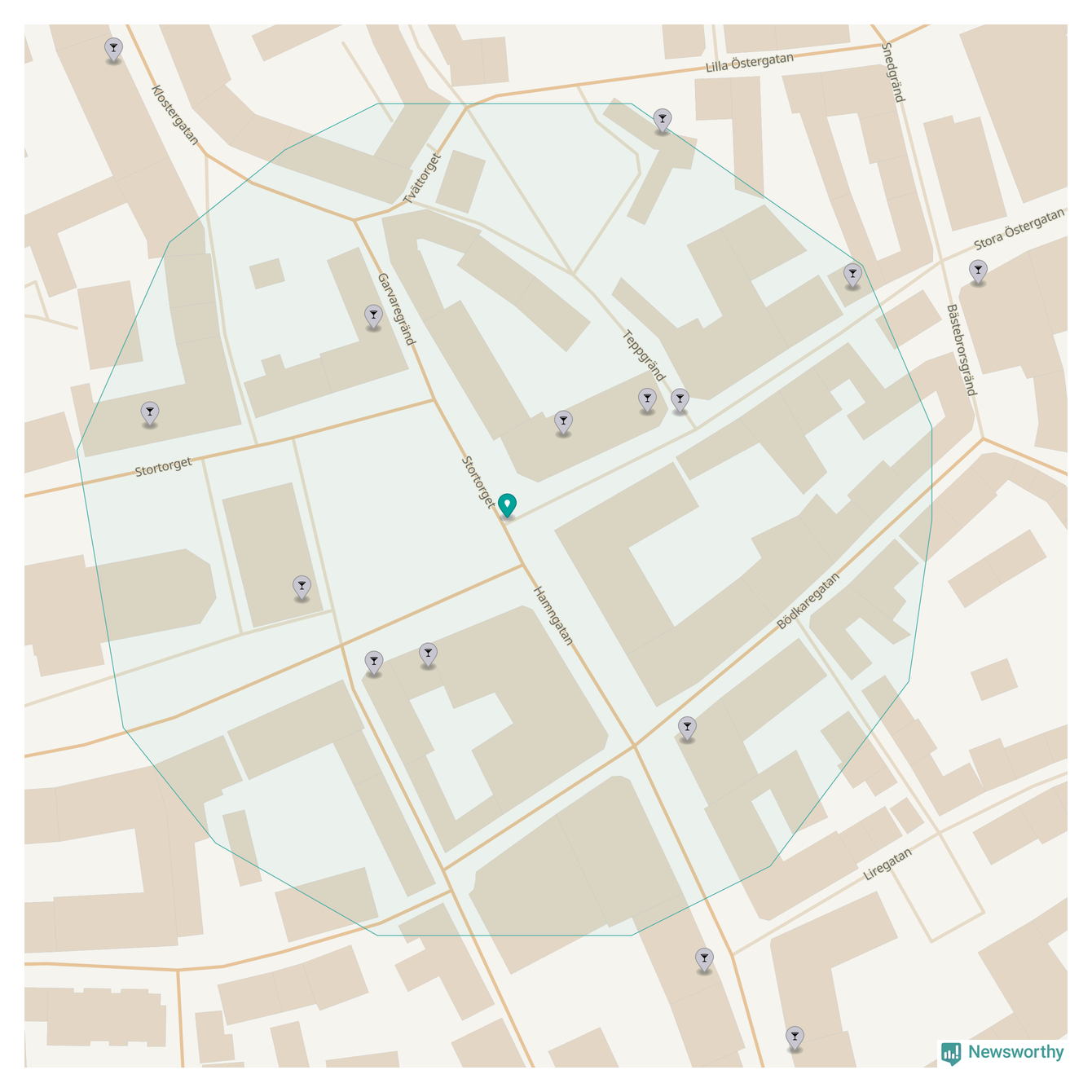 Om du står på Stortorget har du sisådär elva krogar, restauranger eller hotell med serveringstillstånd inom en radie på 100 meter. Det är den krogtätaste platsen i Ystads kommun.