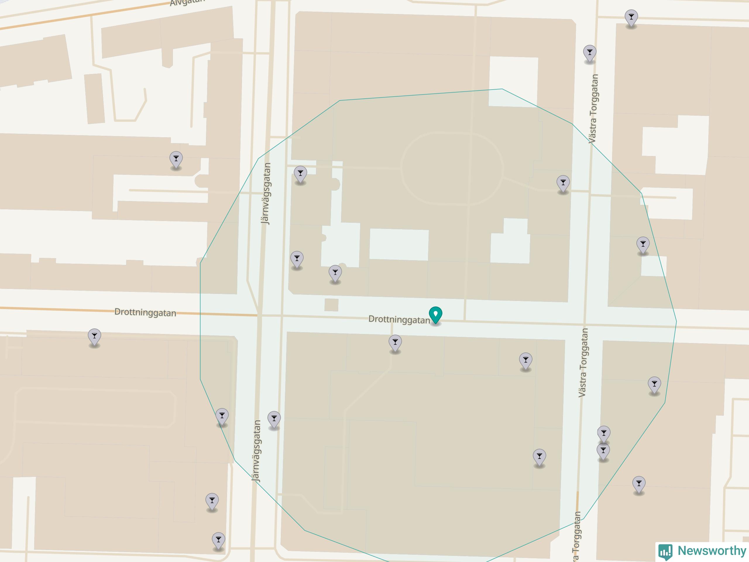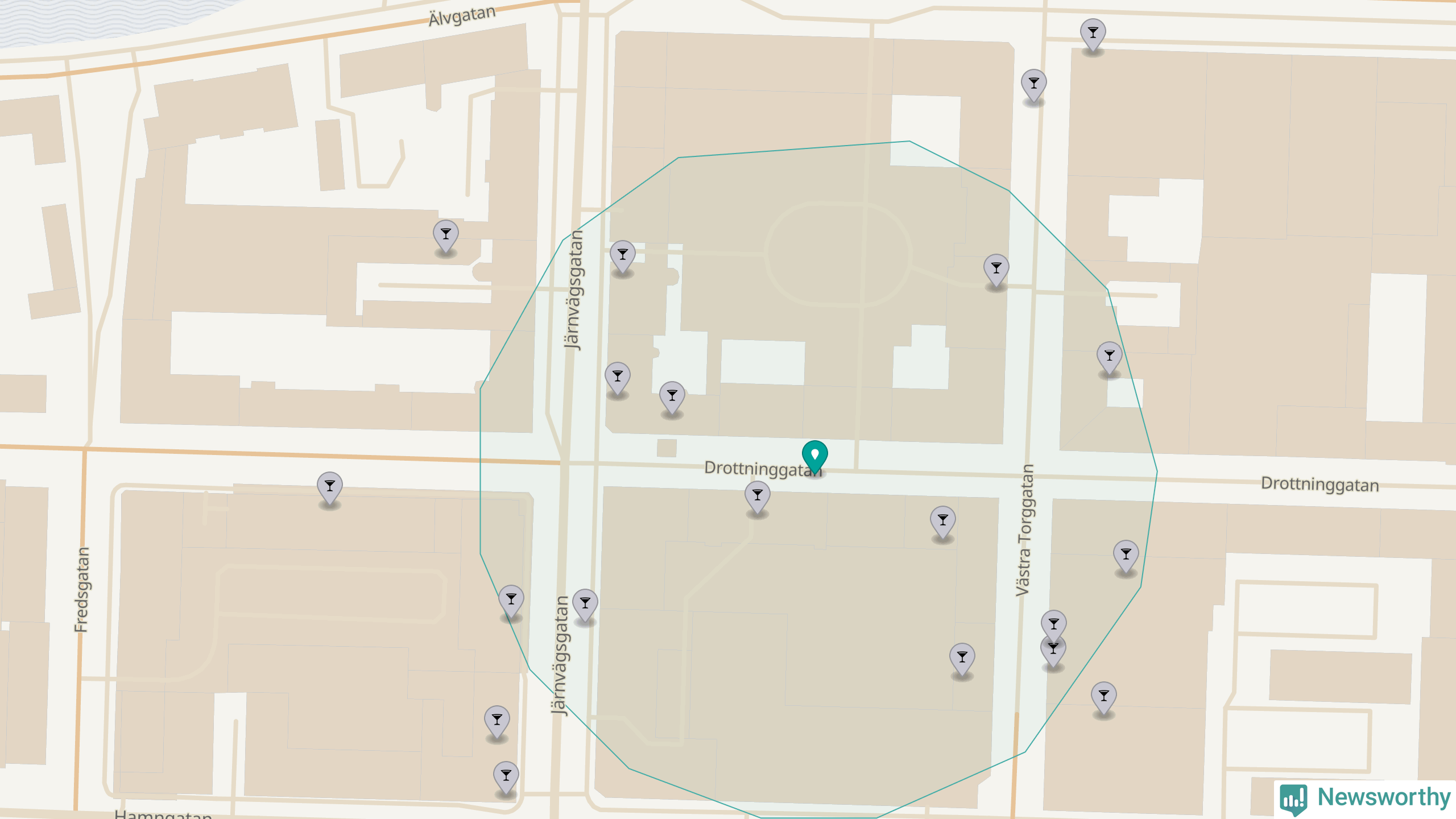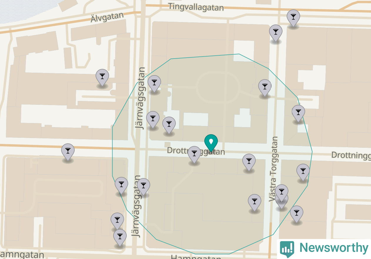 Om du står på Drottninggatan har du sisådär 13 krogar, restauranger eller hotell med serveringstillstånd inom en radie på 100 meter. Det är den krogtätaste platsen i Karlstads kommun och den krogtätaste platsen i Värmland.