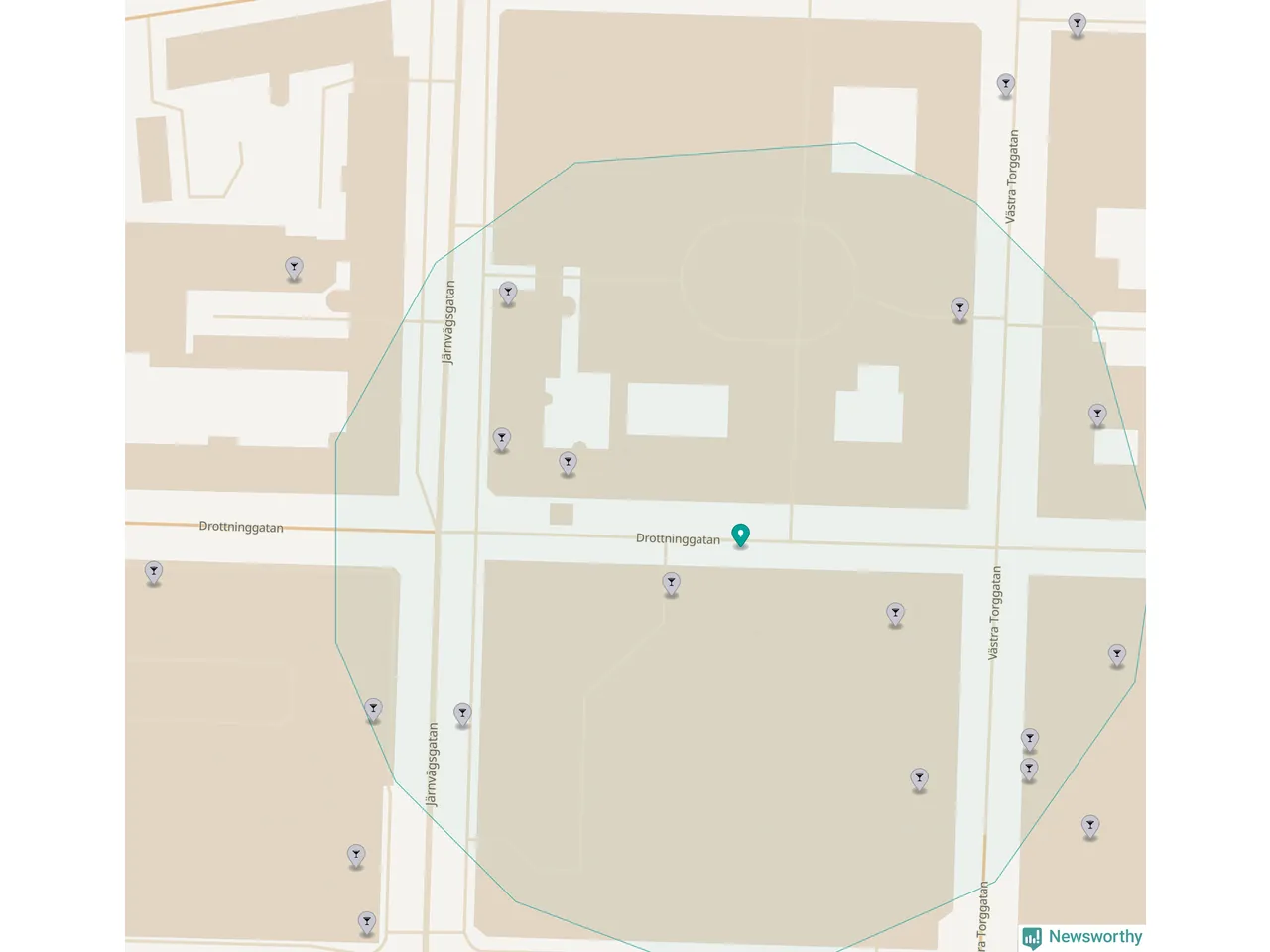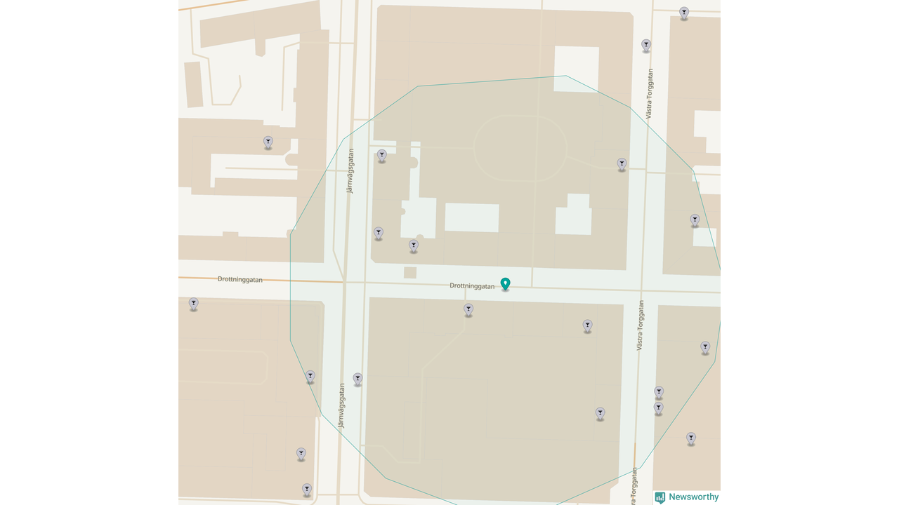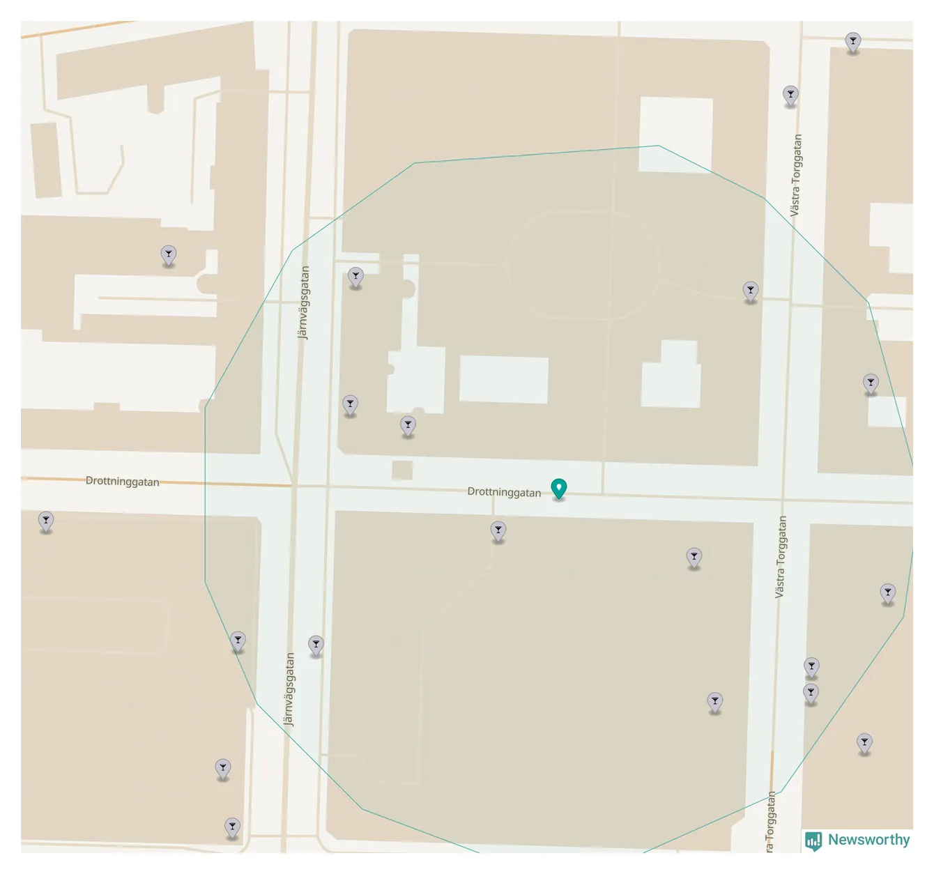 Om du står på Drottninggatan har du sisådär 13 krogar, restauranger eller hotell med serveringstillstånd inom en radie på 100 meter. Det är den krogtätaste platsen i Karlstads kommun och den krogtätaste platsen i Värmland.