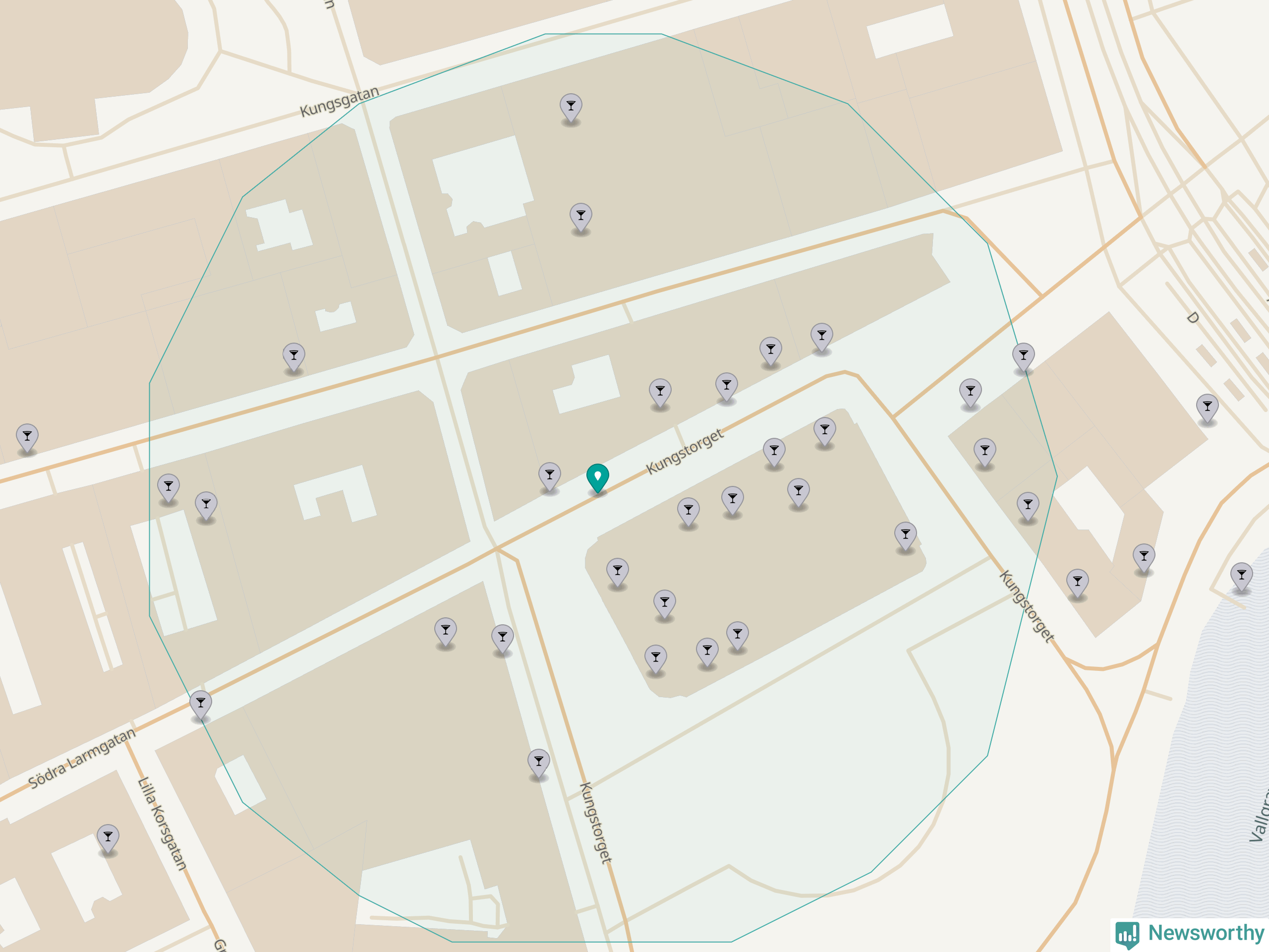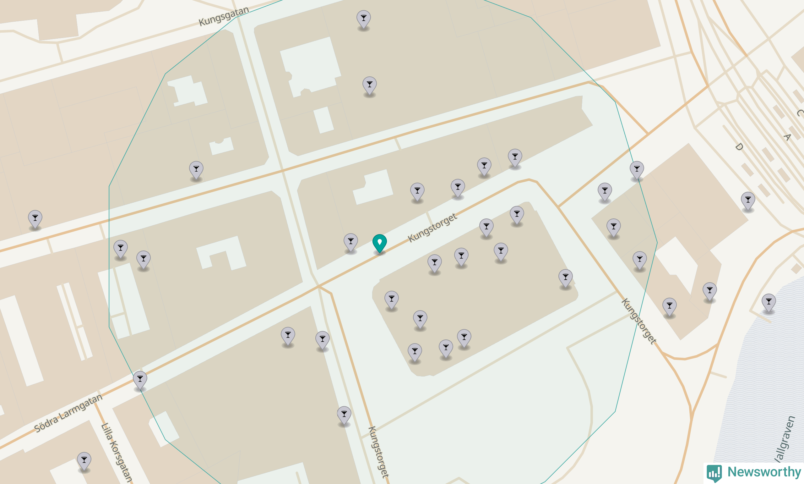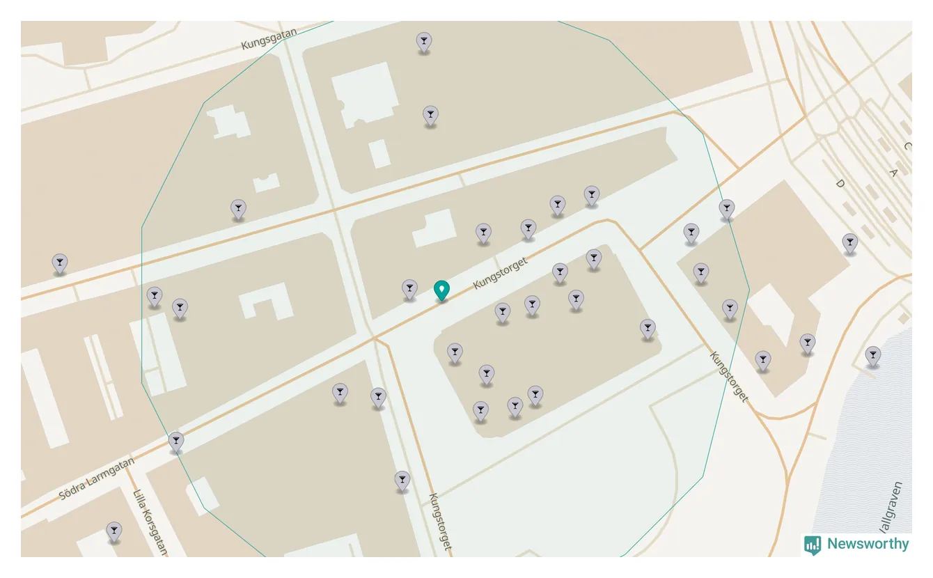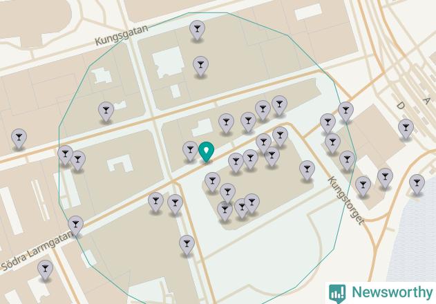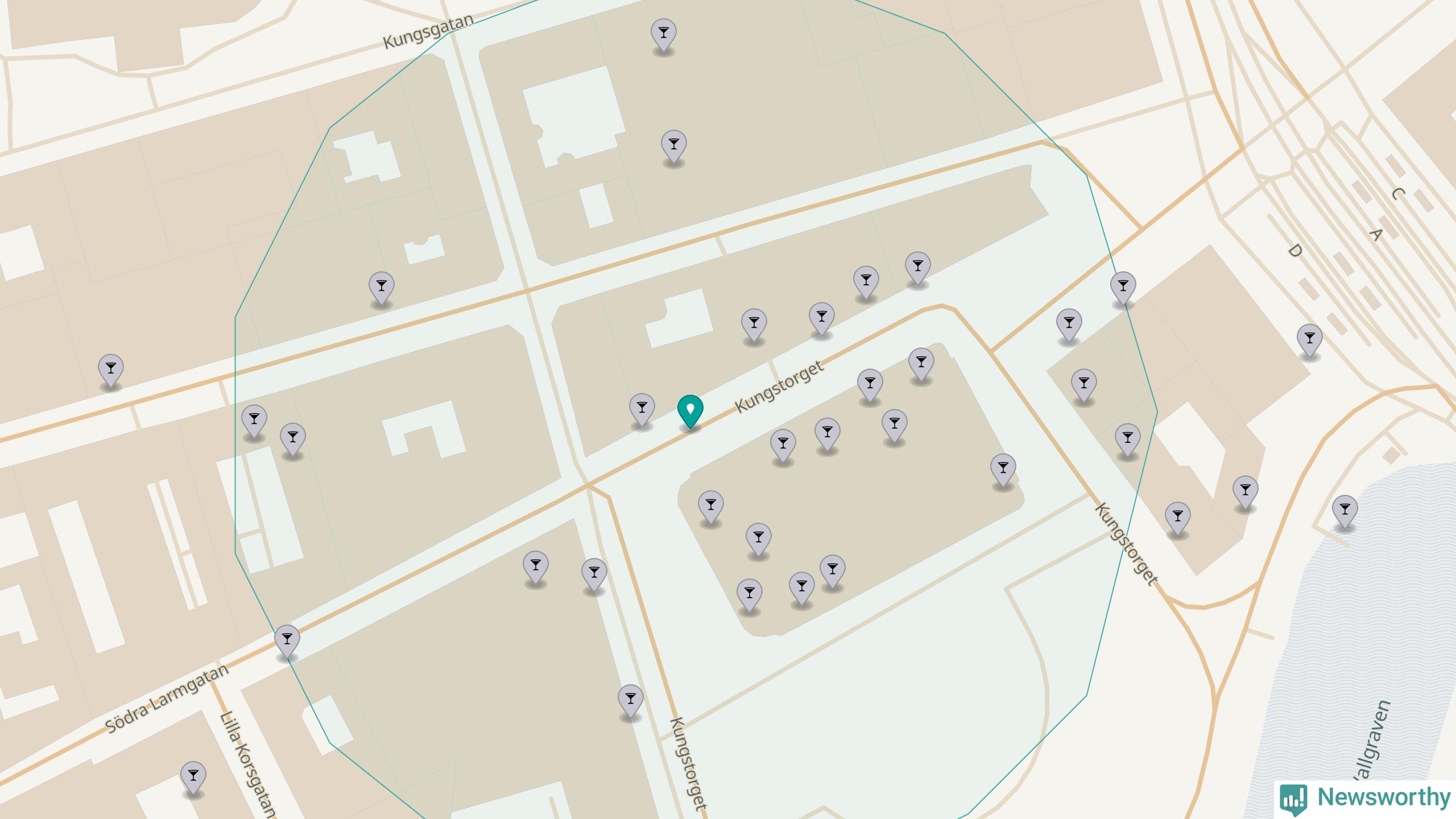 Tätast ligger förstås barerna ofta centralt i större städer. Den plats i Västra Götaland där de ligger tätast ligger i Göteborgs kommun: Om du står på Kungstorget har du 29 krogar, restauranger eller hotell med serveringstillstånd inom en radie på 100 meter.