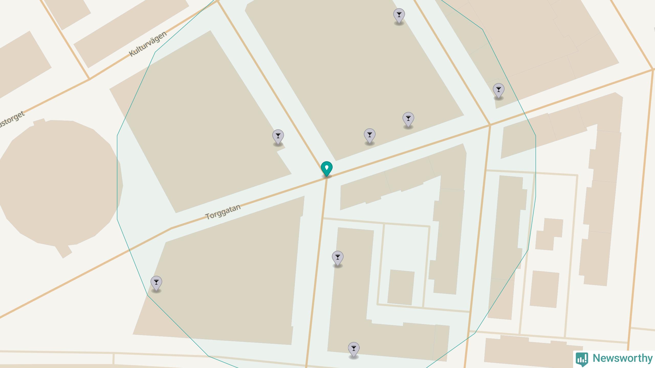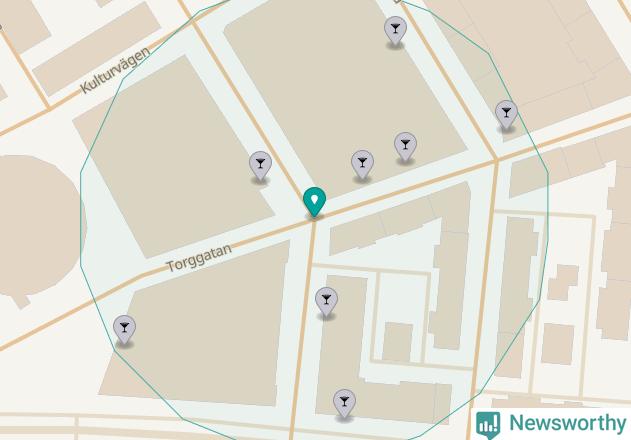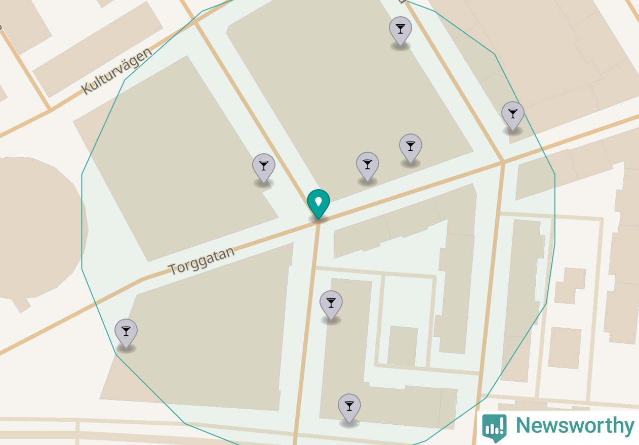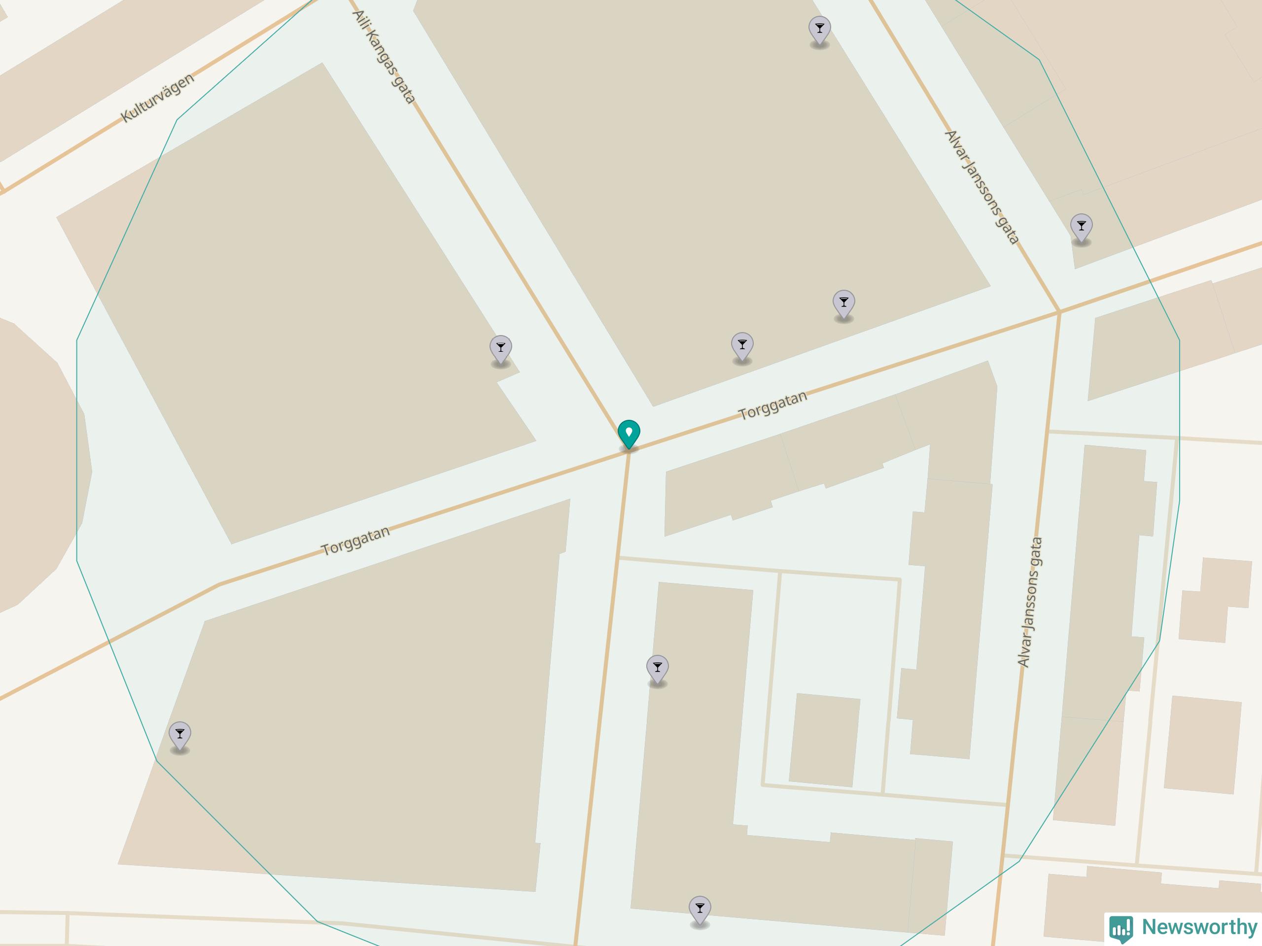 Om du står i hörnet Torggatan och Aili Kangas Gata har du åtta krogar, restauranger eller hotell med serveringstillstånd inom en radie på 100 meter. Det är den krogtätaste platsen i Kiruna kommun.