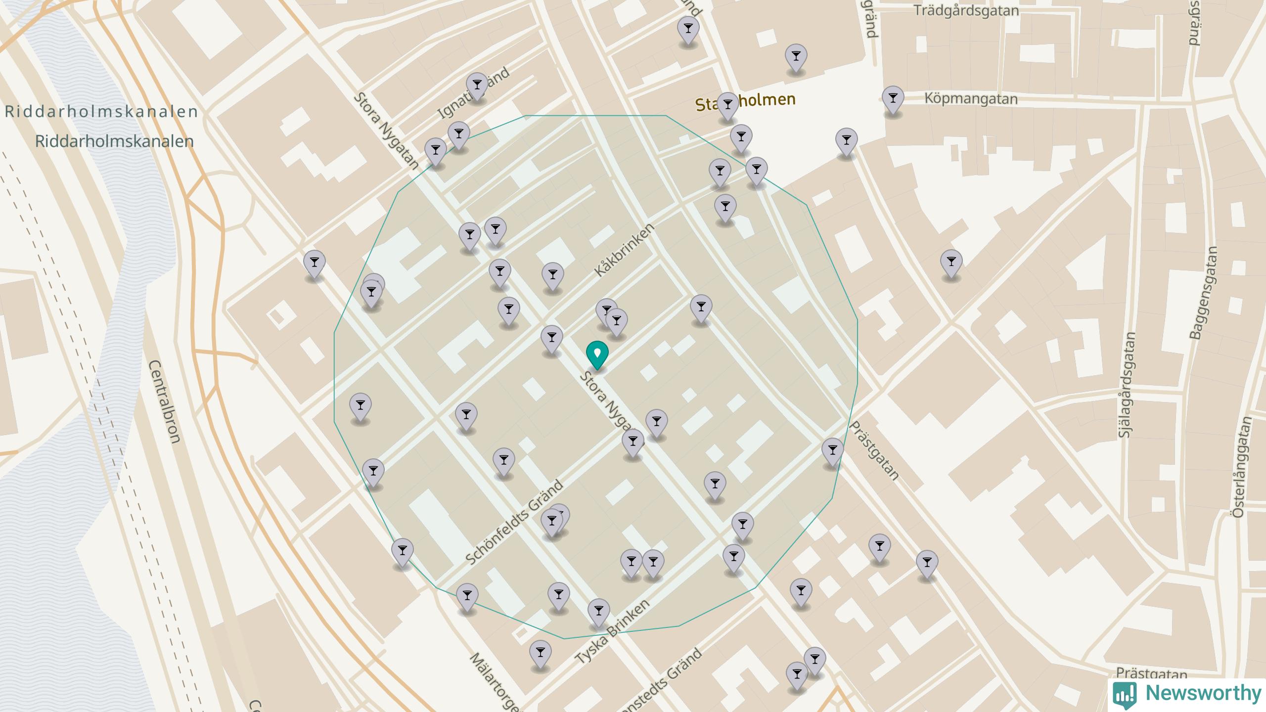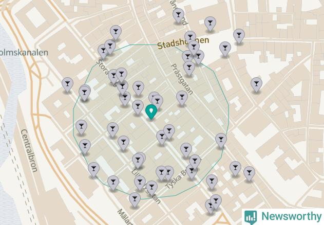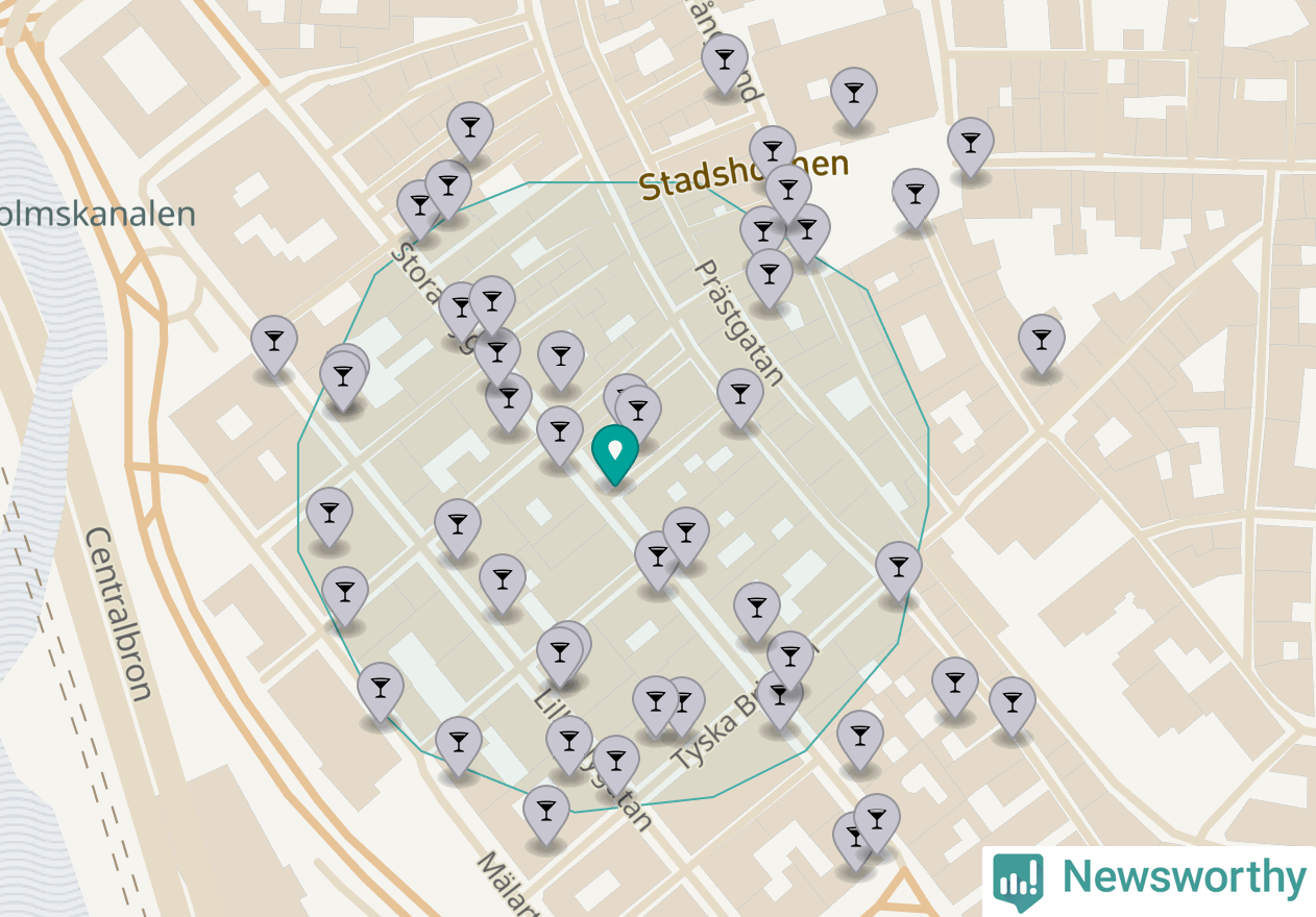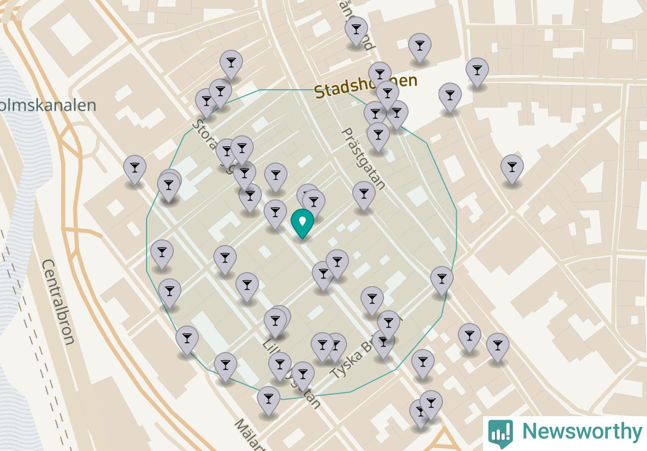 Tätast ligger förstås barerna ofta centralt i större städer. Den plats i Stockholms län där de ligger tätast ligger i Stockholms kommun: Om du står i hörnet Stora Nygatan och Skräddargränd har du 33 krogar, restauranger eller hotell med serveringstillstånd inom en radie på 100 meter.