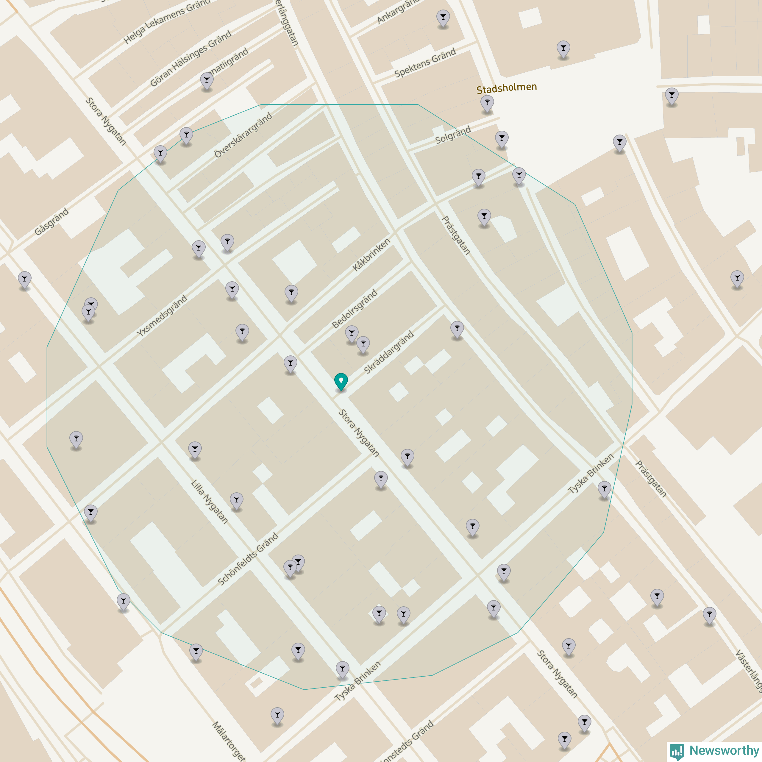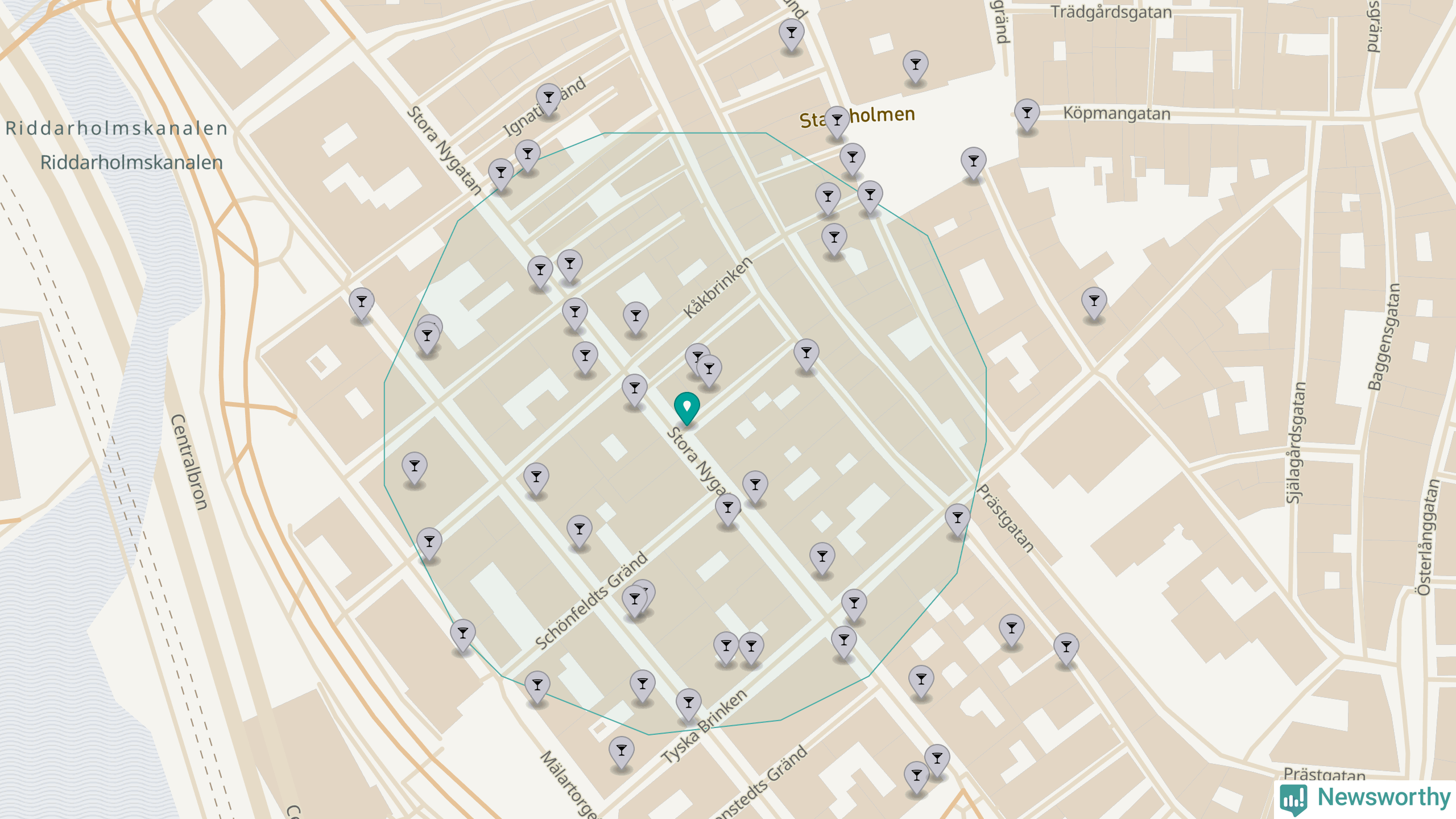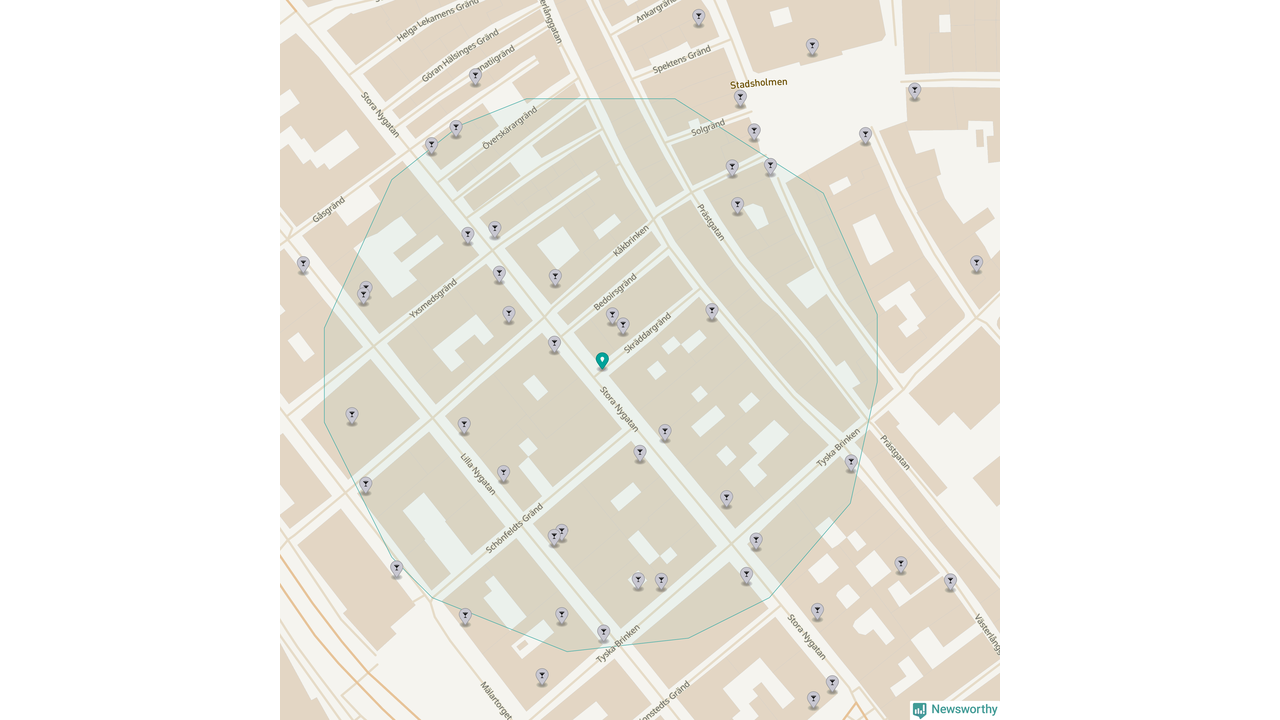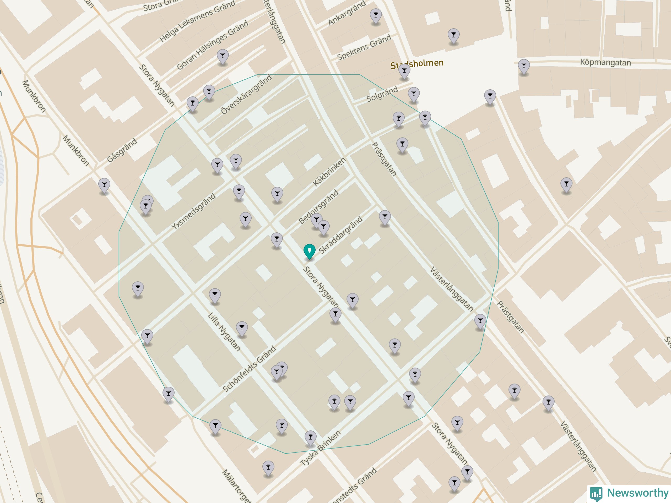 Tätast ligger förstås barerna ofta centralt i större städer. Den plats i Stockholms län där de ligger tätast ligger i Stockholms kommun: Om du står i hörnet Stora Nygatan och Skräddargränd har du 33 krogar, restauranger eller hotell med serveringstillstånd inom en radie på 100 meter.