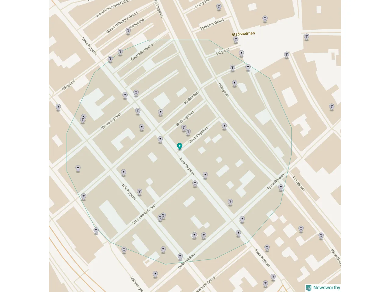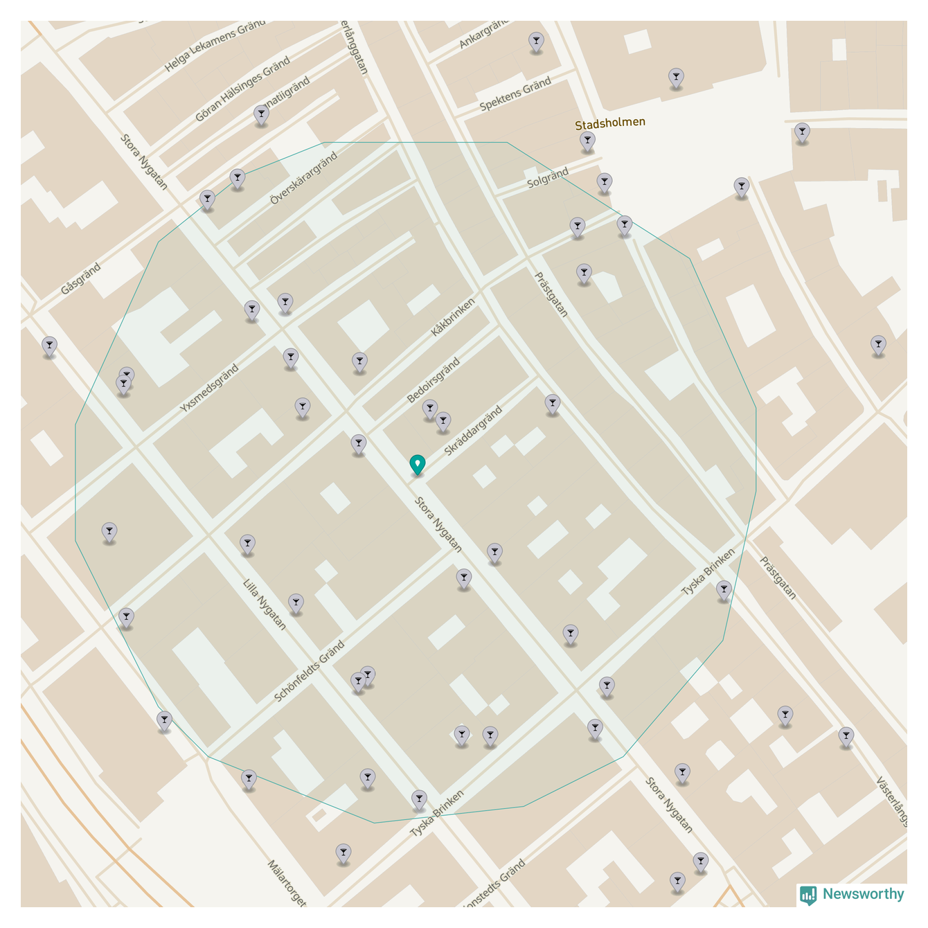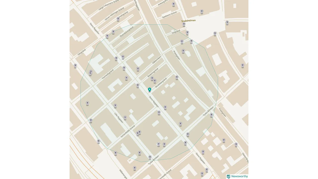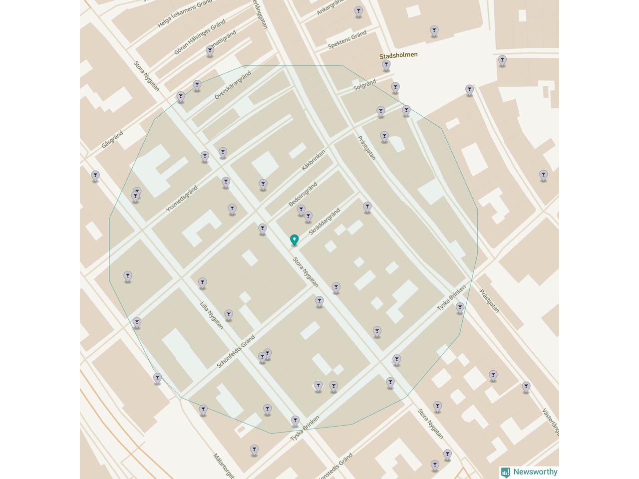 Tätast ligger förstås barerna ofta centralt i större städer. Den plats i Stockholms län där de ligger tätast ligger i Stockholms kommun: Om du står i hörnet Stora Nygatan och Skräddargränd har du 33 krogar, restauranger eller hotell med serveringstillstånd inom en radie på 100 meter.
