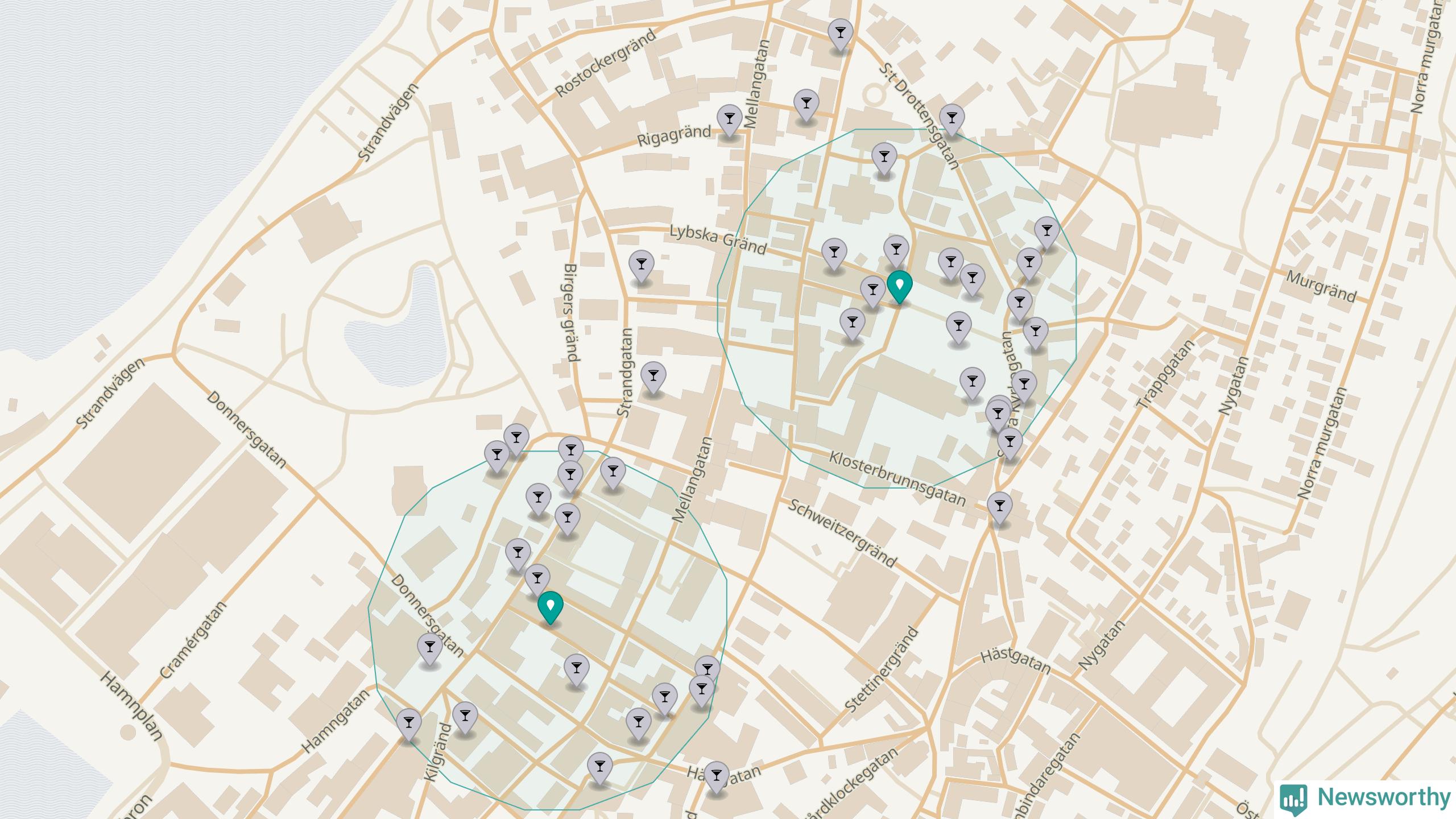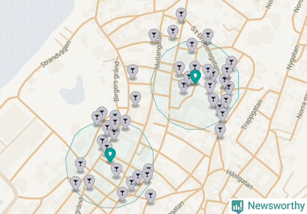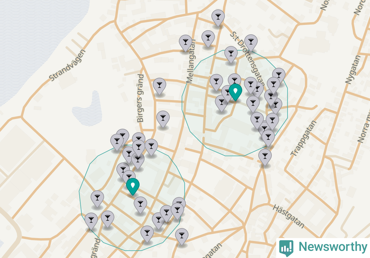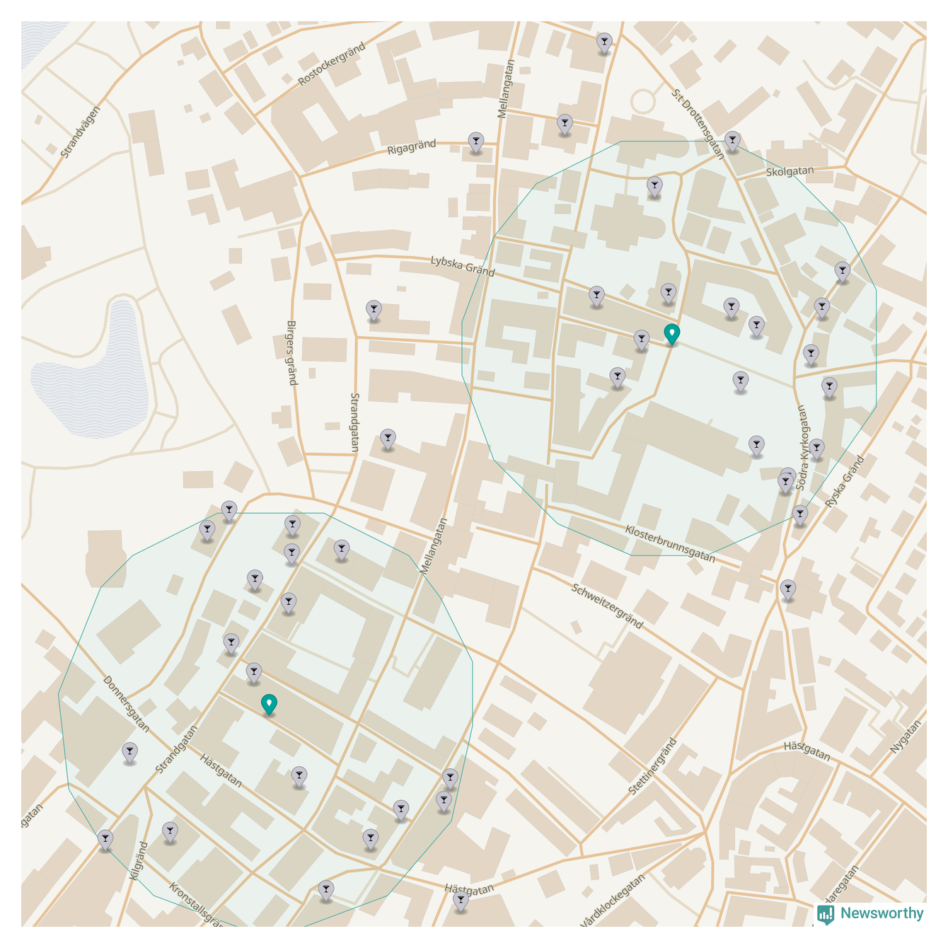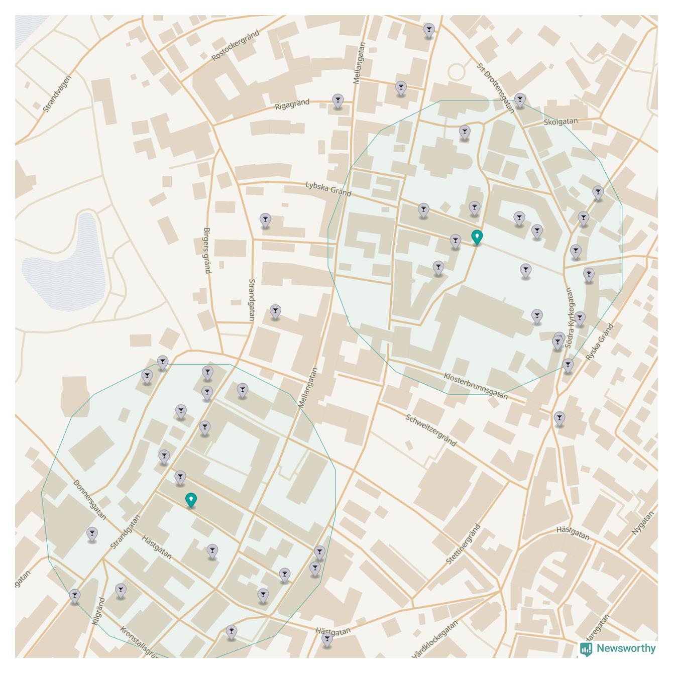 Om du står på Stora Torget i Visby eller på Novgorodgränd i Visby har du 17 krogar, restauranger eller hotell med serveringstillstånd inom en radie på 100 meter. Det är de krogtätaste platserna på Gotland.