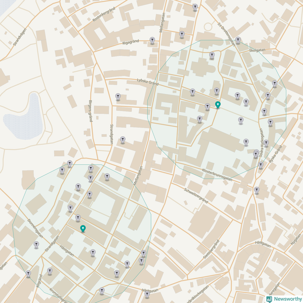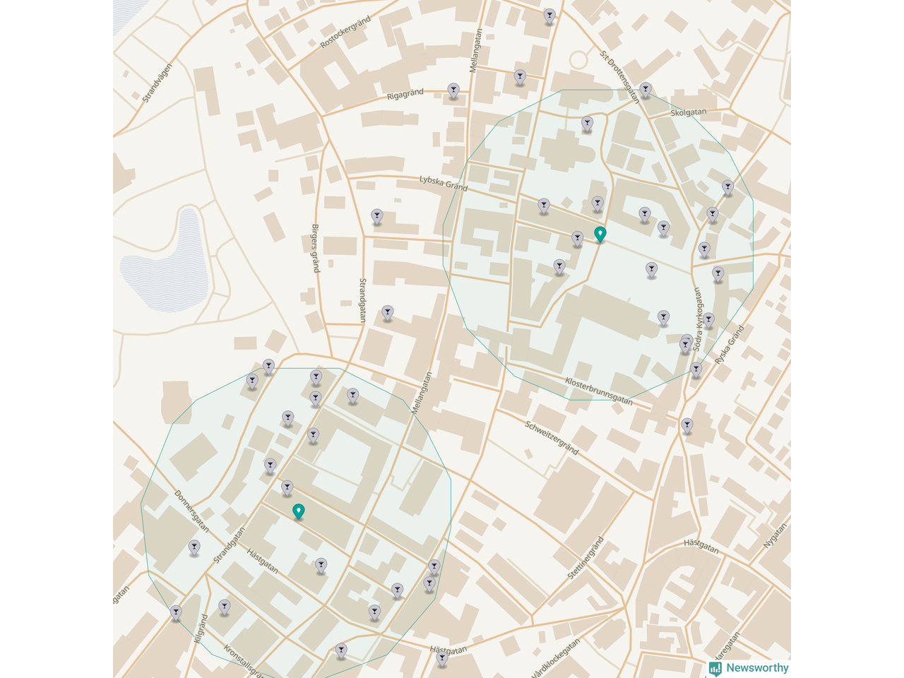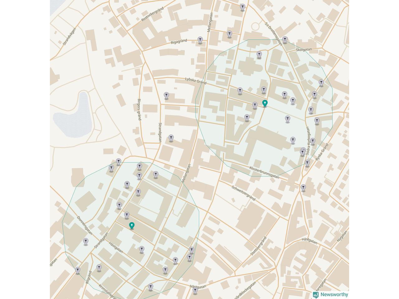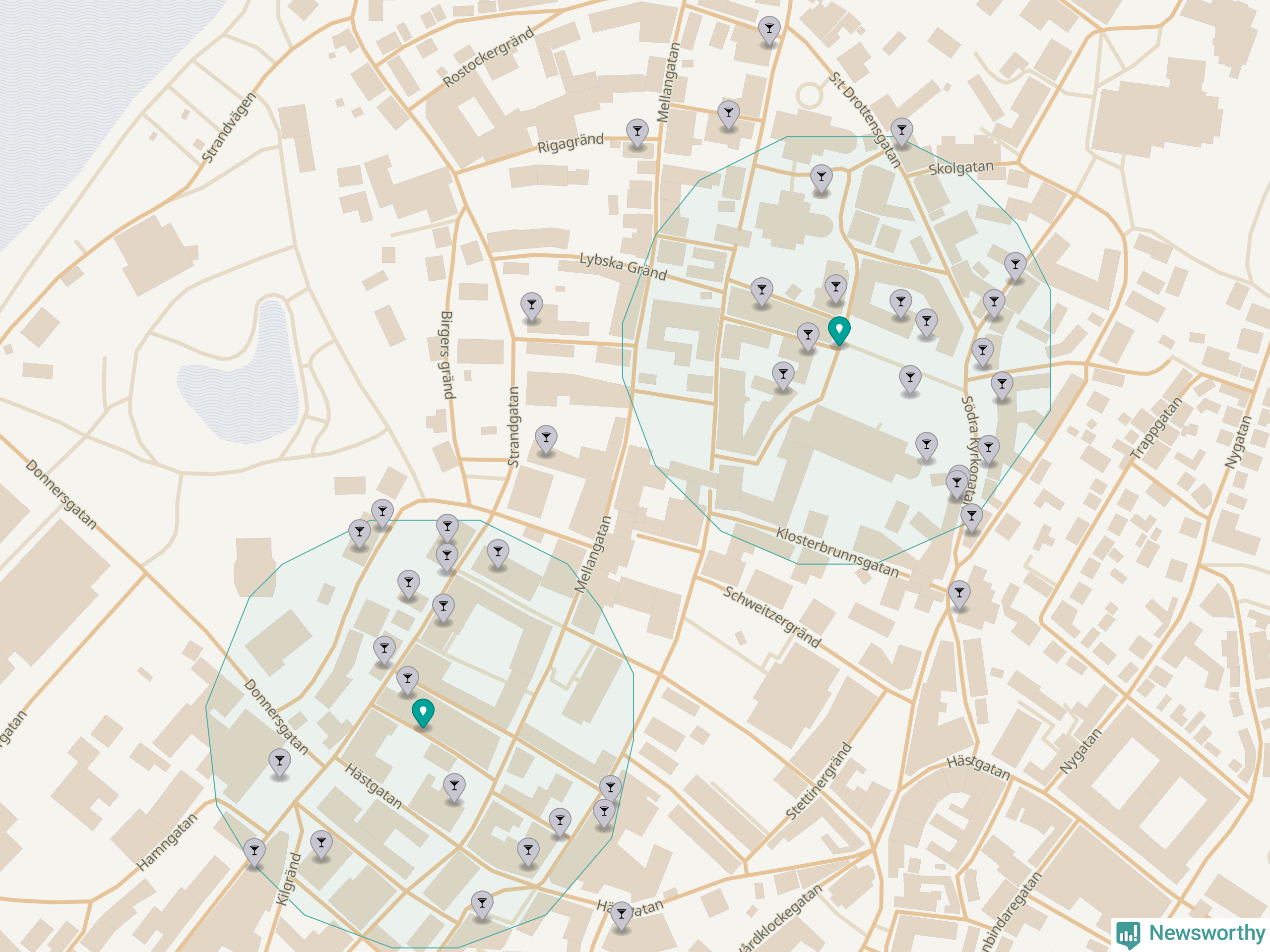 Om du står på Stora Torget i Visby eller på Novgorodgränd i Visby har du 17 krogar, restauranger eller hotell med serveringstillstånd inom en radie på 100 meter. Det är de krogtätaste platserna på Gotland.
