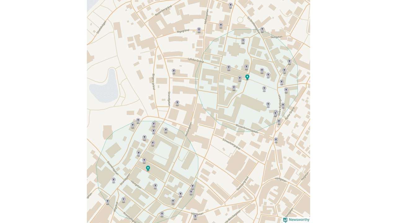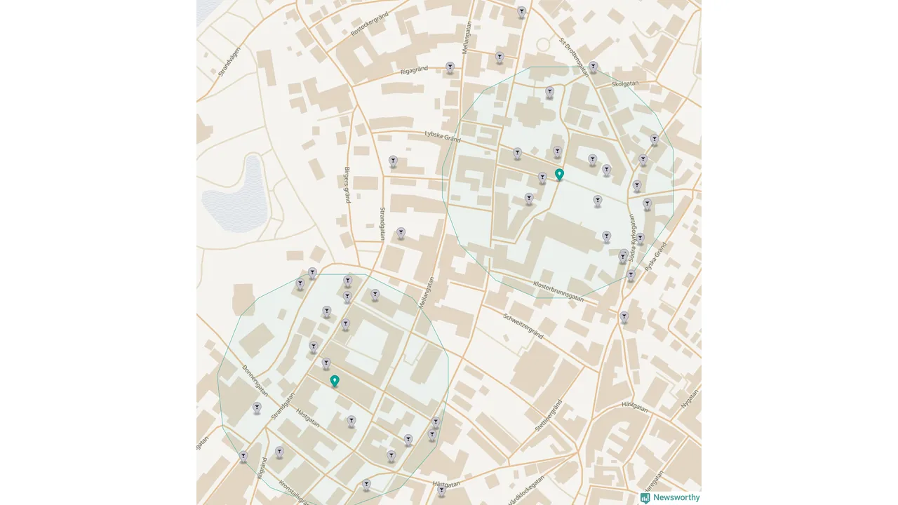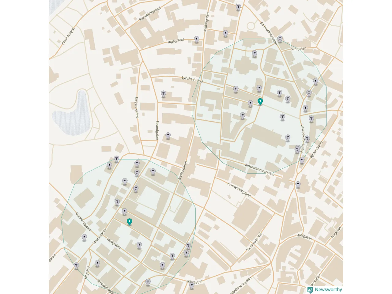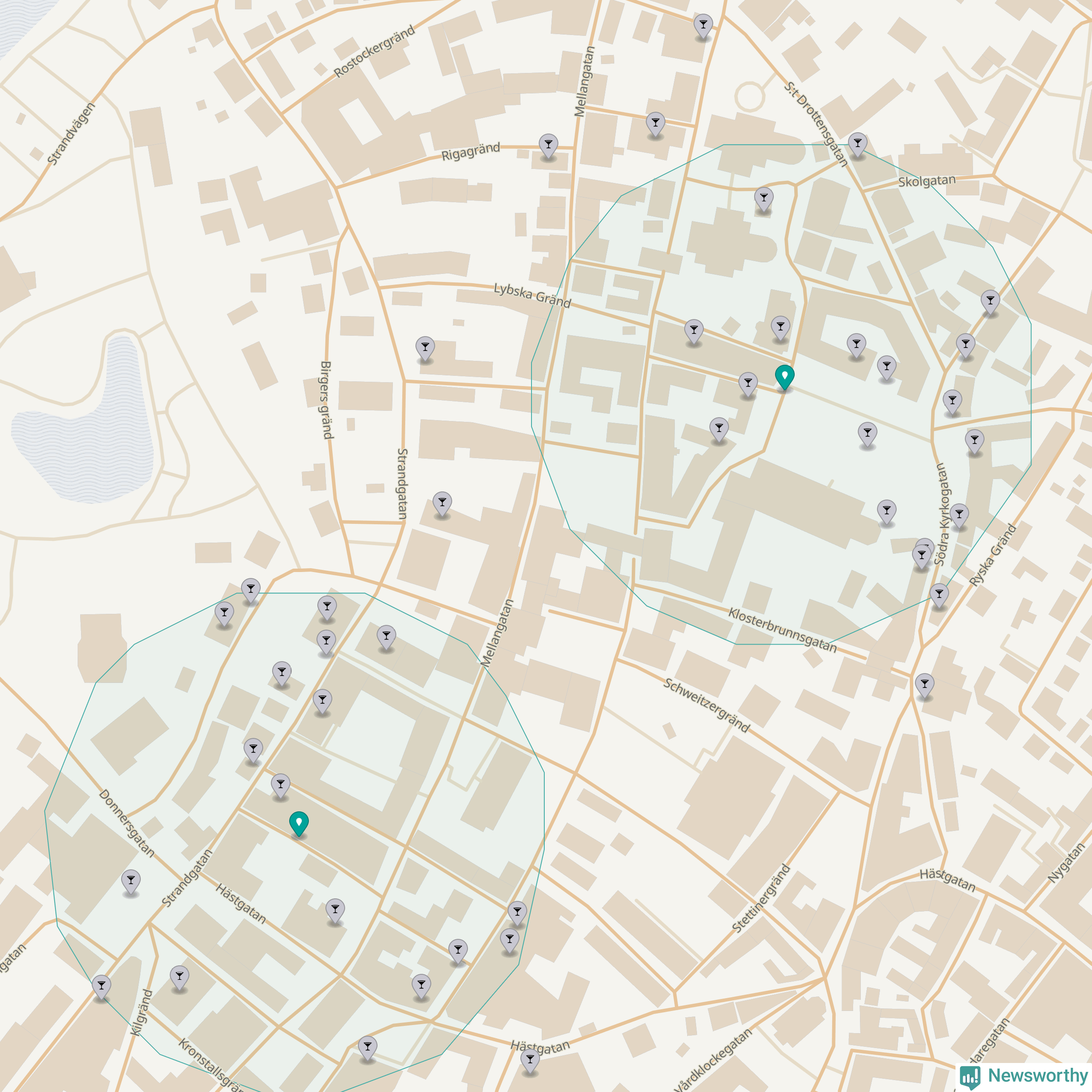 Om du står på Stora Torget i Visby eller på Novgorodgränd i Visby har du 17 krogar, restauranger eller hotell med serveringstillstånd inom en radie på 100 meter. Det är de krogtätaste platserna på Gotland.