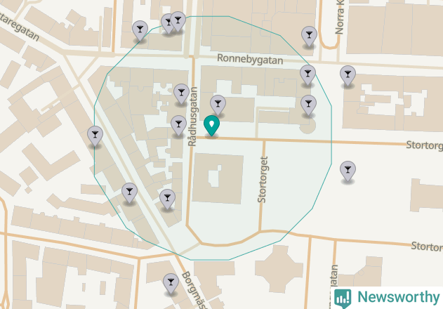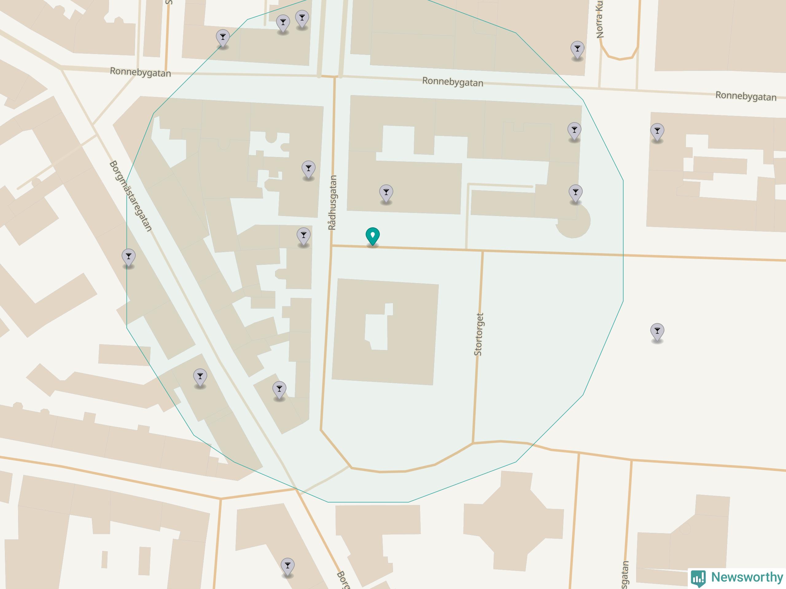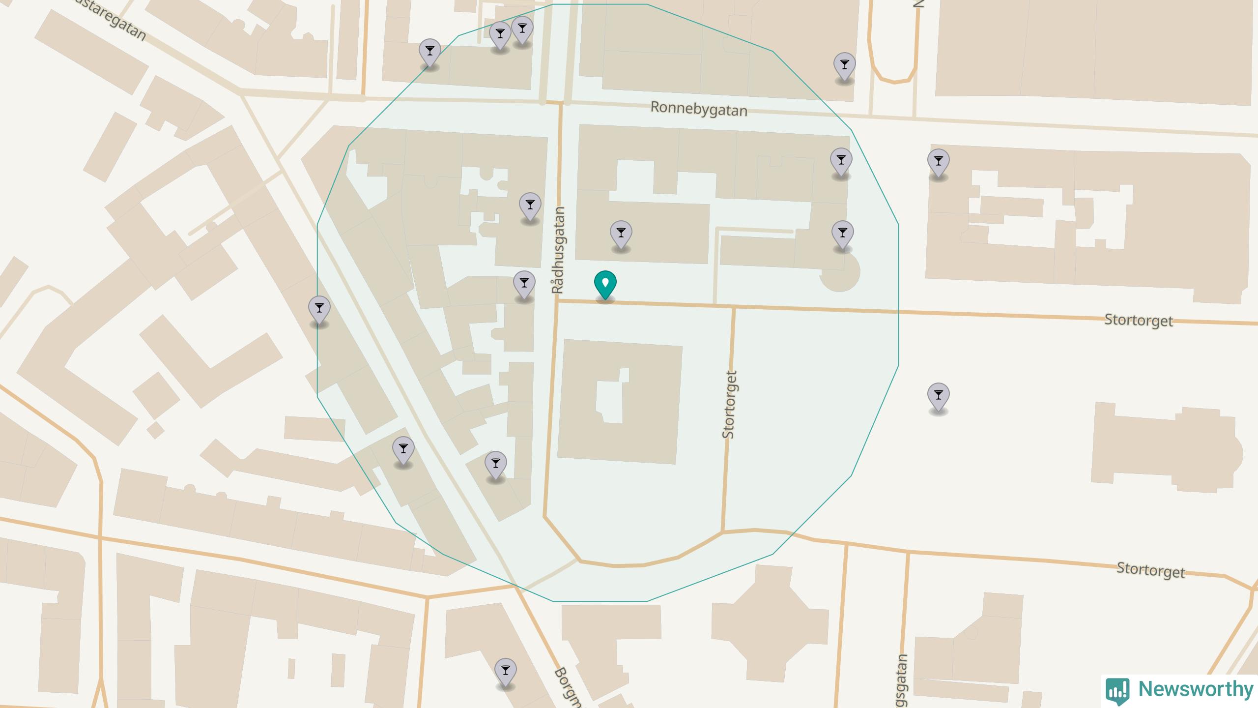 Tätast ligger förstås barerna ofta centralt i större städer. Den plats i Blekinge där de ligger tätast ligger i Karlskrona kommun: Om du står på Stortorget har du elva krogar, restauranger eller hotell med serveringstillstånd inom en radie på 100 meter.