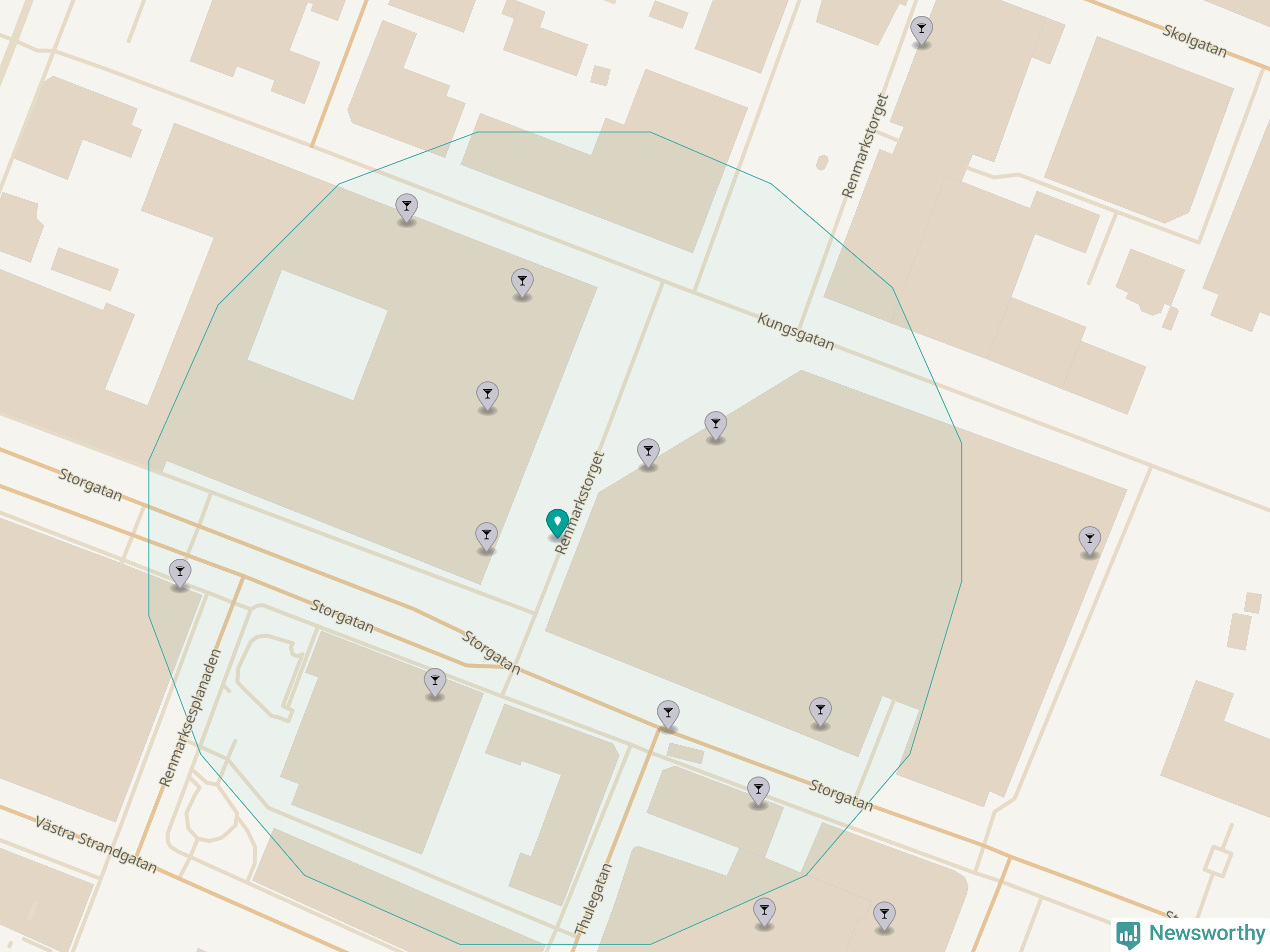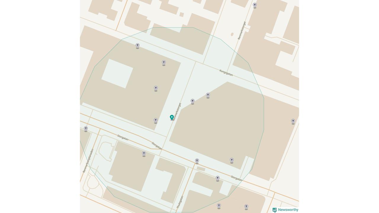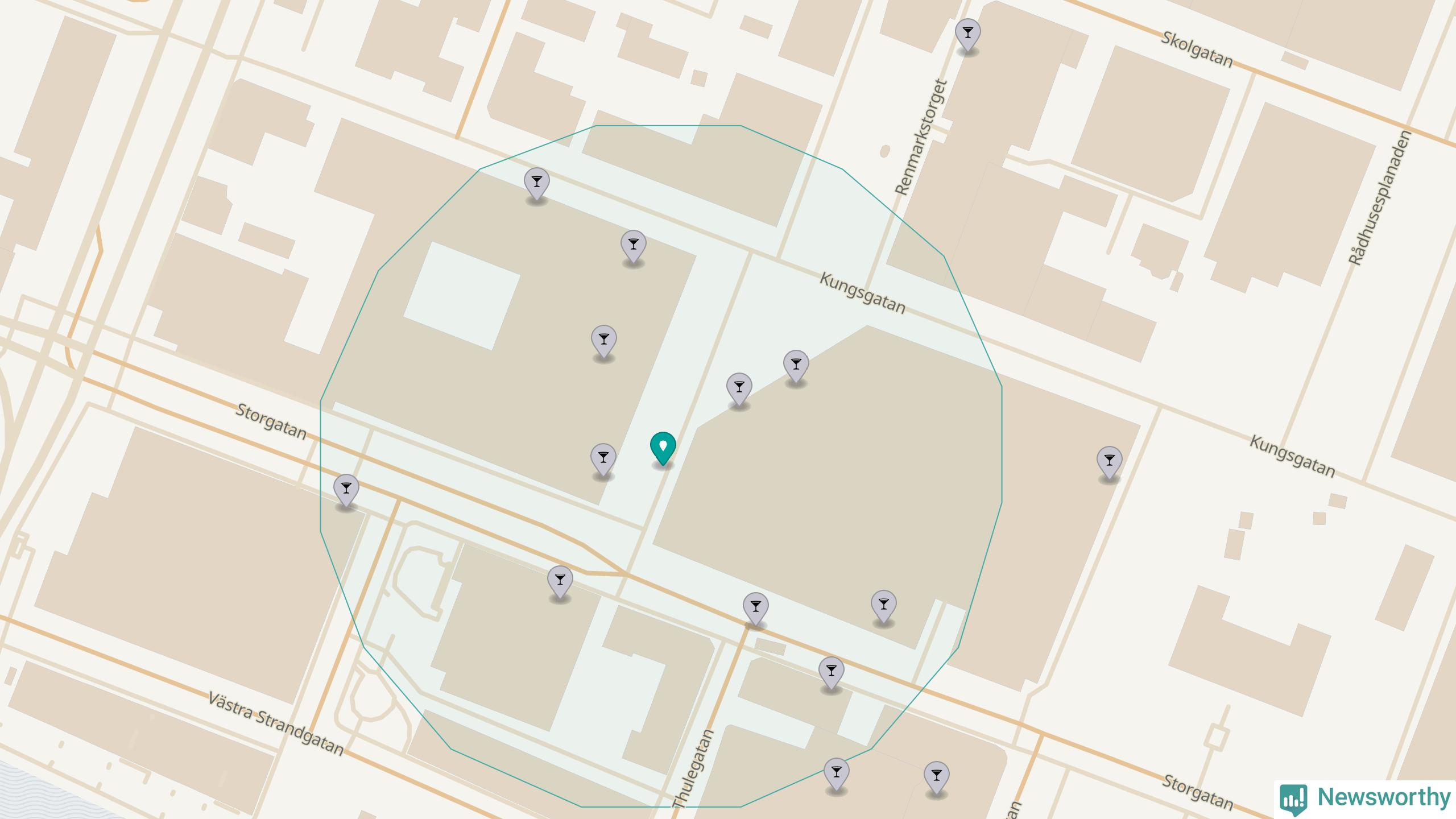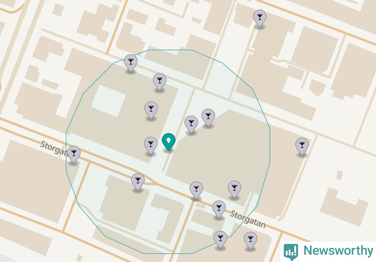Tätast ligger förstås barerna ofta centralt i större städer. De platser i Västerbotten där de ligger tätast ligger i Skellefteå kommun respektive Umeå kommun: Om du står på Guldtorget eller på Renmarkstorget har du elva krogar, restauranger eller hotell med serveringstillstånd inom en radie på 100 meter.