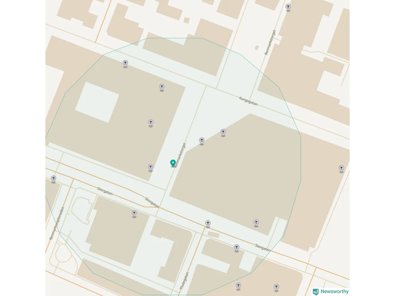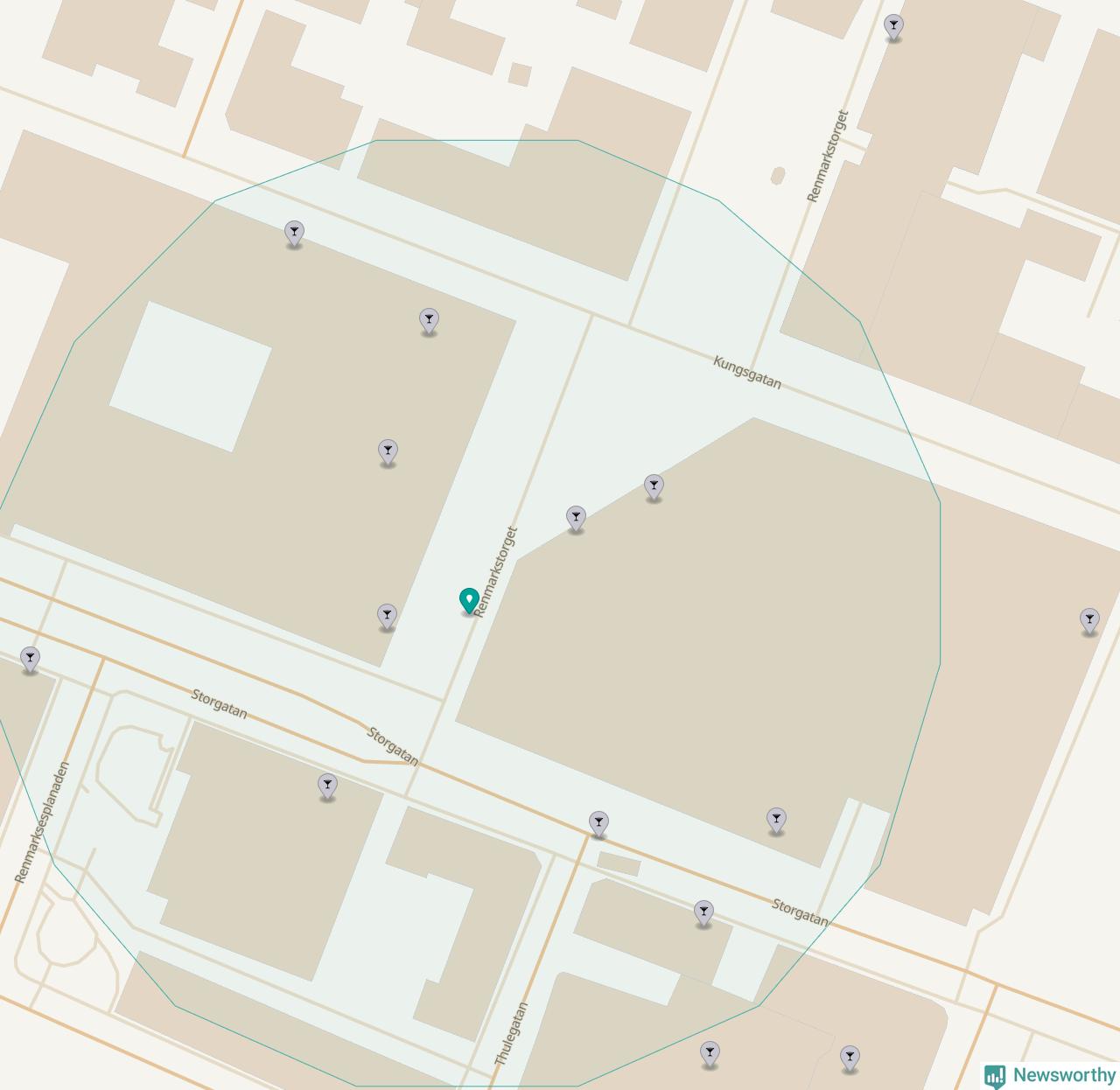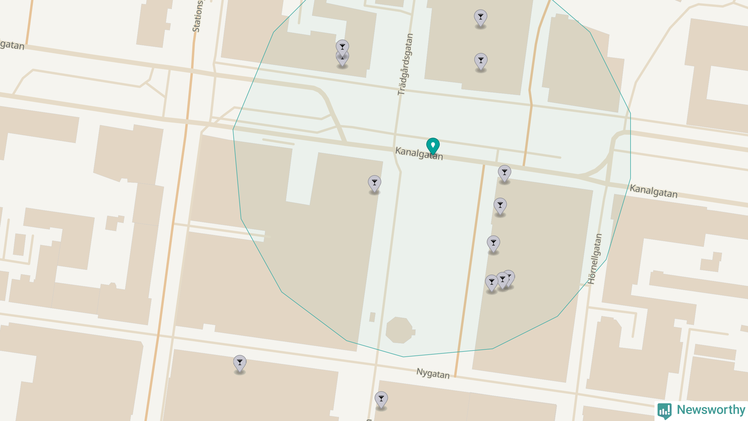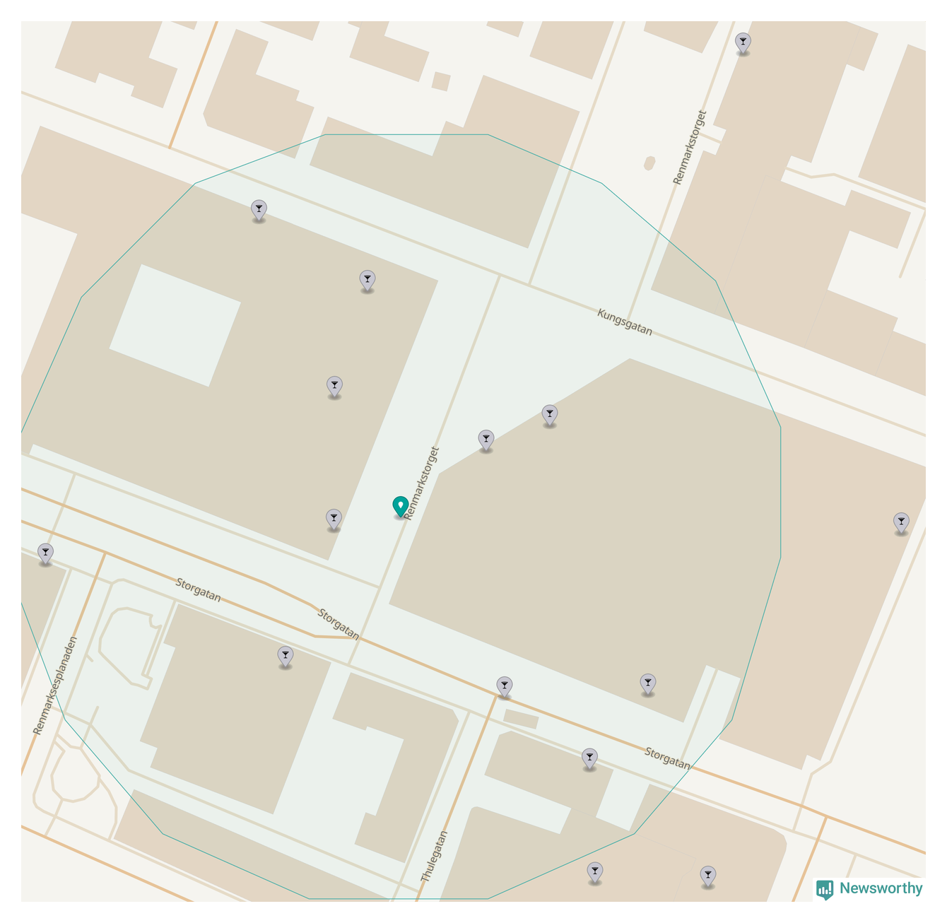 Tätast ligger förstås barerna ofta centralt i större städer. De platser i Västerbotten där de ligger tätast ligger i Skellefteå kommun respektive Umeå kommun: Om du står på Guldtorget eller på Renmarkstorget har du elva krogar, restauranger eller hotell med serveringstillstånd inom en radie på 100 meter.