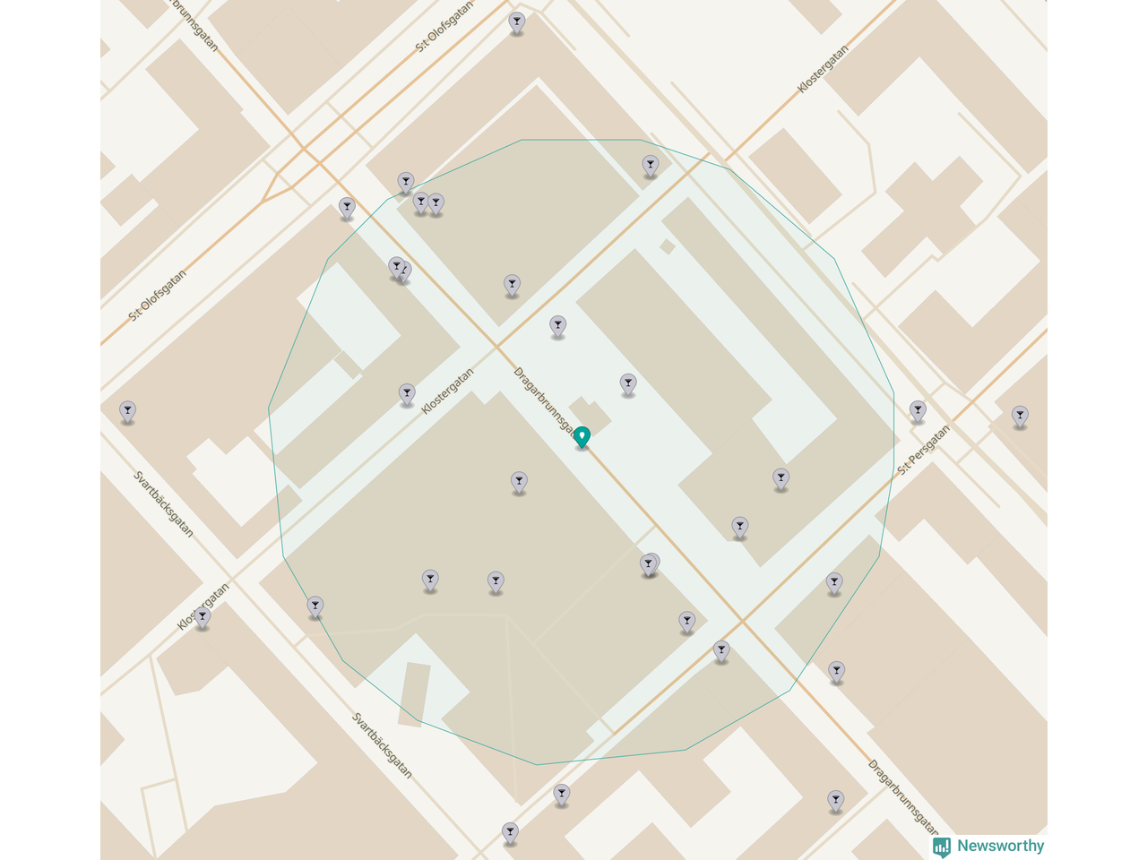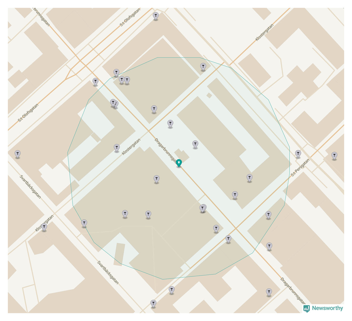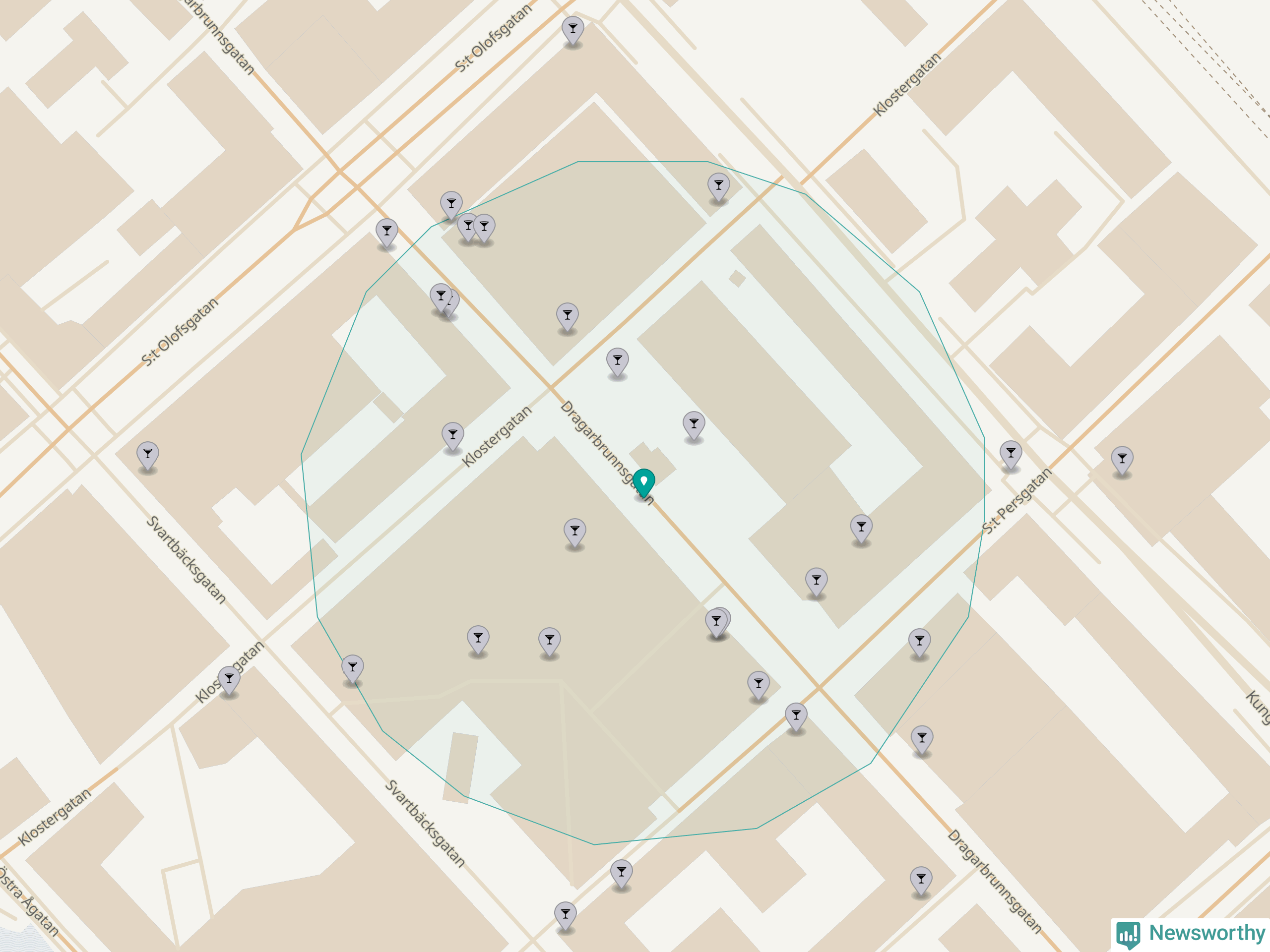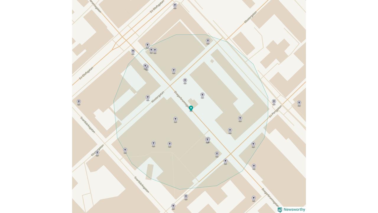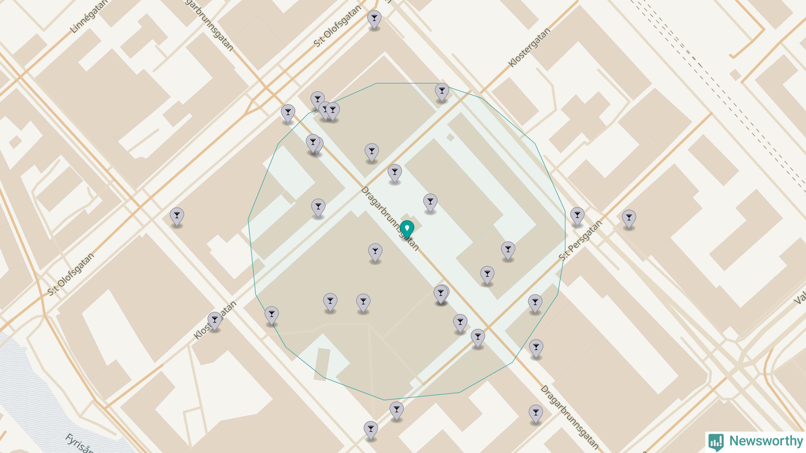Om du står på Dragarbrunnsgatan har du sisådär 20 krogar, restauranger eller hotell med serveringstillstånd inom en radie på 100 meter. Det är den krogtätaste platsen i Uppsala kommun och den krogtätaste platsen i Uppsala län.