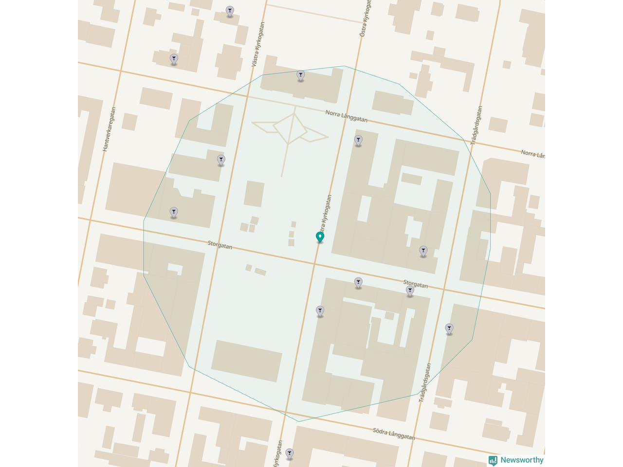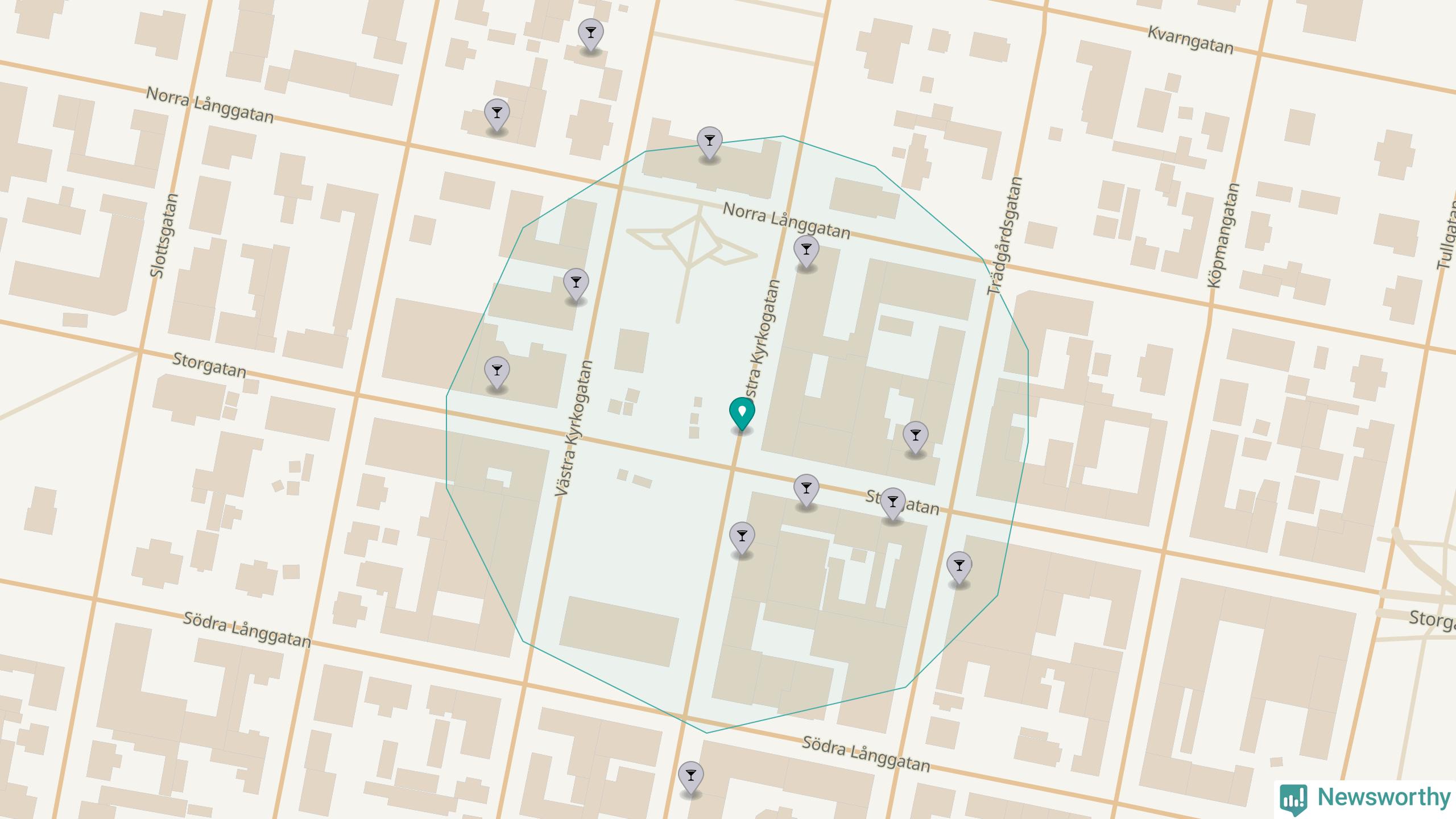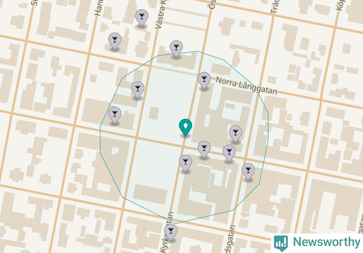 Tätast ligger förstås barerna ofta centralt i större städer. Den plats i Kalmar län där de ligger tätast ligger i Kalmar kommun: Om du står på Storgatan har du 25 ställen med serveringstillstånd inom en radie på 100 meter.