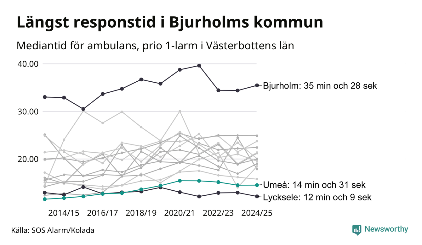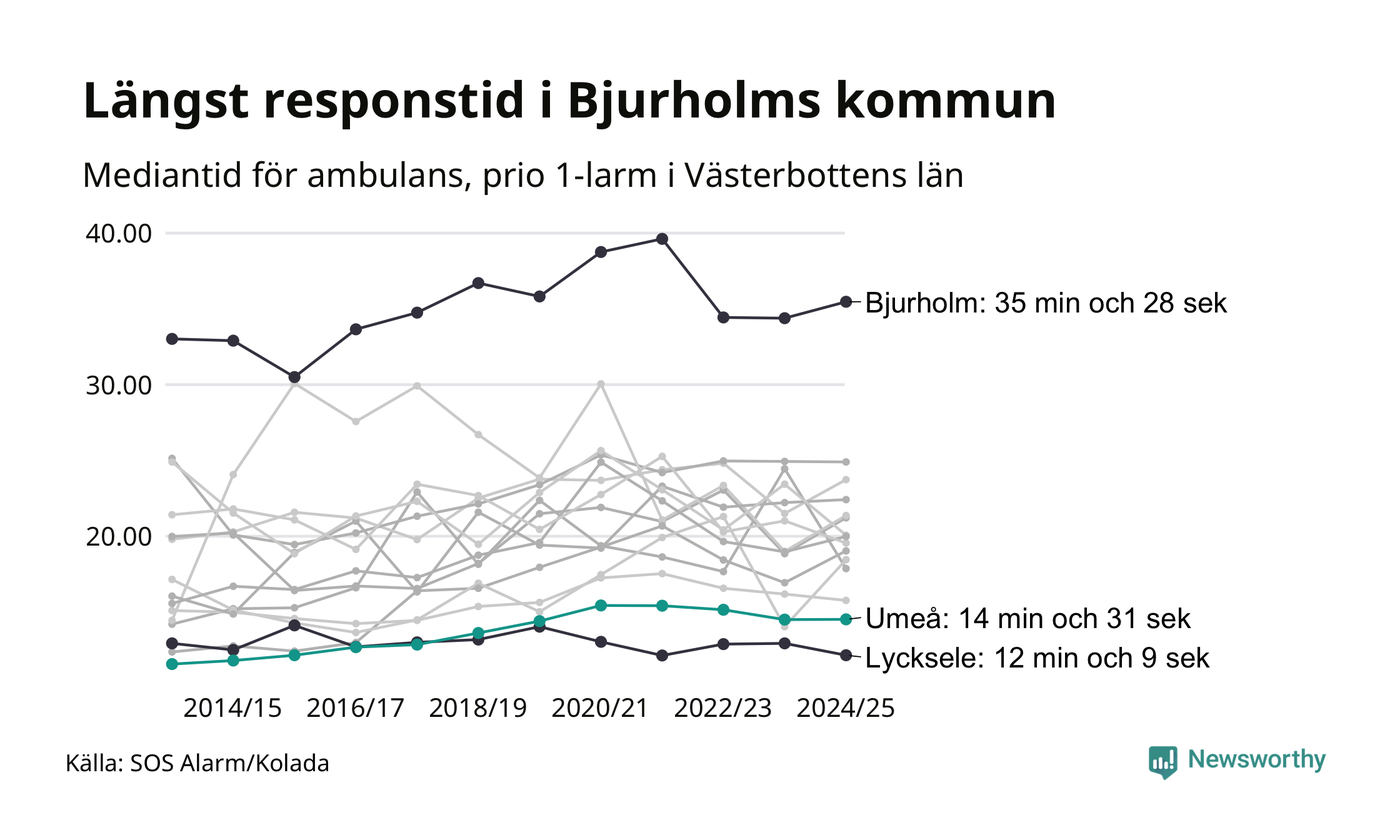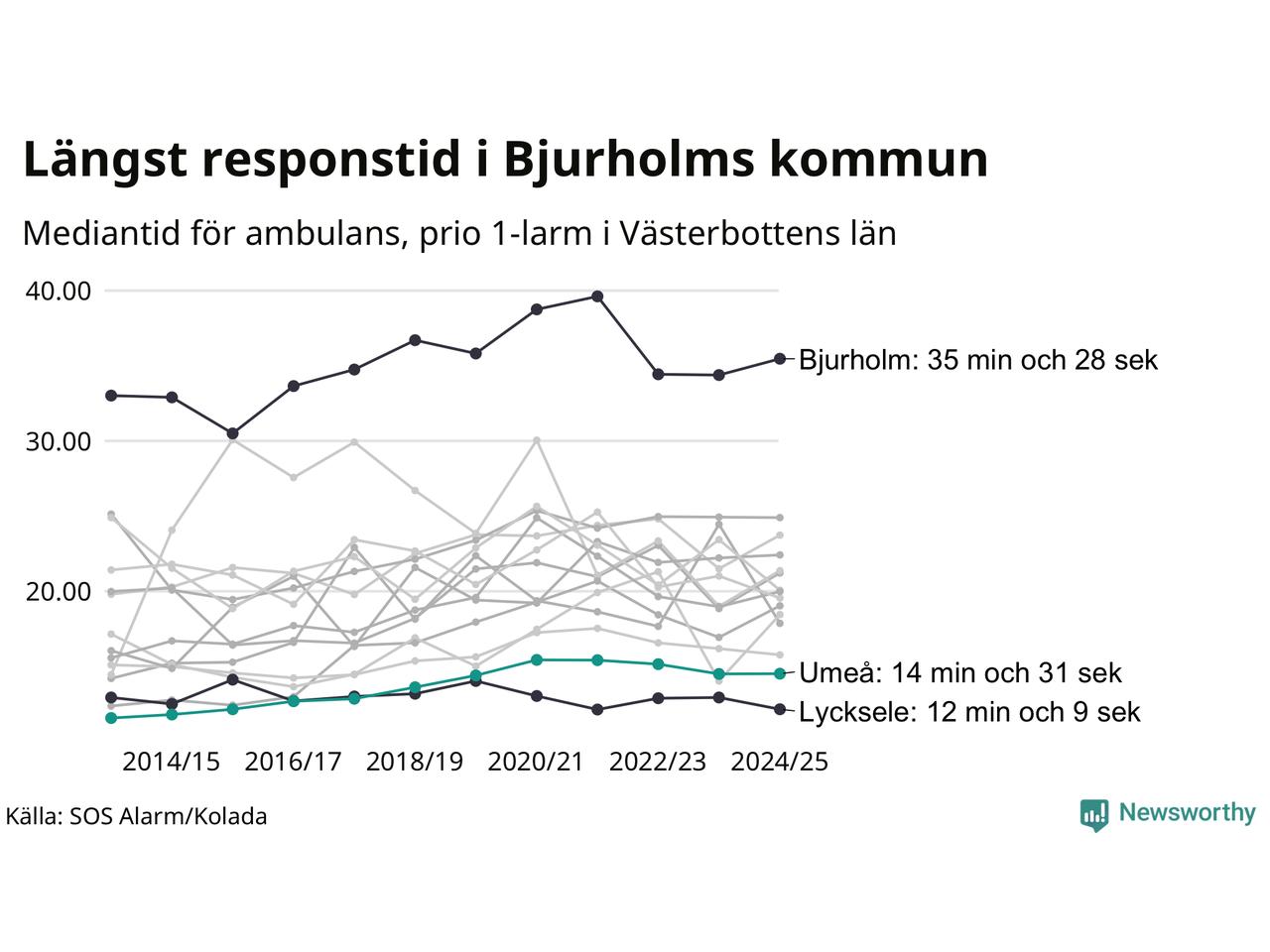 Bjurholm är alltså en av de kommuner som får vänta längst på ambulans i landet. Längst är väntan på ambulans i Pajala kommun, 37 minuter och 55 sekunder. Kommunerna med längst responstid finns i Norrlands inland eller i glesbygd.
