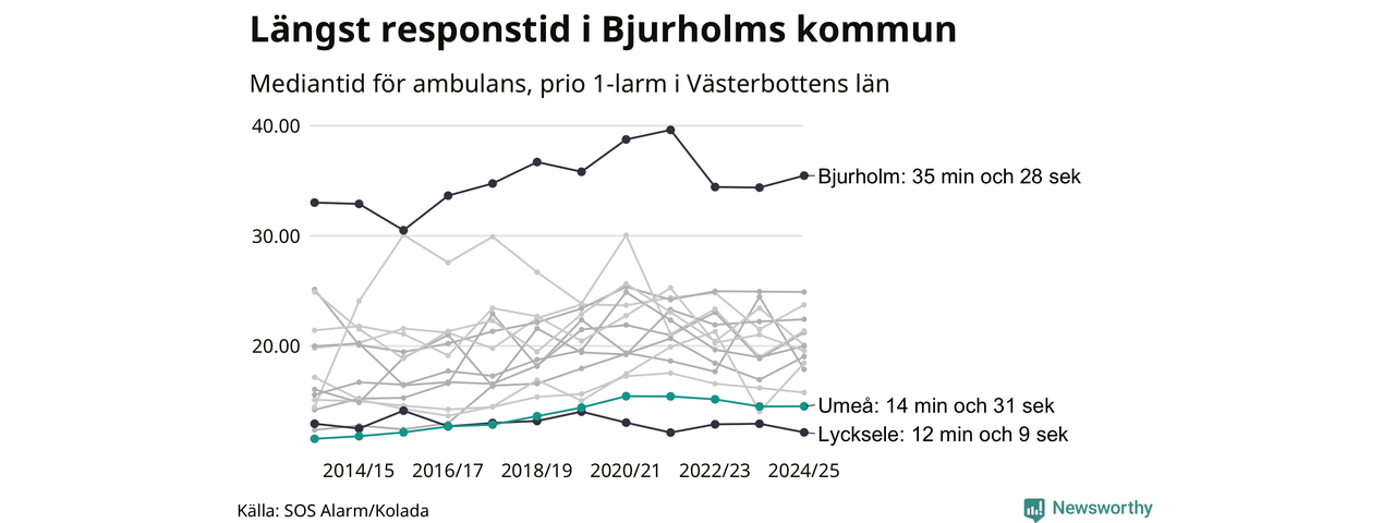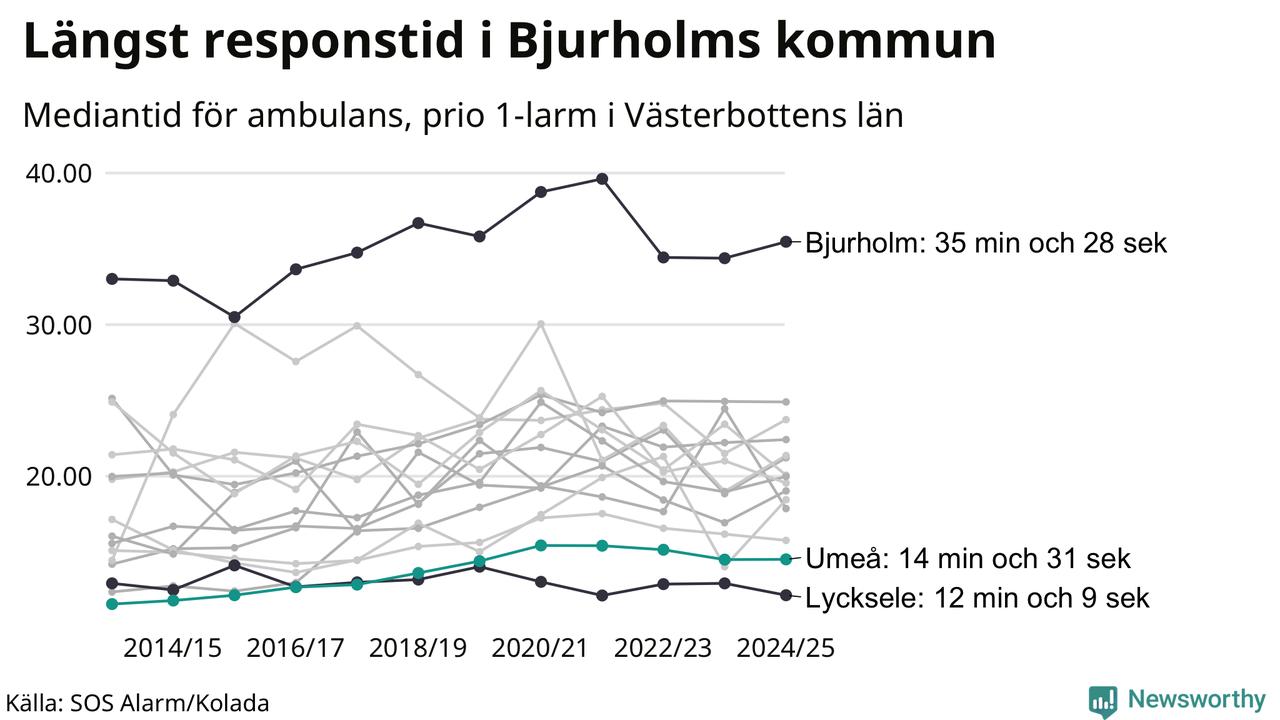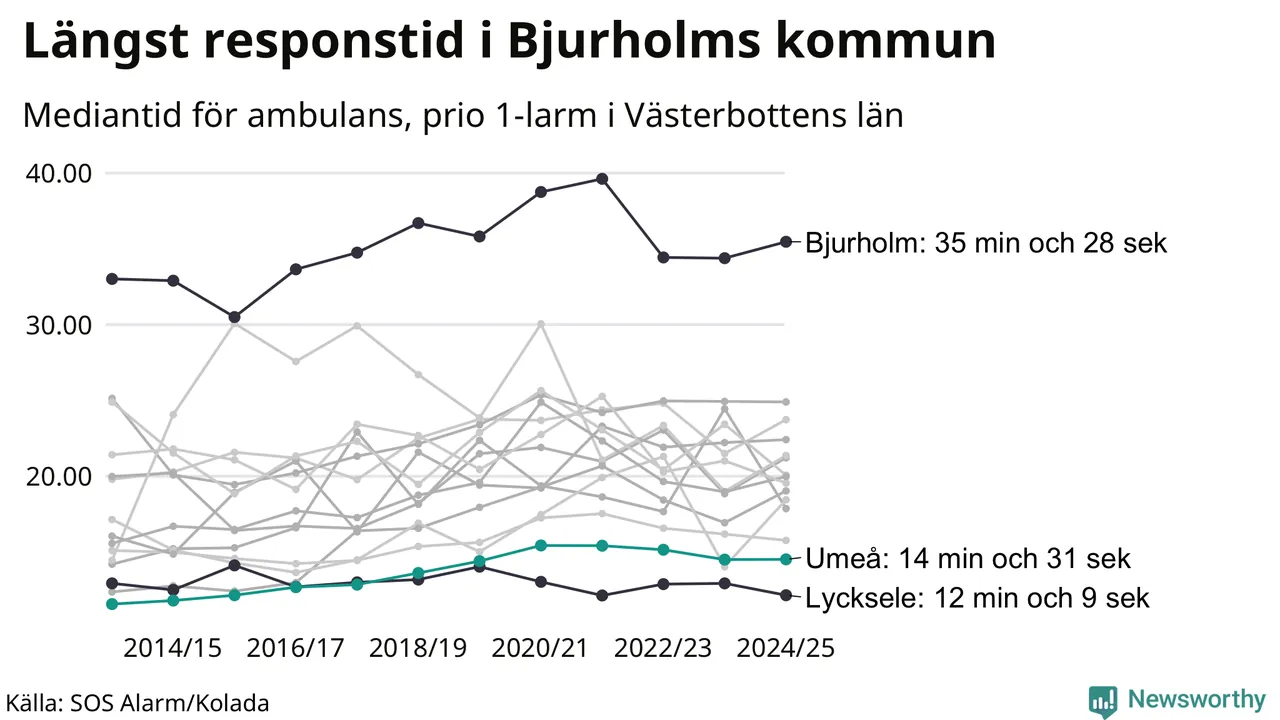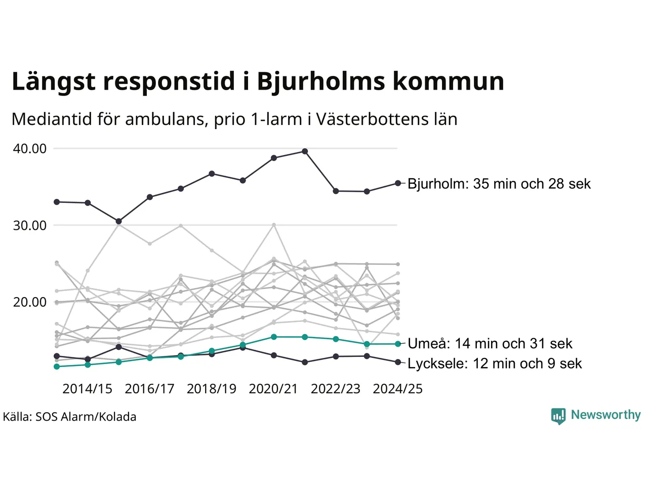 Bland kommunerna i Region Västerbotten nåddes Umeå näst snabbast av ambulans under 2024/2025. Bara i Lycksele kommer ambulansen snabbare. Längst är väntetiden i Bjurholms kommun, som också tillhör de tio kommuner i landet som får vänta längst på ambulans: 35 minuter och 28 sekunder. Där har väntetiden har dessutom ökat med 1 minut och 5 sekunder sedan året innan.