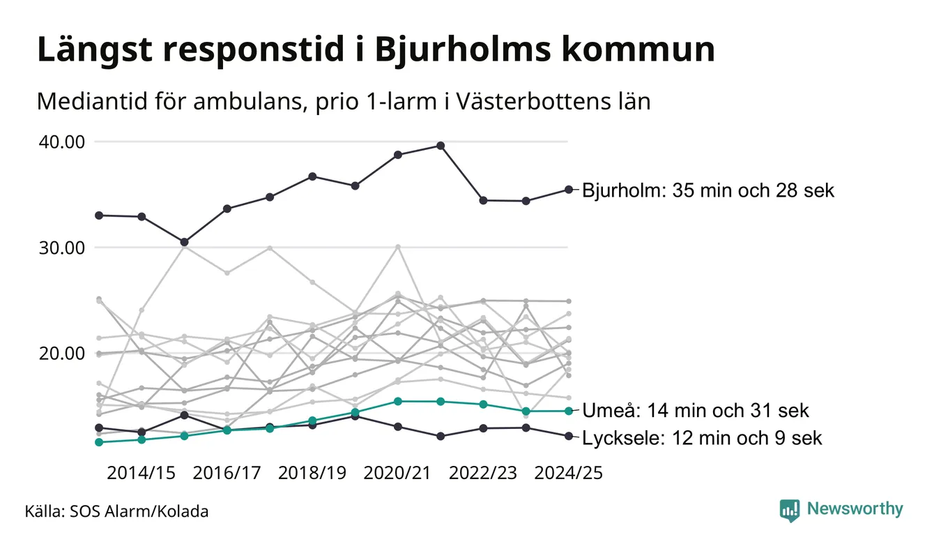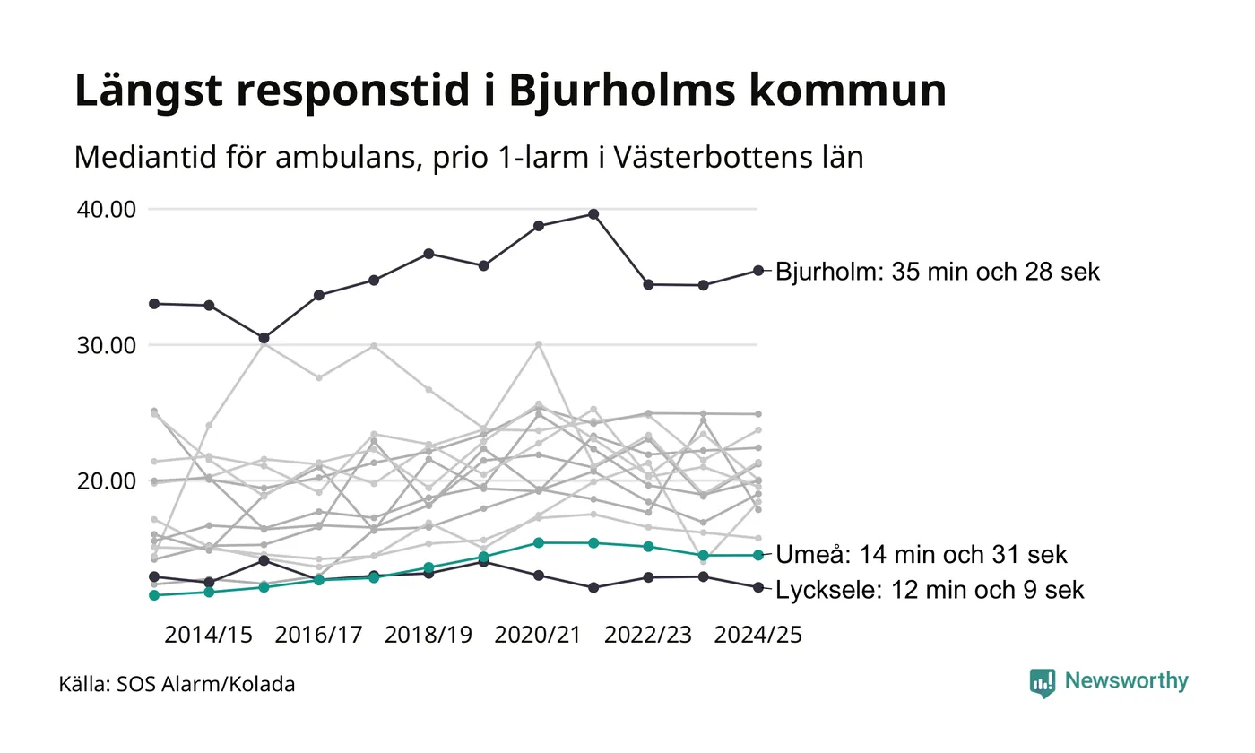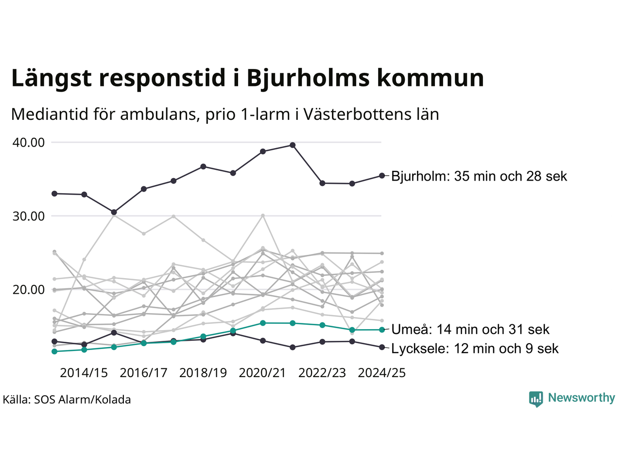Bland kommunerna i Region Västerbotten nåddes Umeå näst snabbast av ambulans under 2024/2025. Bara i Lycksele kommer ambulansen snabbare. Längst är väntetiden i Bjurholms kommun, som också tillhör de tio kommuner i landet som får vänta längst på ambulans: 35 minuter och 28 sekunder. Där har väntetiden har dessutom ökat med 1 minut och 5 sekunder sedan året innan.