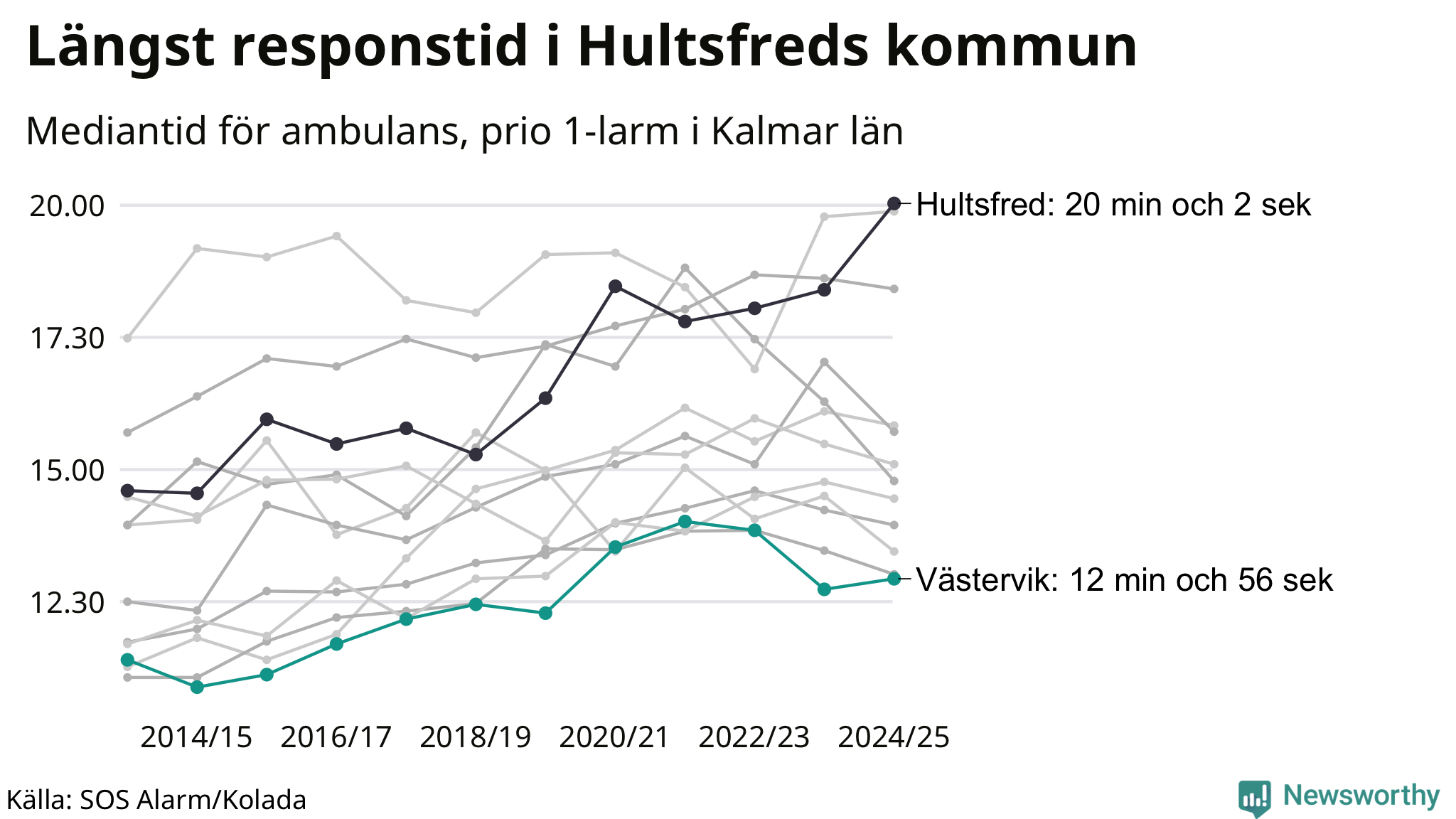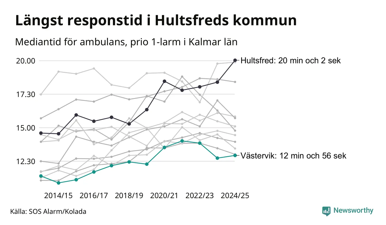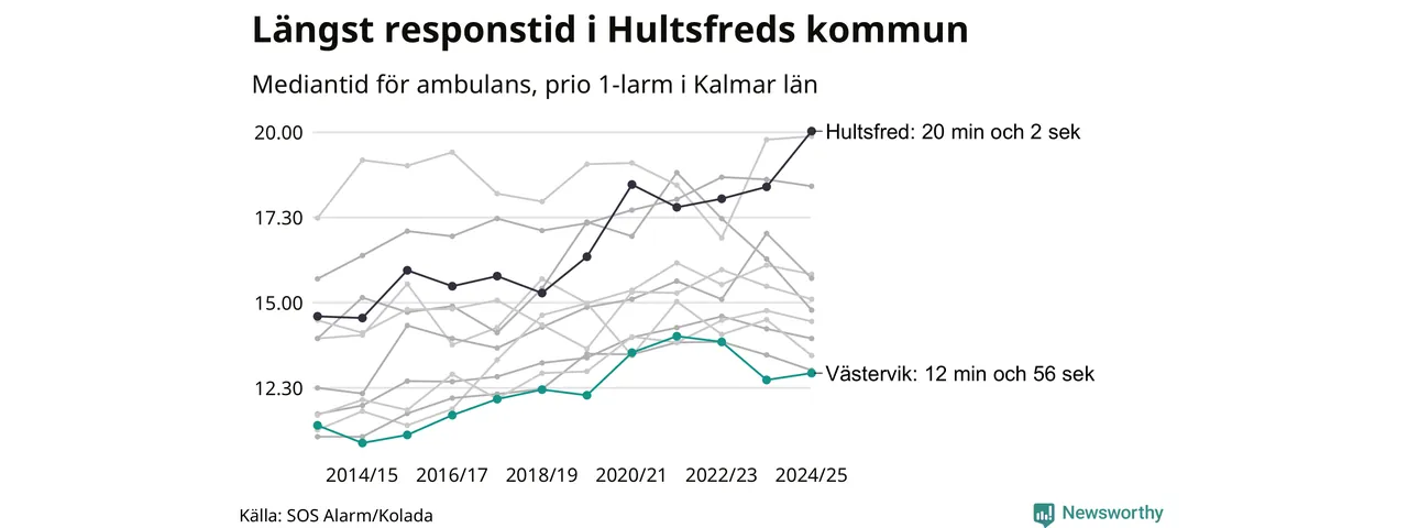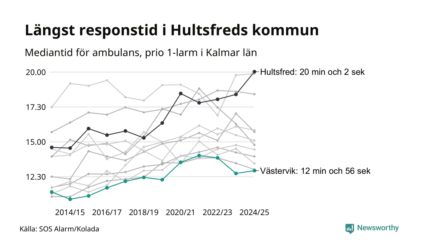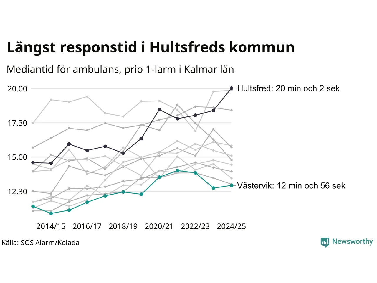 Bland kommunerna i Region Kalmar nåddes Västervik snabbast av ambulans under 2024/2025. Längst är väntetiden i Hultsfreds kommun: 20 minuter och 2 sekunder. Där har väntetiden har dessutom ökat med 1 minut och 38 sekunder sedan året innan.