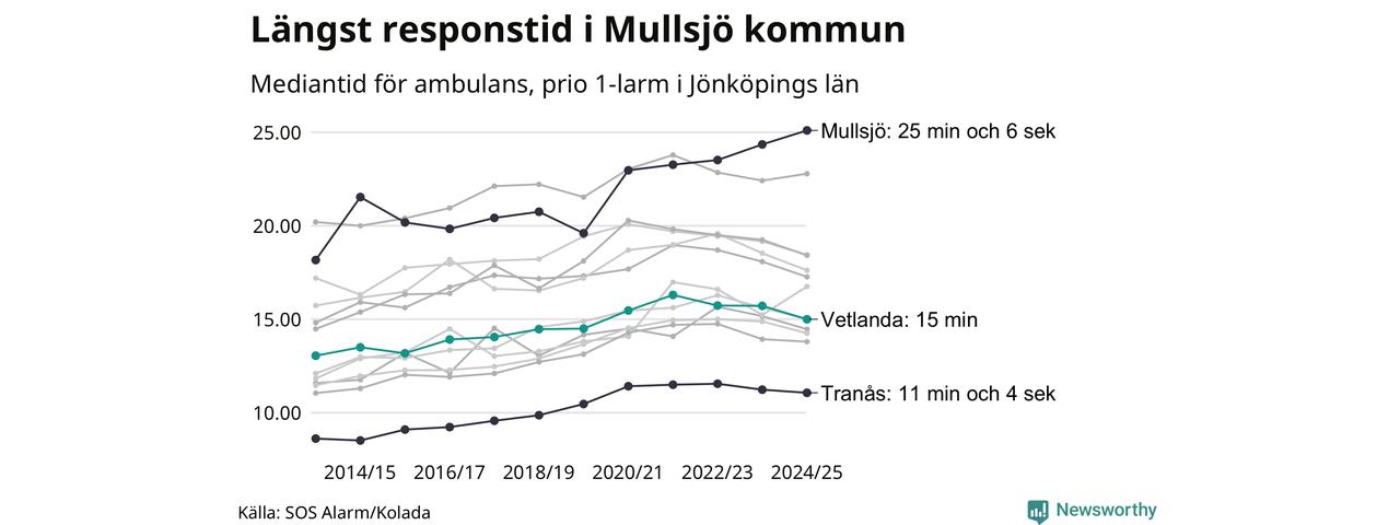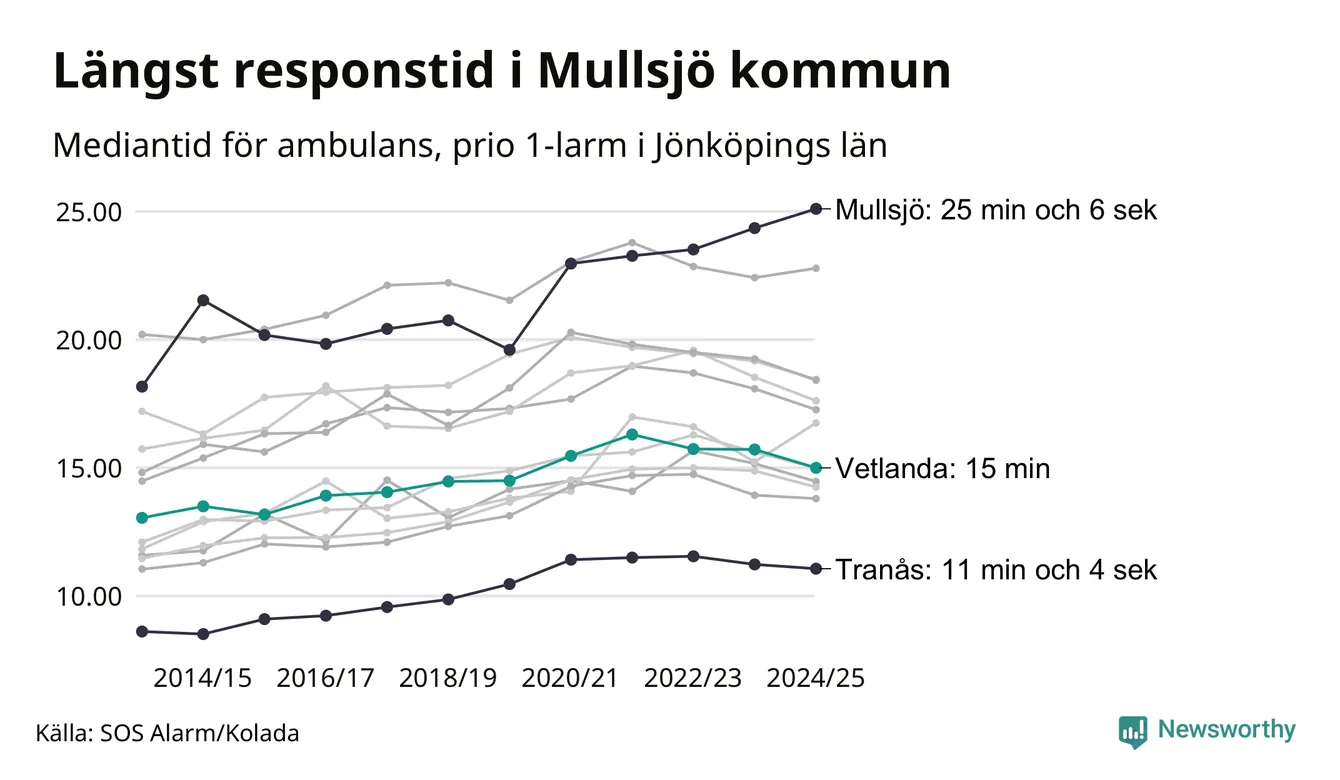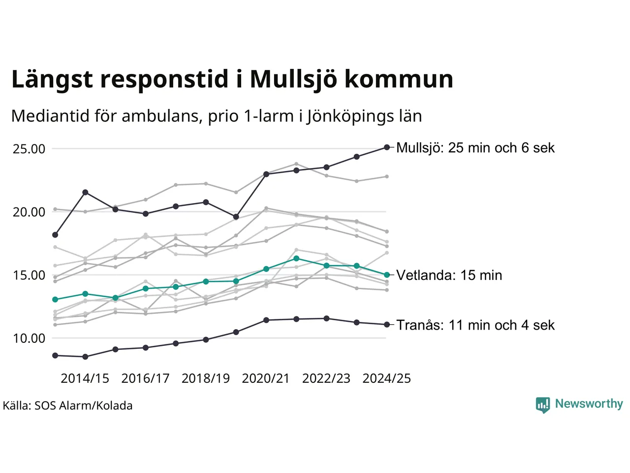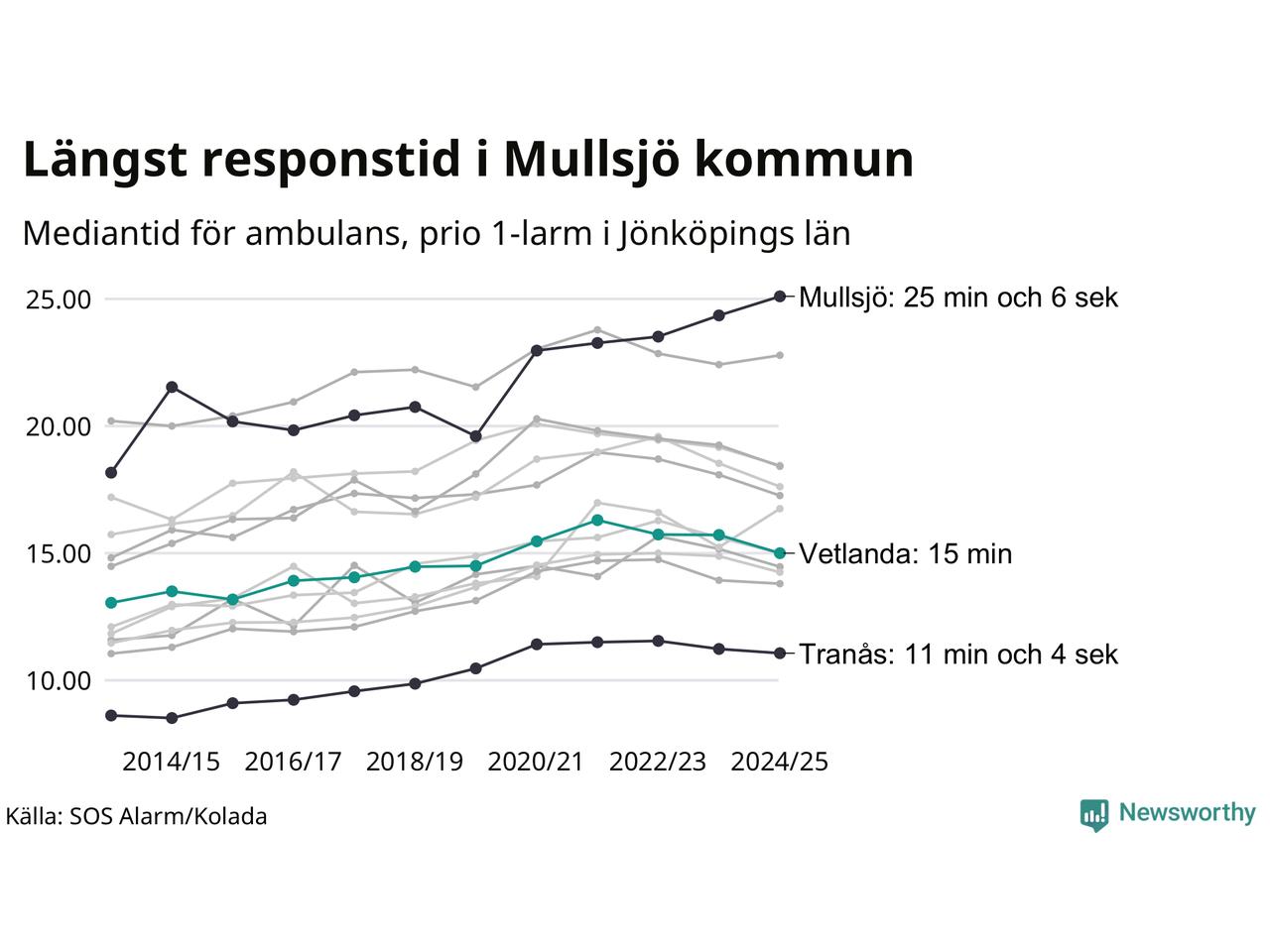 Vetlanda tillhör inte de kommuner i Region Jönköping som får vänta längst på ambulans – men inte heller de som får snabbast hjälp. Längst är väntetiden i Mullsjö kommun, som också tillhör de tio kommuner i landet som får vänta längst på ambulans: 25 minuter och 6 sekunder. Snabbast var ambulansen framme i Tranås, där det tog 11 minuter och 4 sekunder från larmsamtalet 2024/2025.