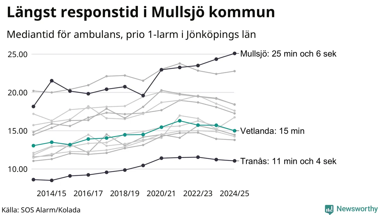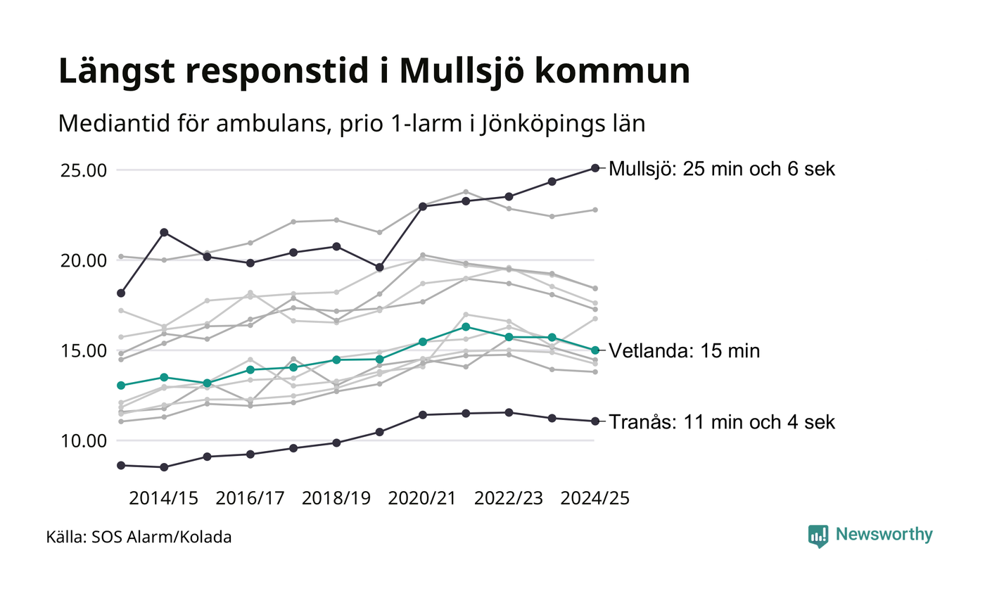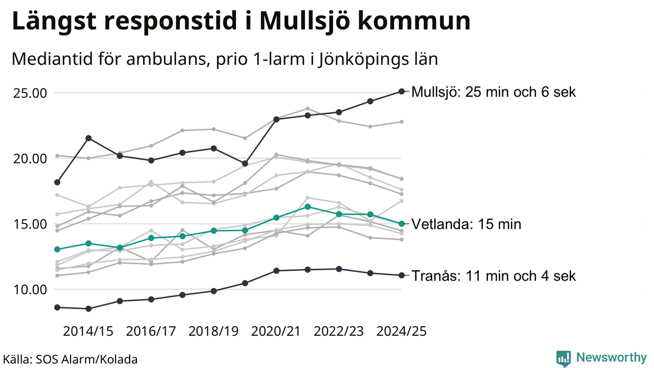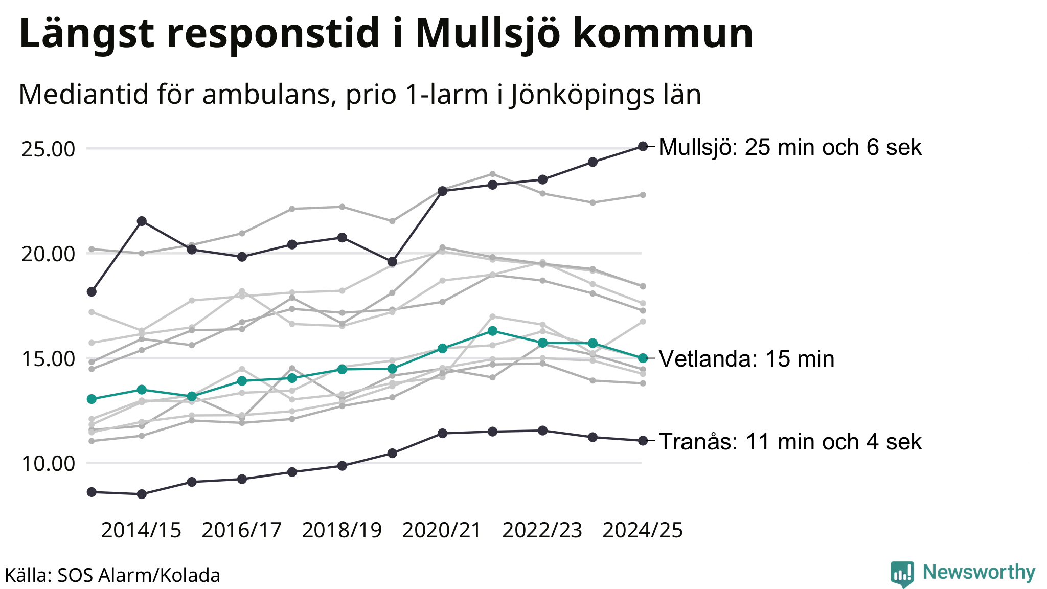 Vetlanda tillhör inte de kommuner i Region Jönköping som får vänta längst på ambulans – men inte heller de som får snabbast hjälp. Längst är väntetiden i Mullsjö kommun, som också tillhör de tio kommuner i landet som får vänta längst på ambulans: 25 minuter och 6 sekunder. Snabbast var ambulansen framme i Tranås, där det tog 11 minuter och 4 sekunder från larmsamtalet 2024/2025.