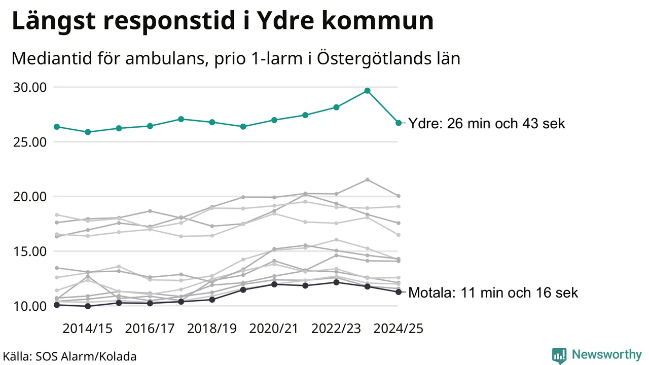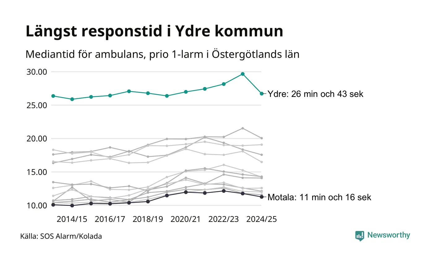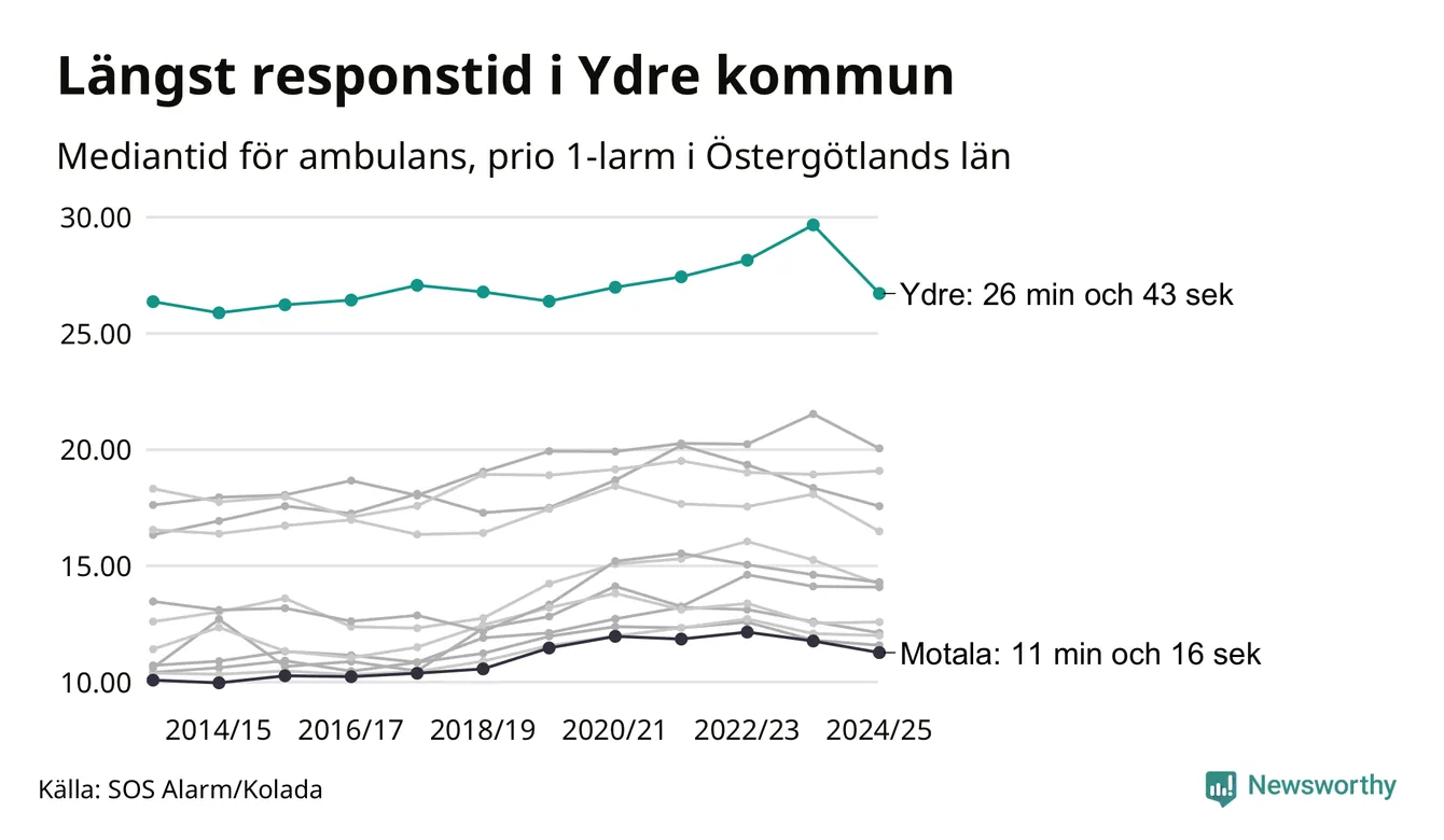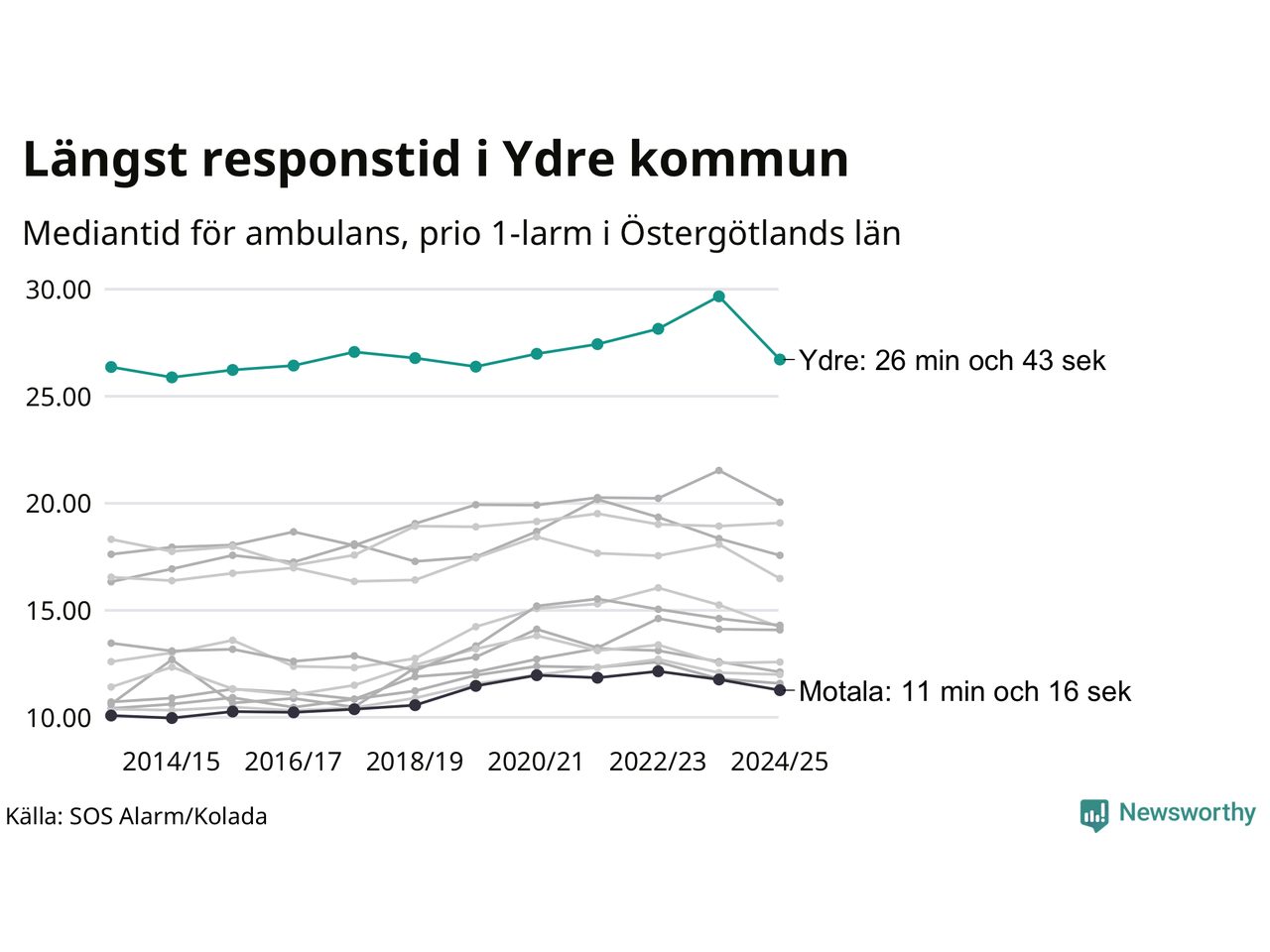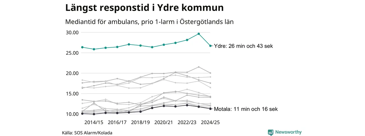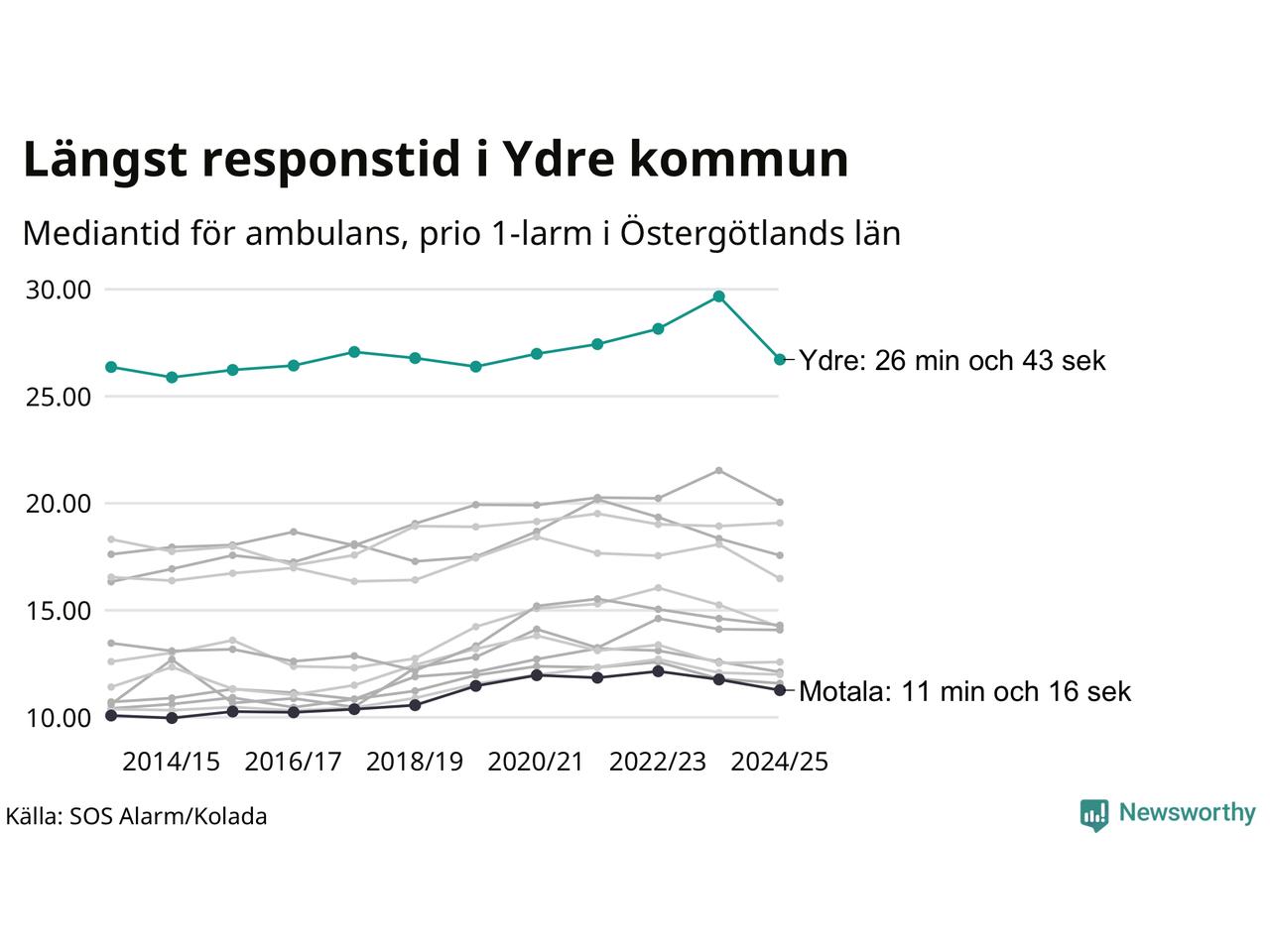 Det tar 26 minuter och 43 sekunder från att 112-samtalet når larmcentralen till att ambulansen är på plats i Ydre kommun. Det visar de senaste siffrorna från SOS Alarm. Tiden är en mediantid för alla prio 1-larm mellan 1 juni 2024 och 31 maj 2025 och ett nyckeltal som redovisas varje år.