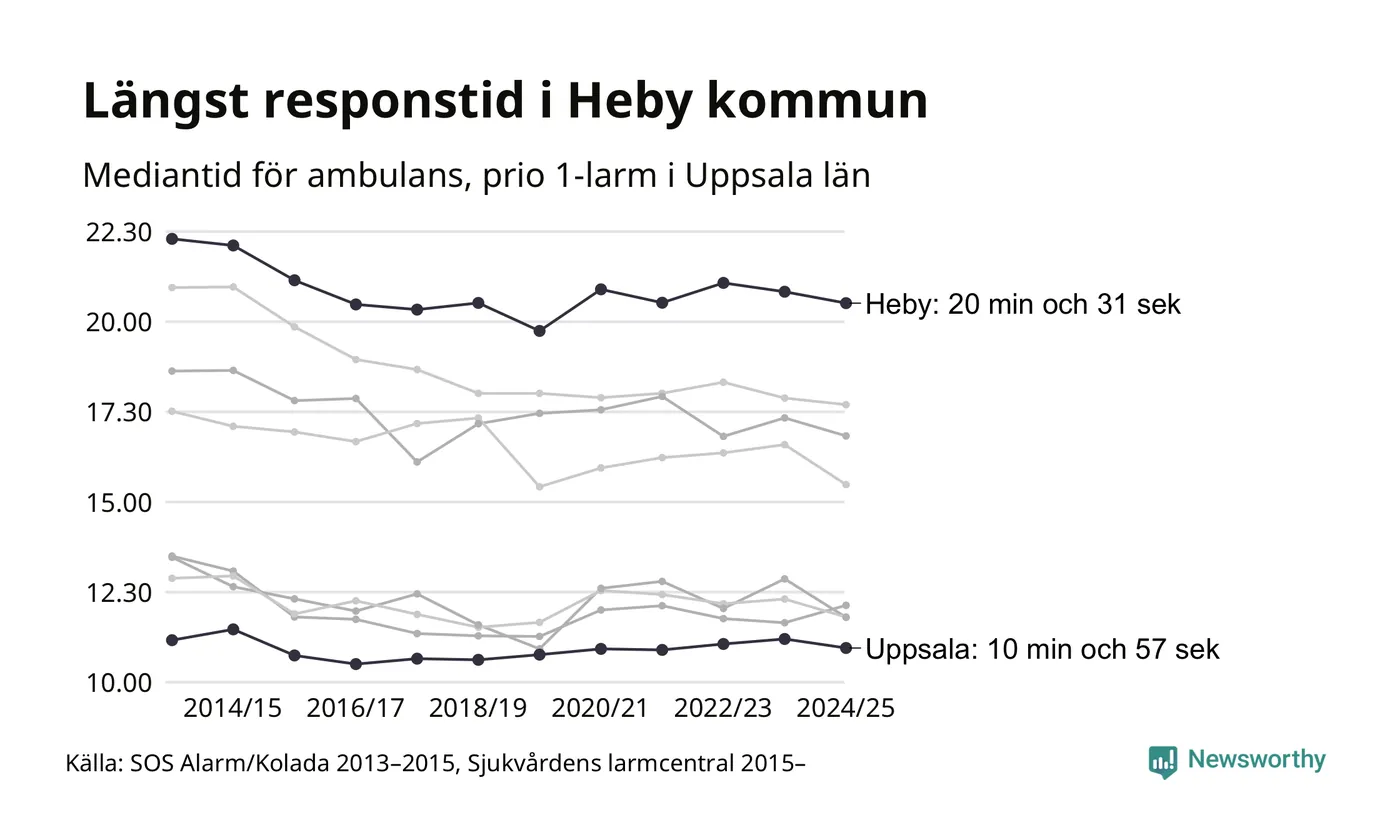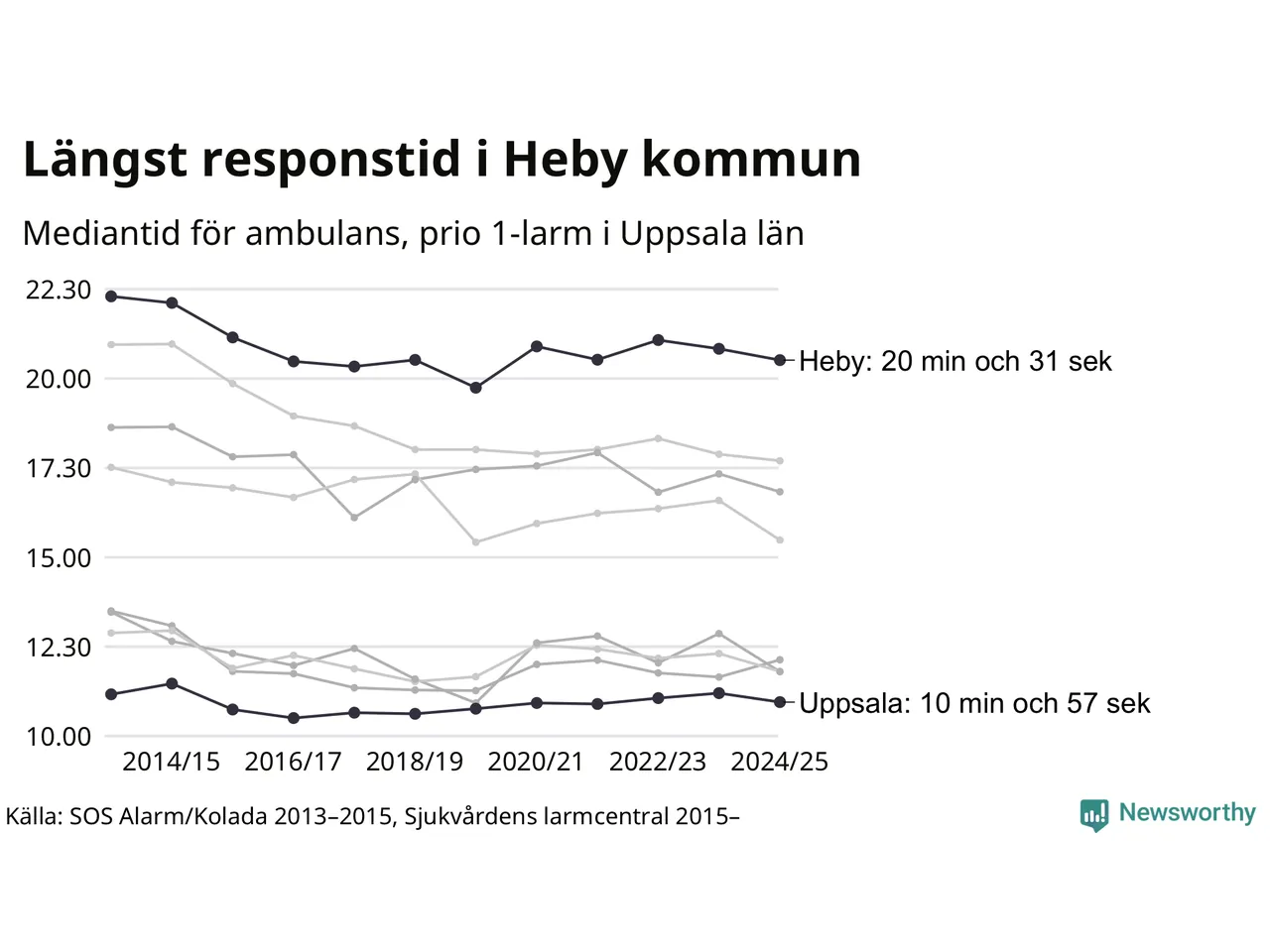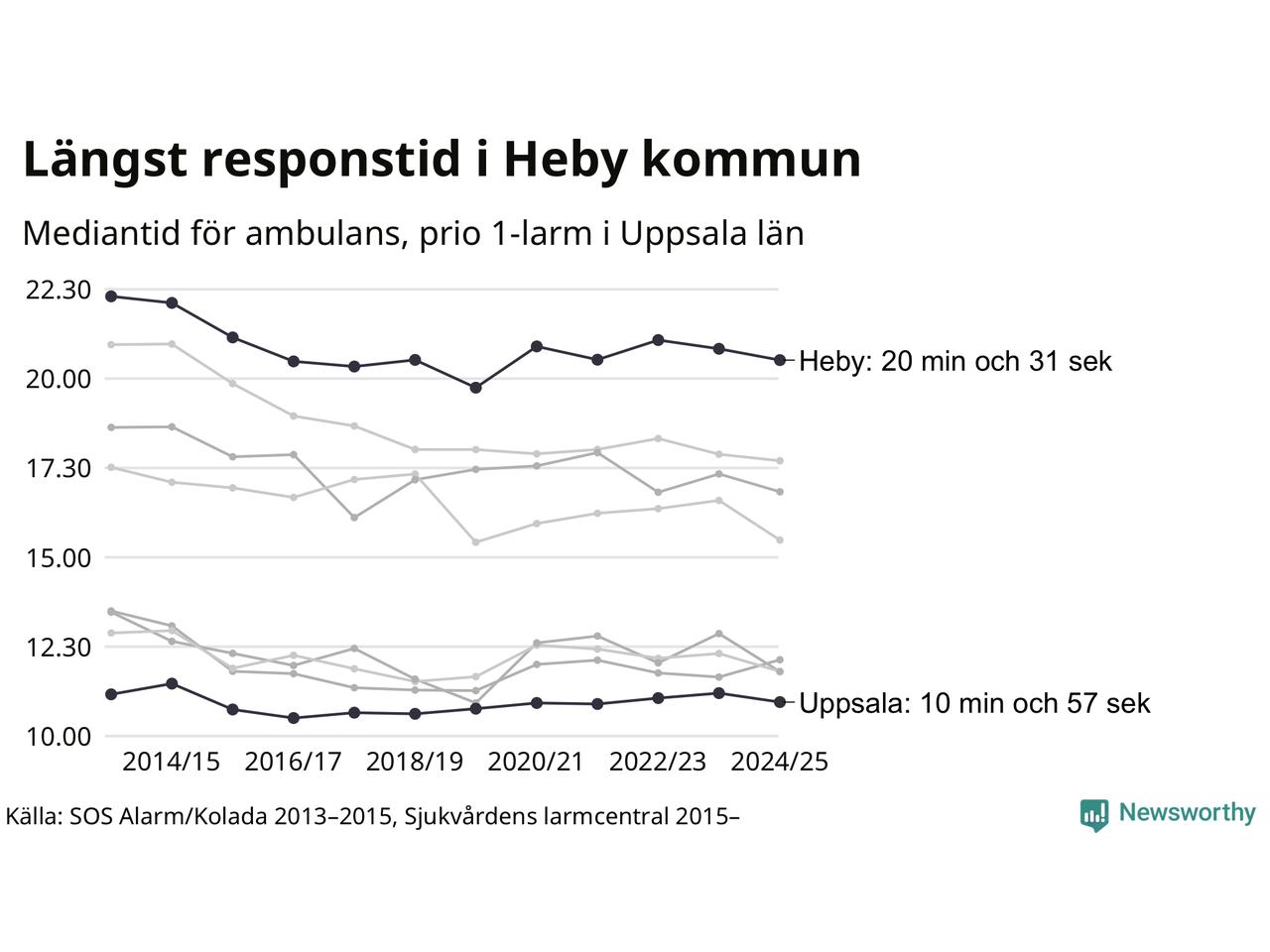 Det tar 20 minuter och 31 sekunder från att 112-samtalet når larmcentralen till att ambulansen är på plats i Heby kommun. I Uppsala kommun dröjer den 10 minuter och 57 sekunder. Det visar de senaste siffrorna från Sjukvårdens larmcentral. Tiden är en mediantid för alla prio 1-larm mellan 1 juni 2024 och 31 maj 2025 och ett nyckeltal som redovisas varje år.