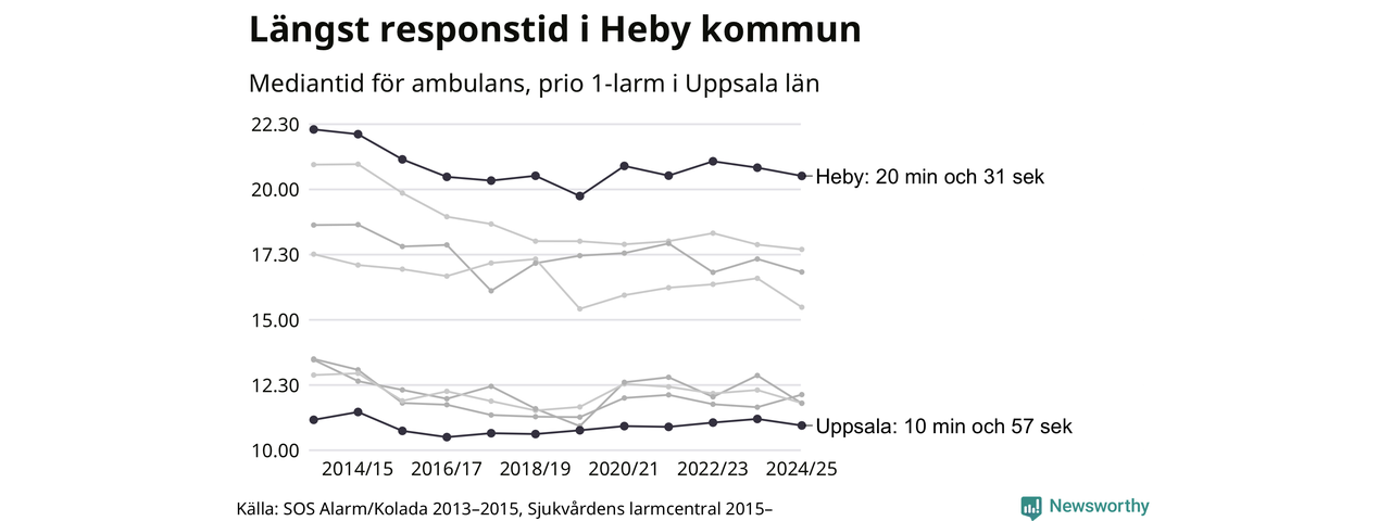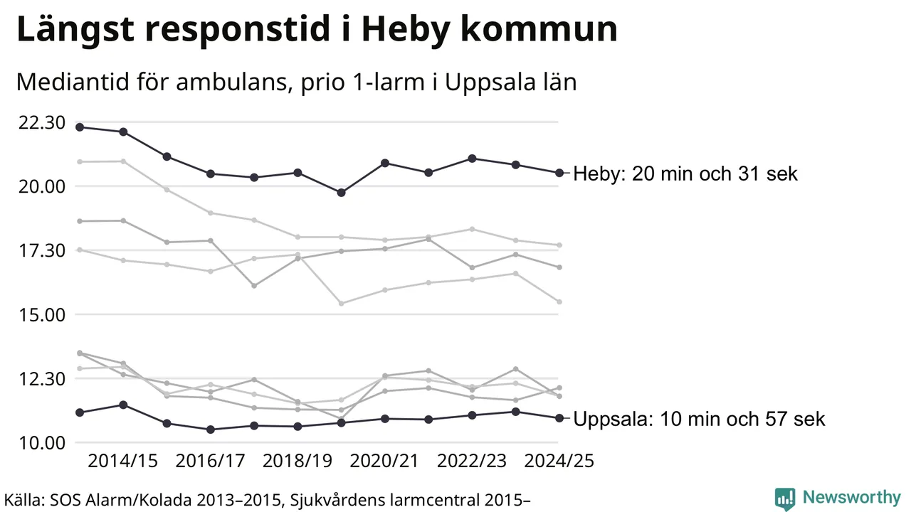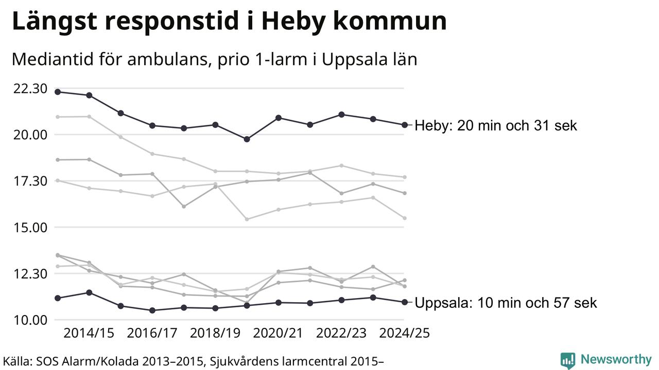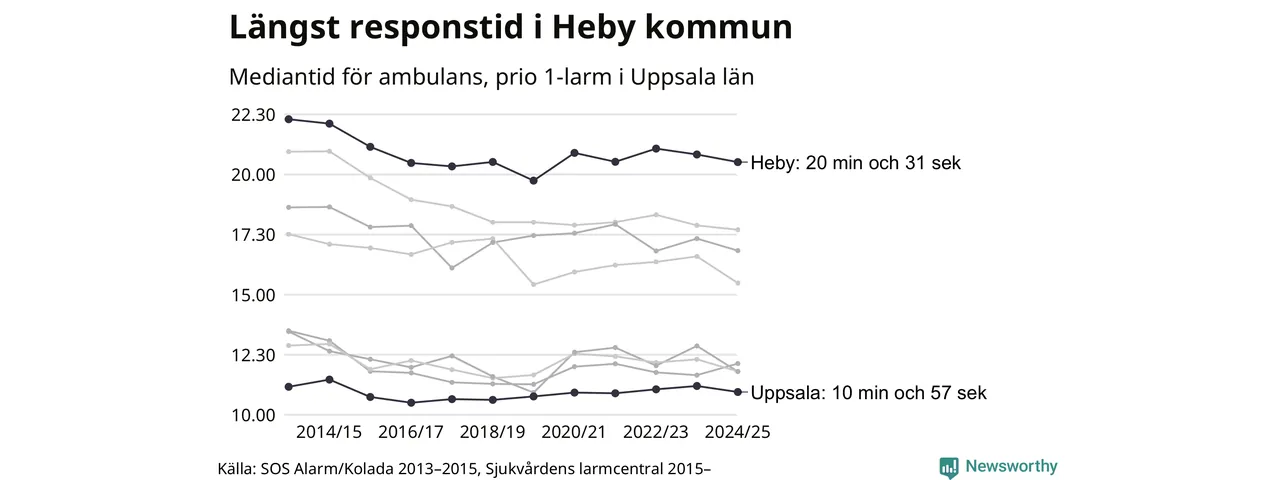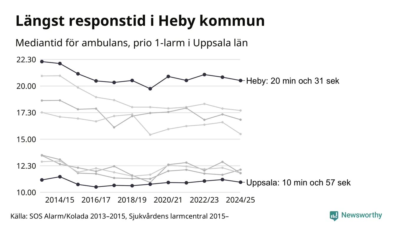 Det tar 20 minuter och 31 sekunder från att 112-samtalet når larmcentralen till att ambulansen är på plats i Heby kommun. I Uppsala kommun dröjer den 10 minuter och 57 sekunder. Det visar de senaste siffrorna från Sjukvårdens larmcentral. Tiden är en mediantid för alla prio 1-larm mellan 1 juni 2024 och 31 maj 2025 och ett nyckeltal som redovisas varje år.