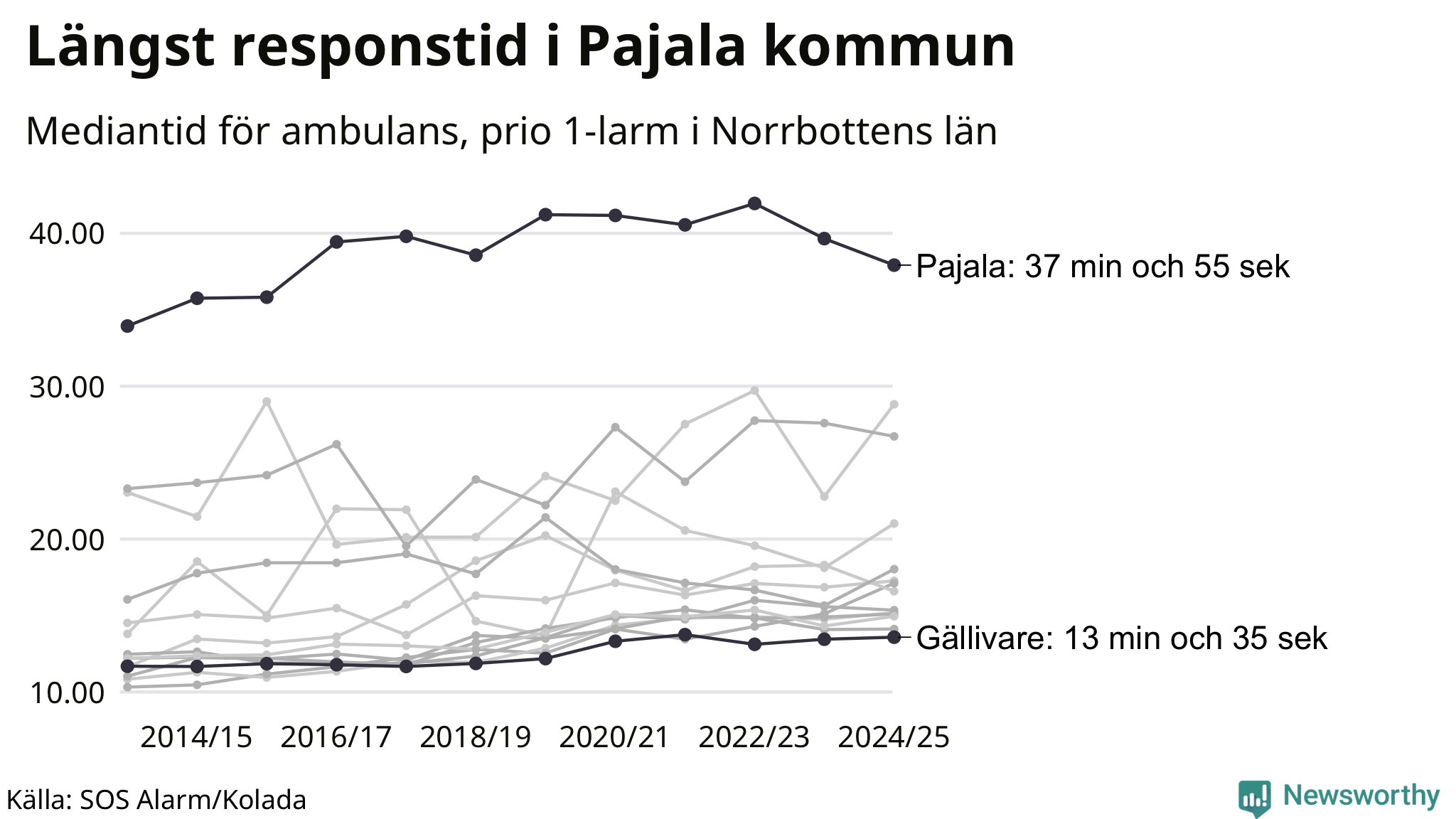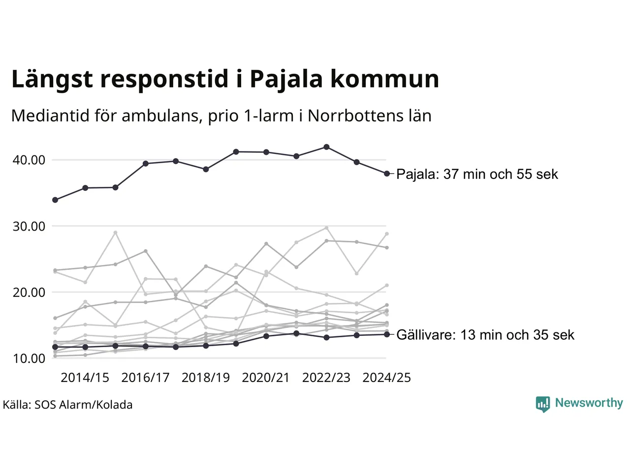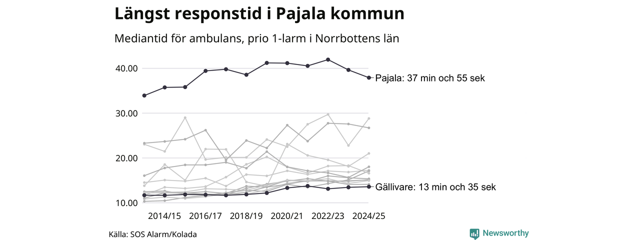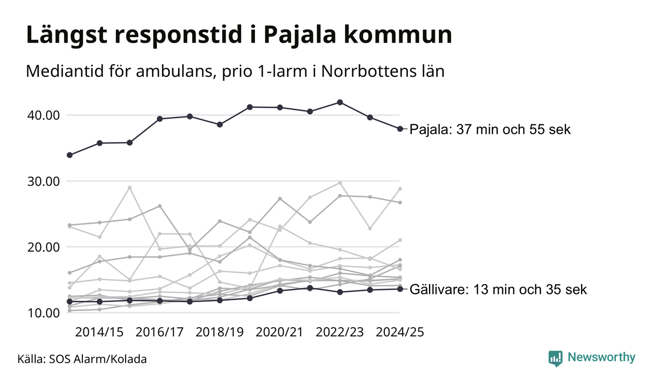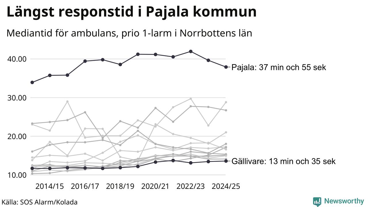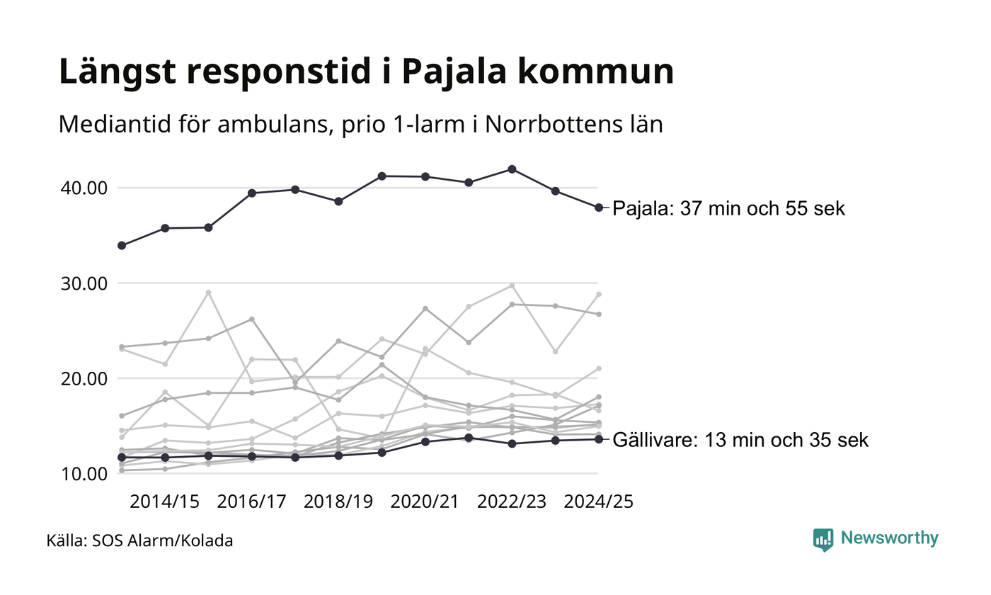Det tar 37 minuter och 55 sekunder från att 112-samtalet når larmcentralen till att ambulansen är på plats i Pajala kommun. I Gällivare dröjer den 13 minuter och 35 sekunder. Det visar de senaste siffrorna från SOS Alarm. Tiden är en mediantid för alla prio 1-larm mellan 1 juni 2024 och 31 maj 2025 och ett nyckeltal som redovisas varje år.