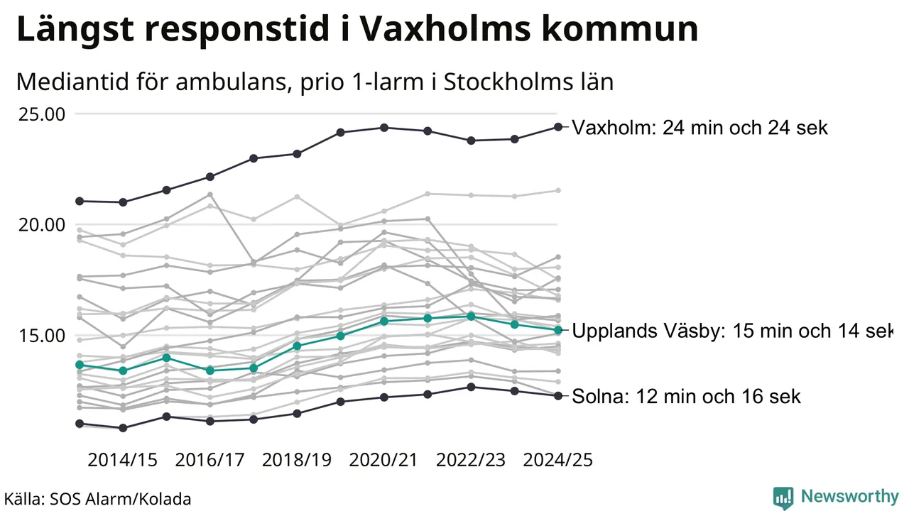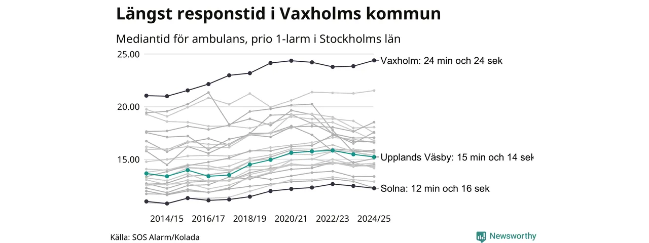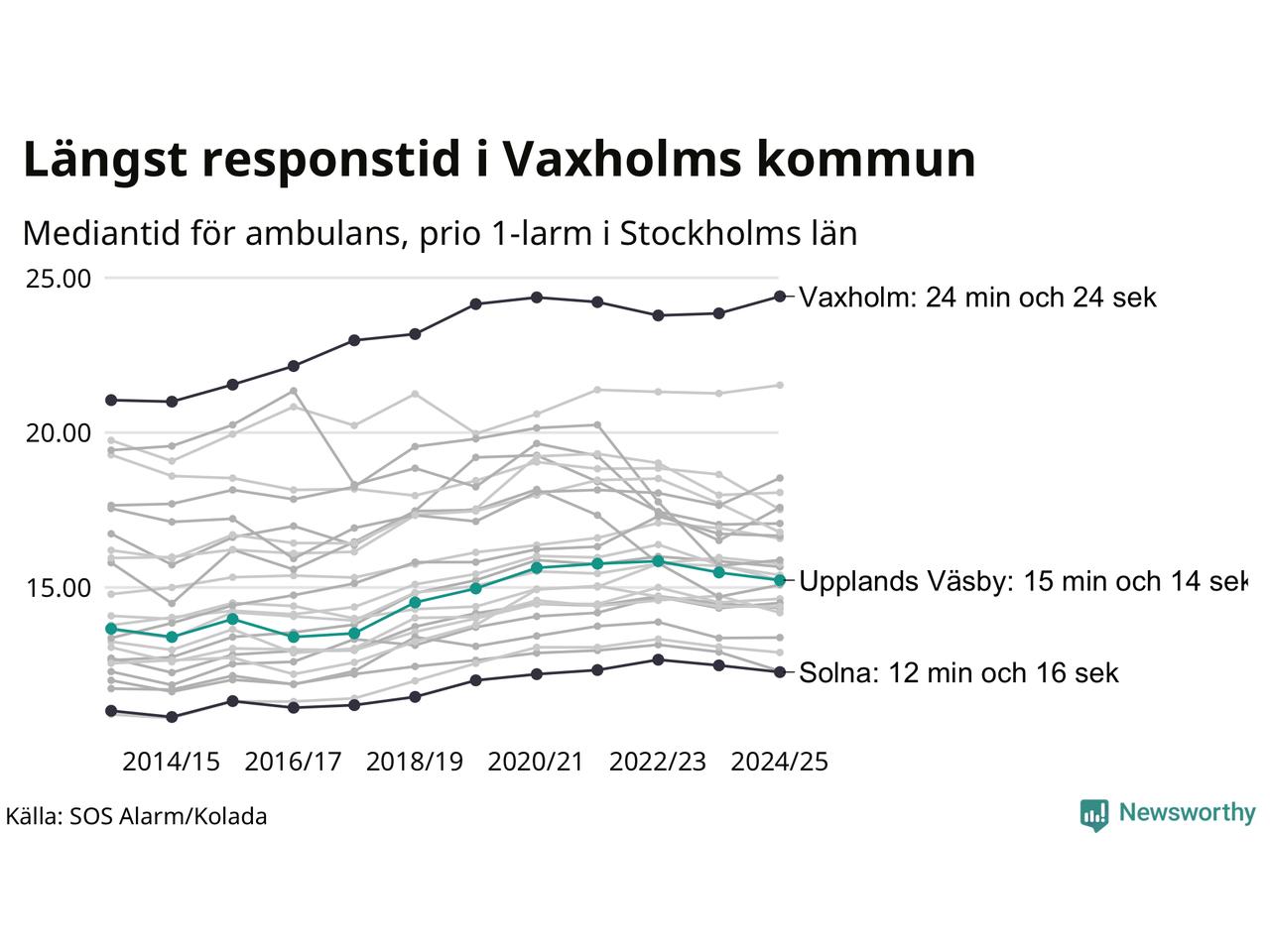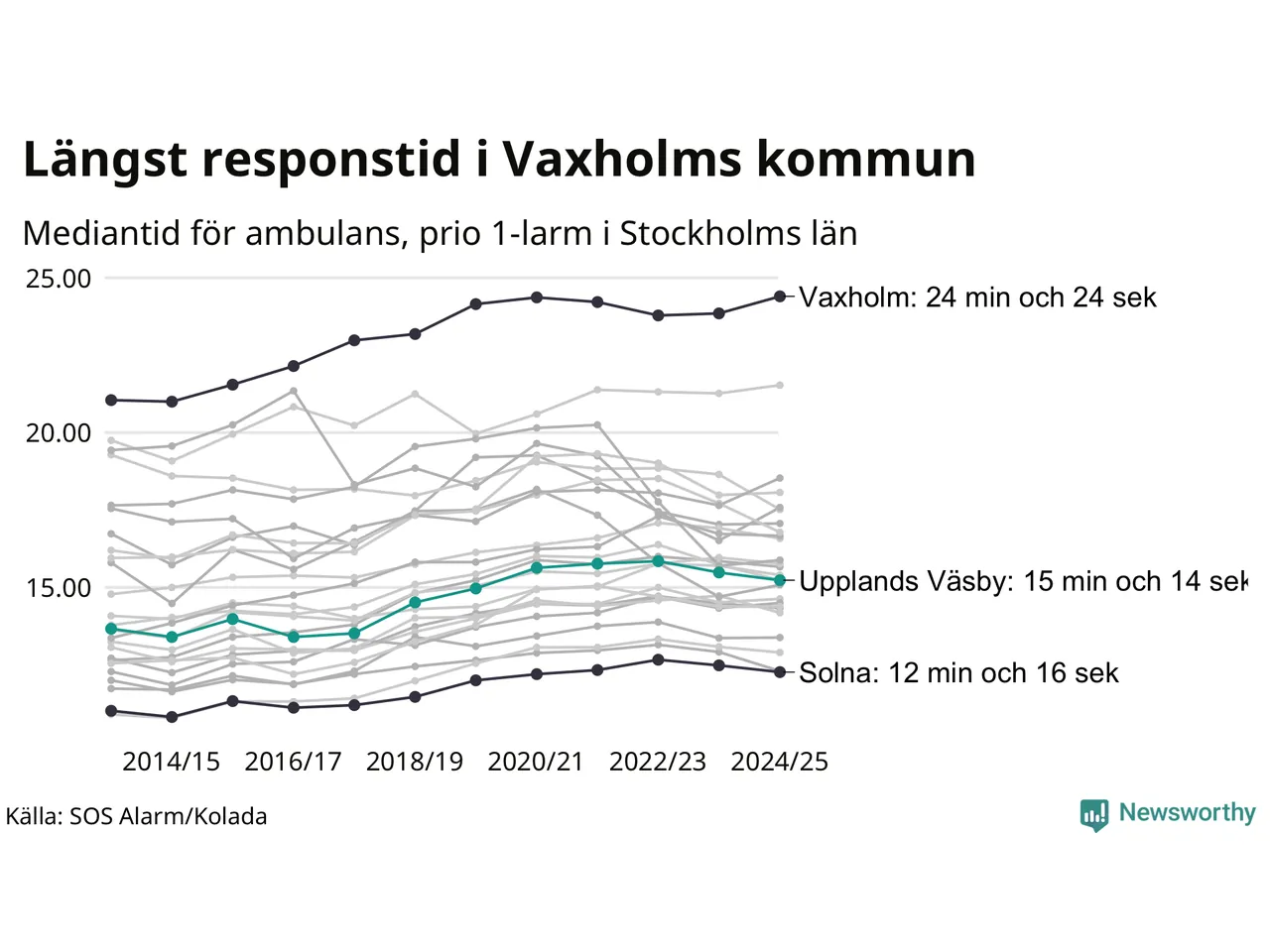 Upplands Väsby tillhör inte de kommuner i Region Stockholm som får vänta längst på ambulans – men inte heller de som får snabbast hjälp. Längst är väntetiden i Vaxholms kommun: 24 minuter och 24 sekunder. Snabbast var ambulansen framme i Solna, där det tog 12 minuter och 16 sekunder från larmsamtalet 2024/2025.