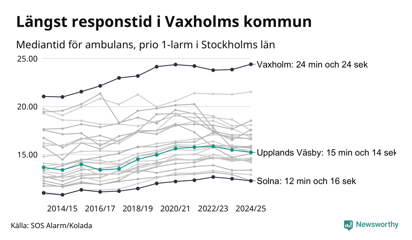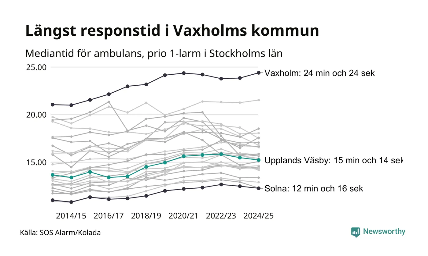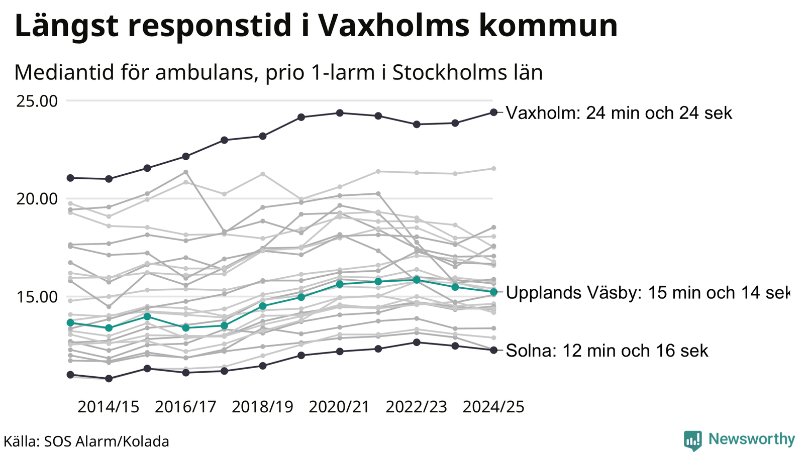 Upplands Väsby tillhör inte de kommuner i Region Stockholm som får vänta längst på ambulans – men inte heller de som får snabbast hjälp. Längst är väntetiden i Vaxholms kommun: 24 minuter och 24 sekunder. Snabbast var ambulansen framme i Solna, där det tog 12 minuter och 16 sekunder från larmsamtalet 2024/2025.