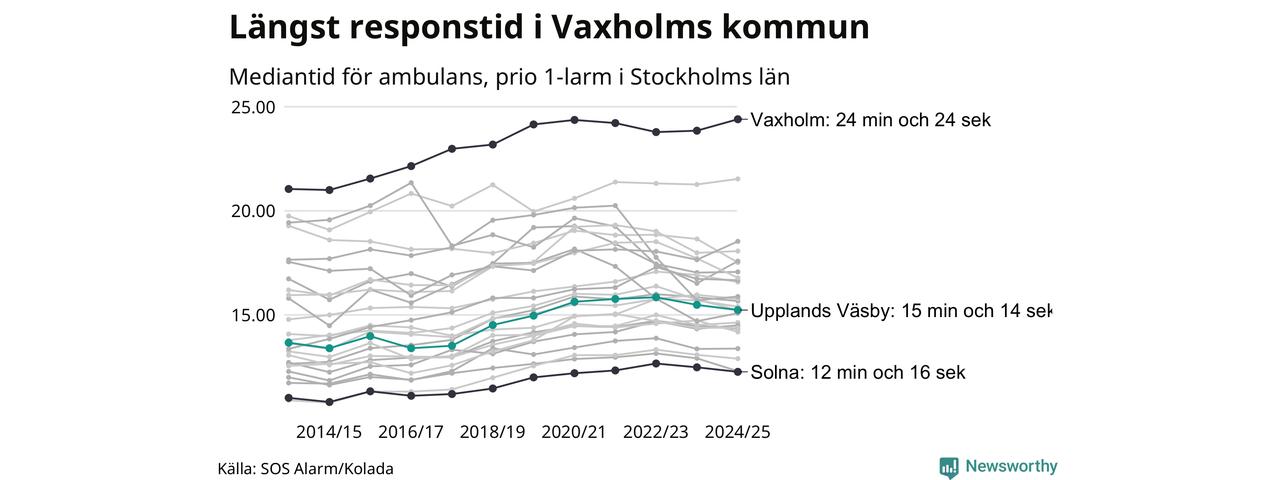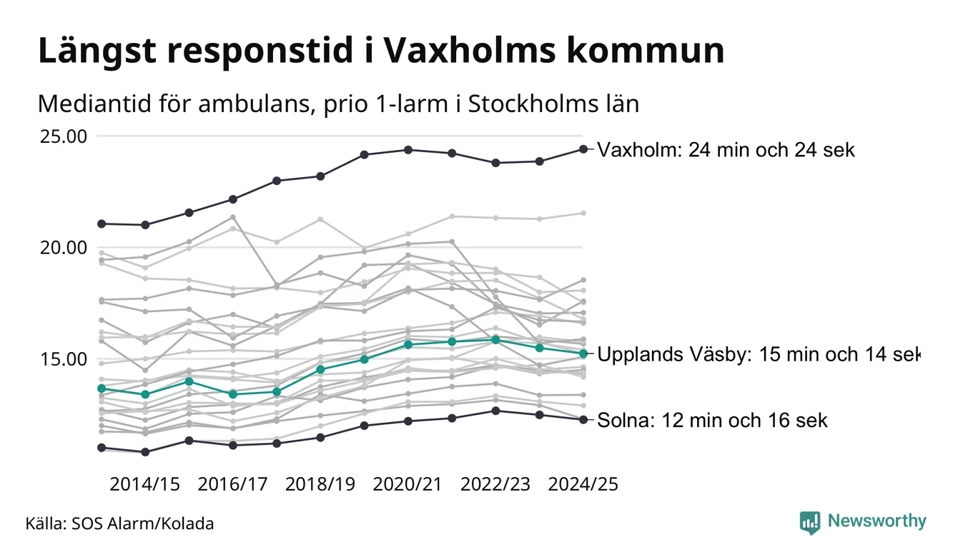 Det tar 15 minuter och 14 sekunder från att 112-samtalet når larmcentralen till att ambulansen är på plats i Upplands Väsby kommun. Det visar de senaste siffrorna från SOS Alarm. Tiden är en mediantid för alla prio 1-larm mellan 1 juni 2024 och 31 maj 2025 och ett nyckeltal som redovisas varje år.