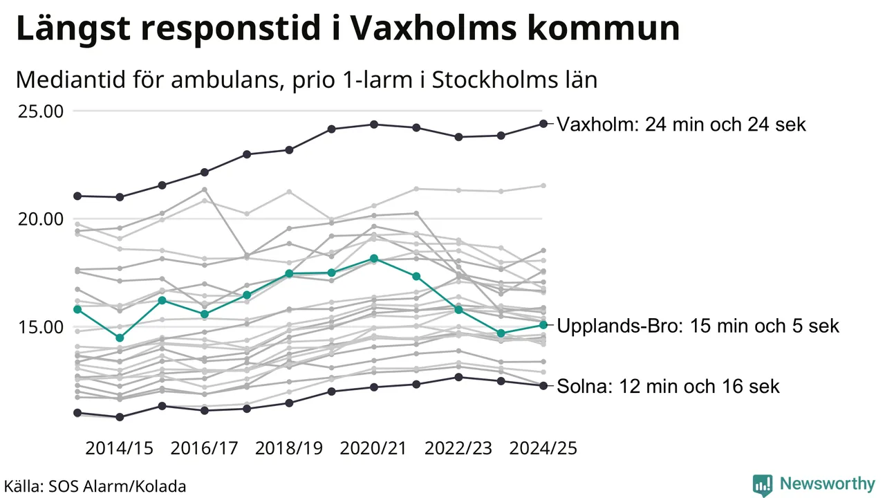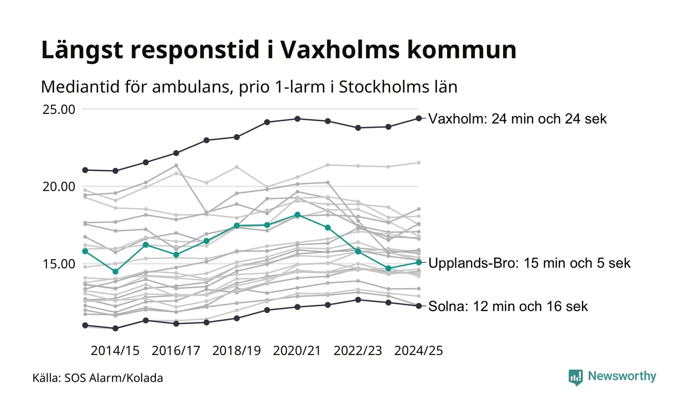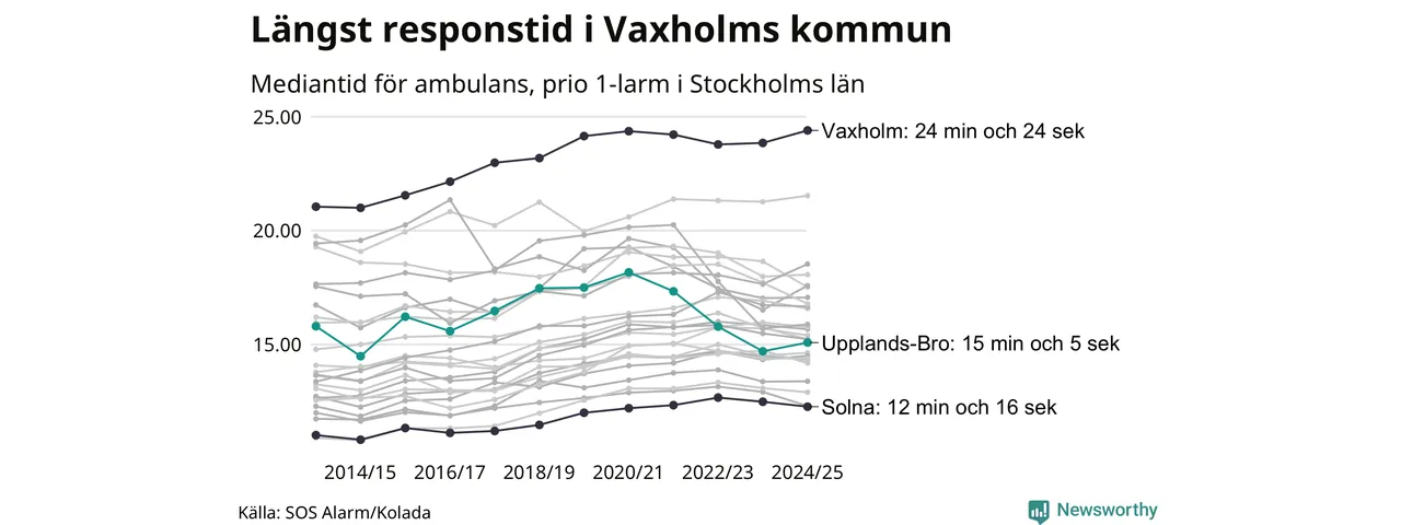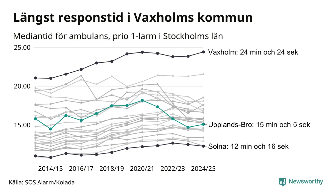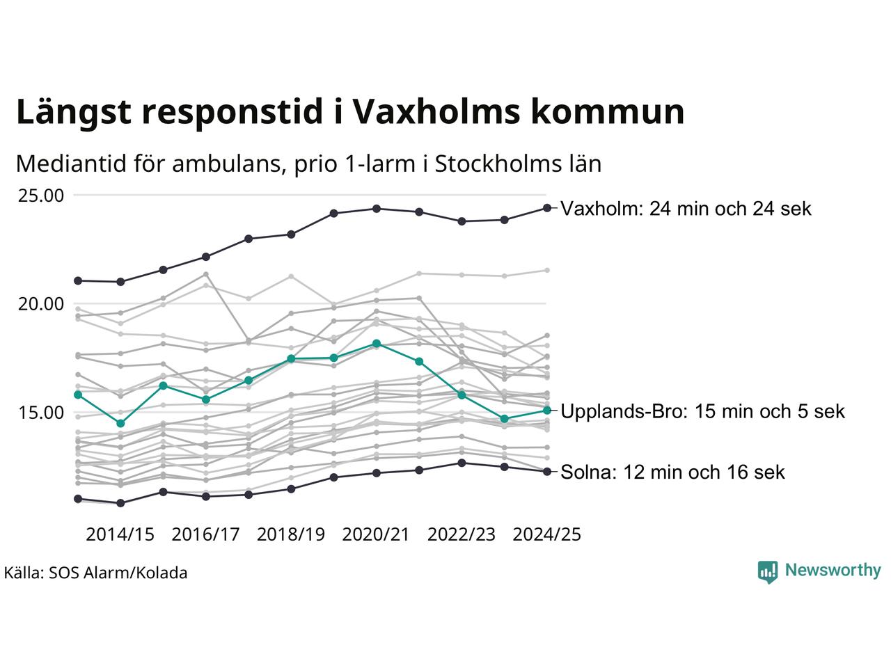 Upplands-Bro tillhör inte de kommuner i Region Stockholm som får vänta längst på ambulans – men inte heller de som får snabbast hjälp. Längst är väntetiden i Vaxholms kommun: 24 minuter och 24 sekunder. Snabbast var ambulansen framme i Solna, där det tog 12 minuter och 16 sekunder från larmsamtalet 2024/2025.