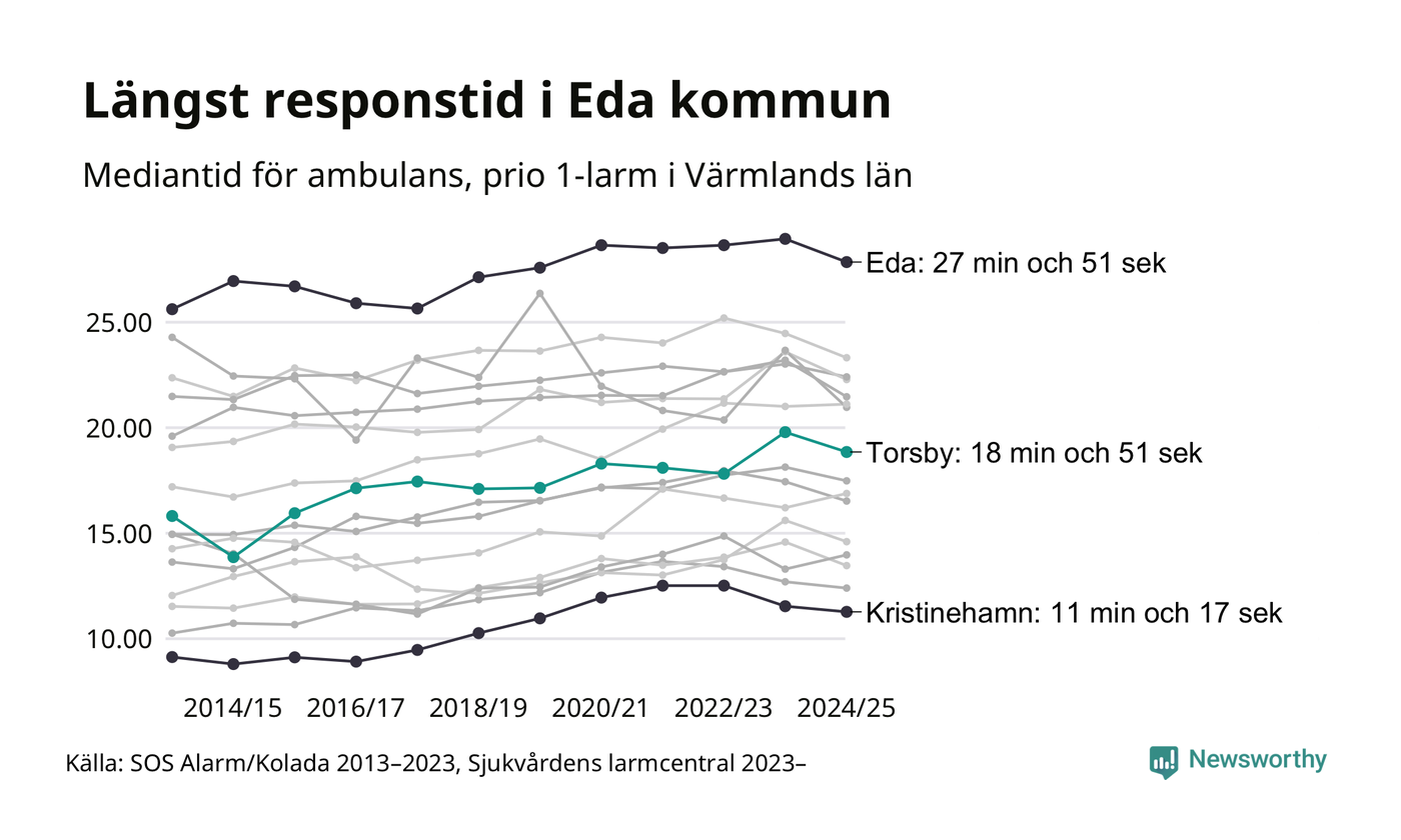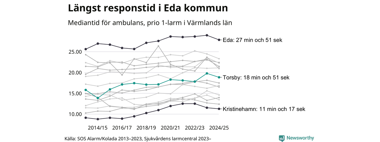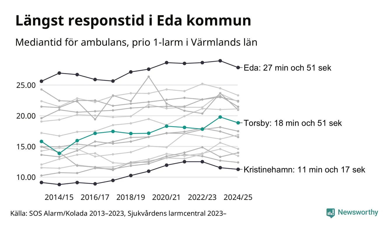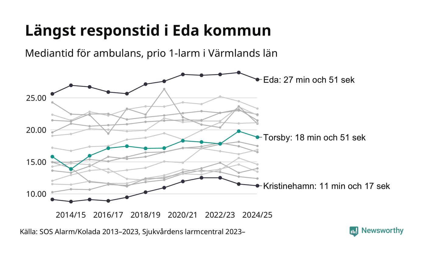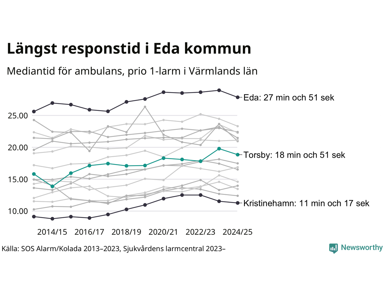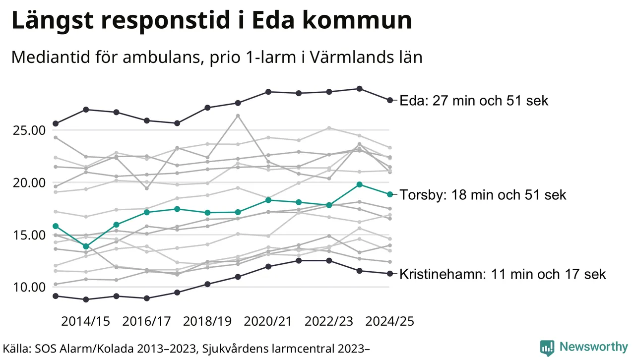 Torsby tillhör inte de kommuner i Region Värmland som får vänta längst på ambulans – men inte heller de som får snabbast hjälp. Längst är väntetiden i Eda kommun, som också tillhör de tio kommuner i landet som får vänta längst på ambulans: 27 minuter och 51 sekunder. Snabbast var ambulansen framme i Kristinehamn, där det tog 11 minuter och 17 sekunder från larmsamtalet 2024/2025.