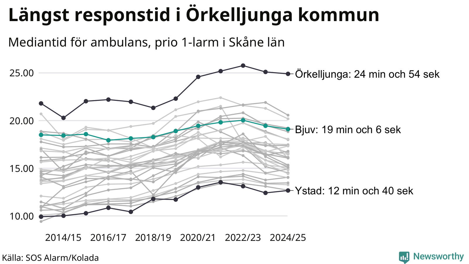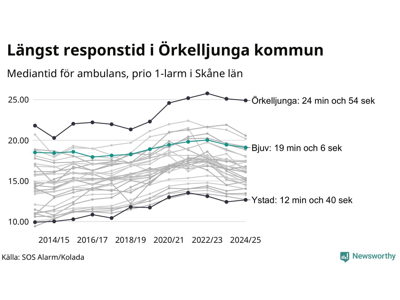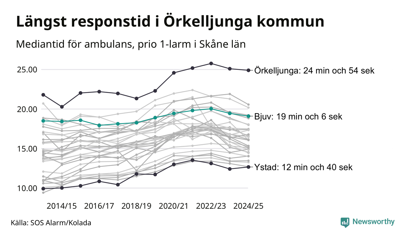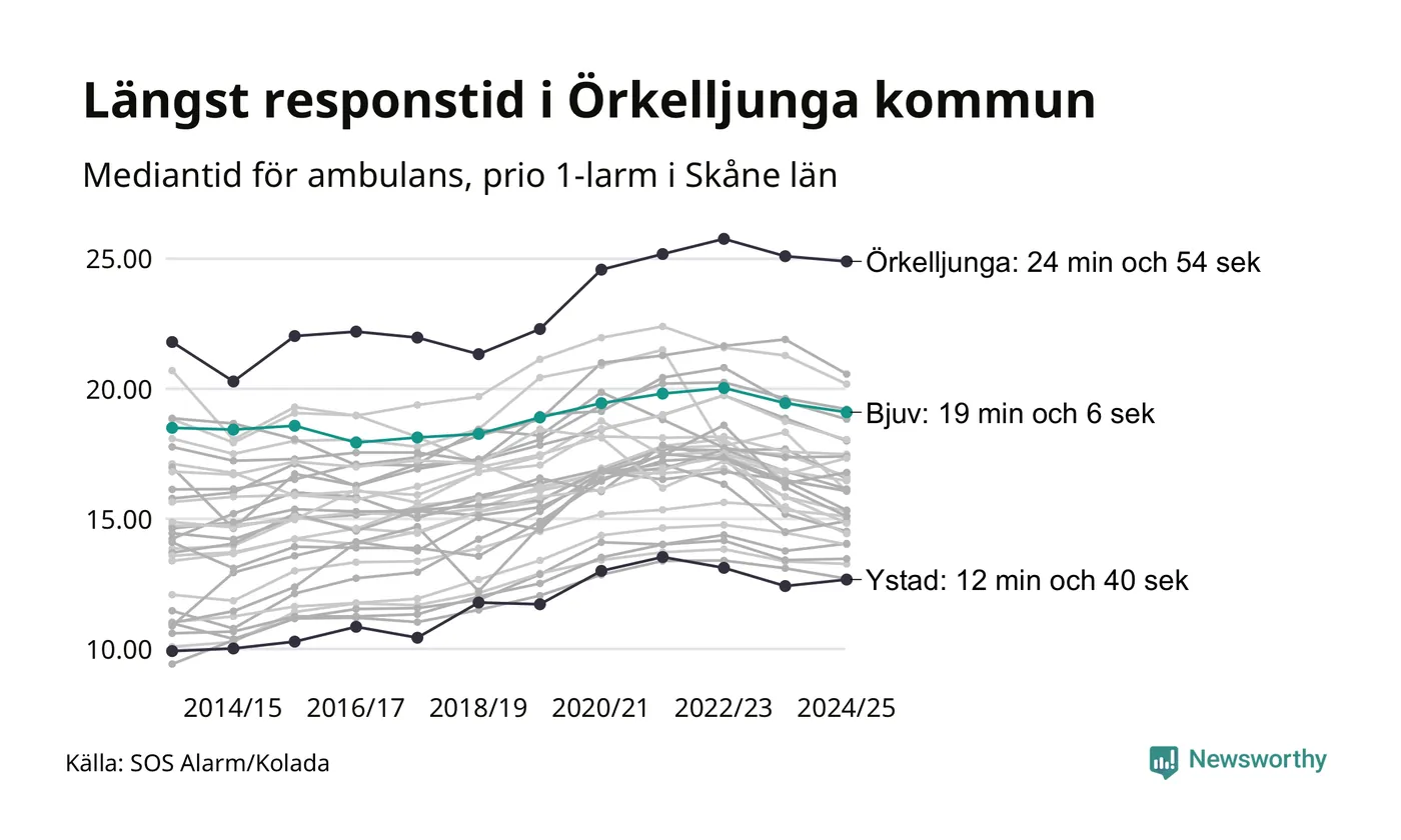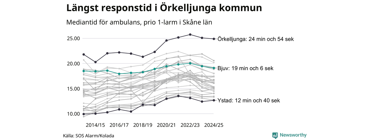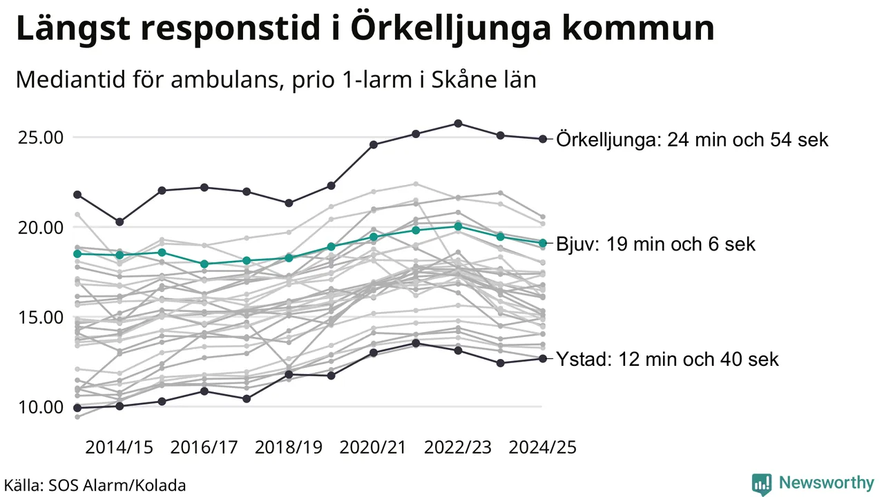 Bjuv tillhör de kommuner i Region Skåne som får vänta längst på ambulansen. Längst är väntetiden i Örkelljunga kommun: 24 minuter och 54 sekunder. Snabbast var ambulansen framme i Ystad, där det tog 12 minuter och 40 sekunder från larmsamtalet 2024/2025.