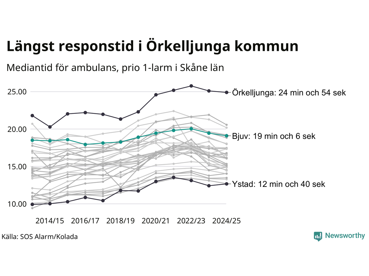 Det tar 19 minuter och 6 sekunder från att 112-samtalet når larmcentralen till att ambulansen är på plats i Bjuvs kommun. Det visar de senaste siffrorna från SOS Alarm. Tiden är en mediantid för alla prio 1-larm mellan 1 juni 2024 och 31 maj 2025 och ett nyckeltal som redovisas varje år.