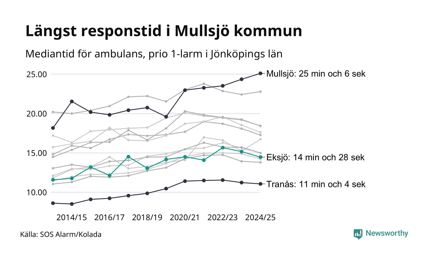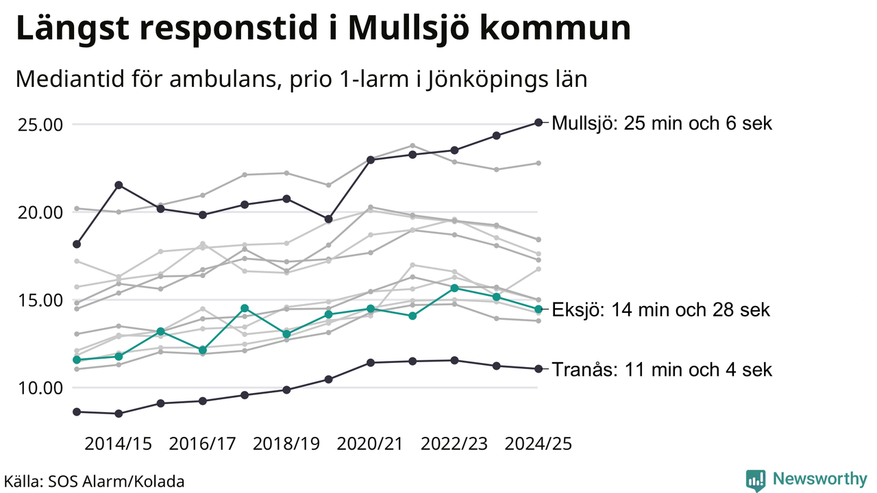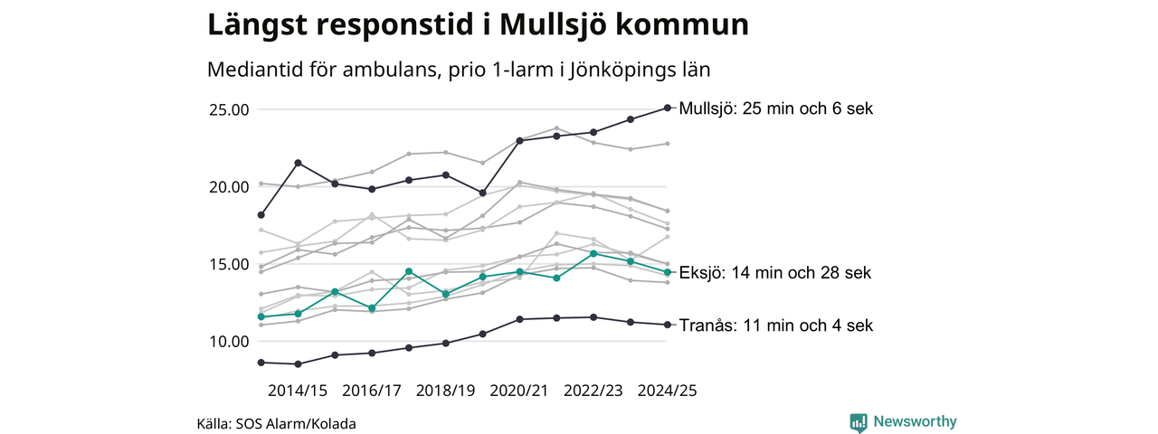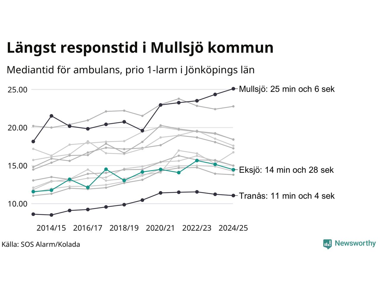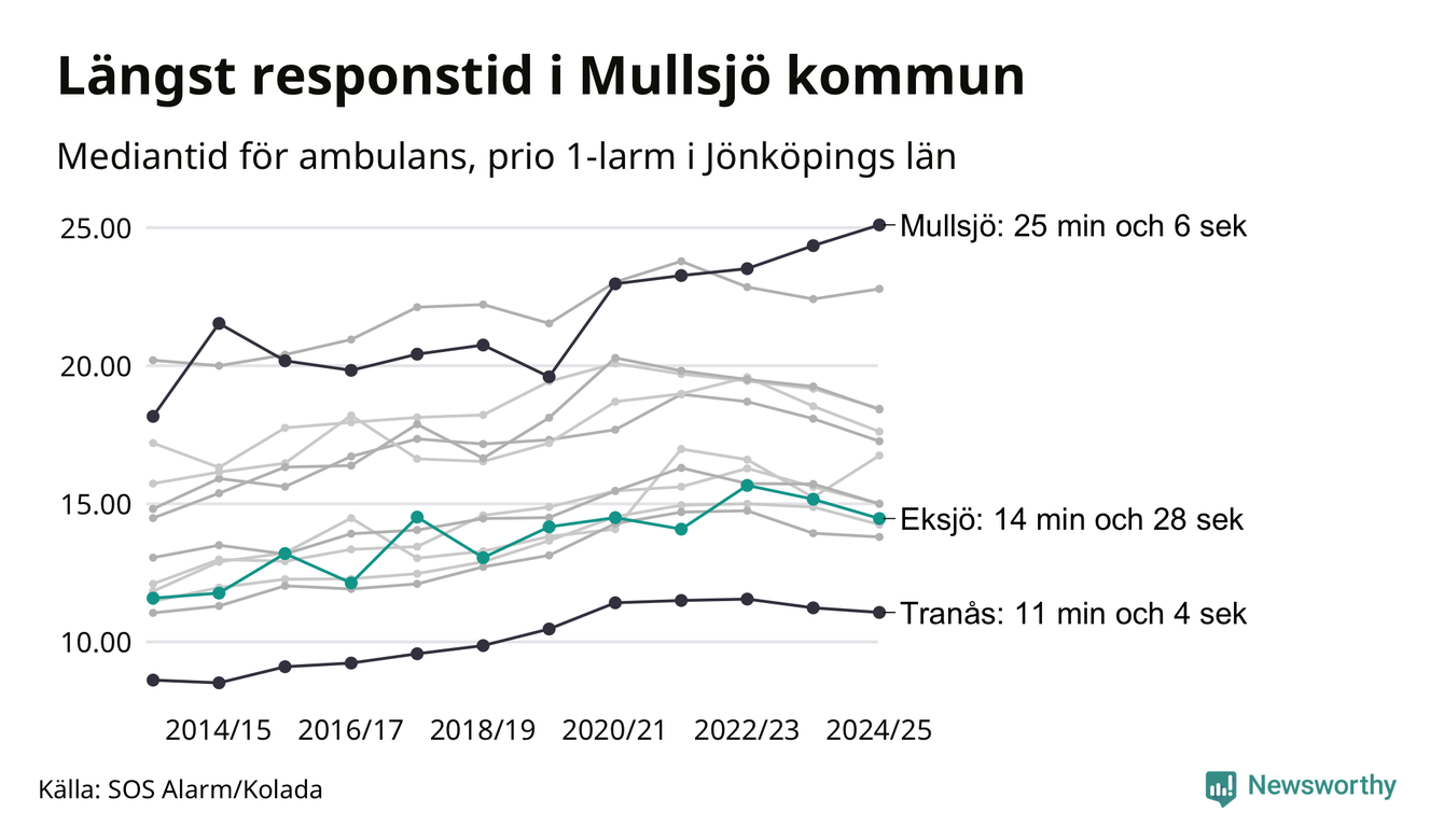 Det tar 14 minuter och 28 sekunder från att 112-samtalet når larmcentralen till att ambulansen är på plats i Eksjö kommun. Det visar de senaste siffrorna från SOS Alarm. Tiden är en mediantid för alla prio 1-larm mellan 1 juni 2024 och 31 maj 2025 och ett nyckeltal som redovisas varje år.