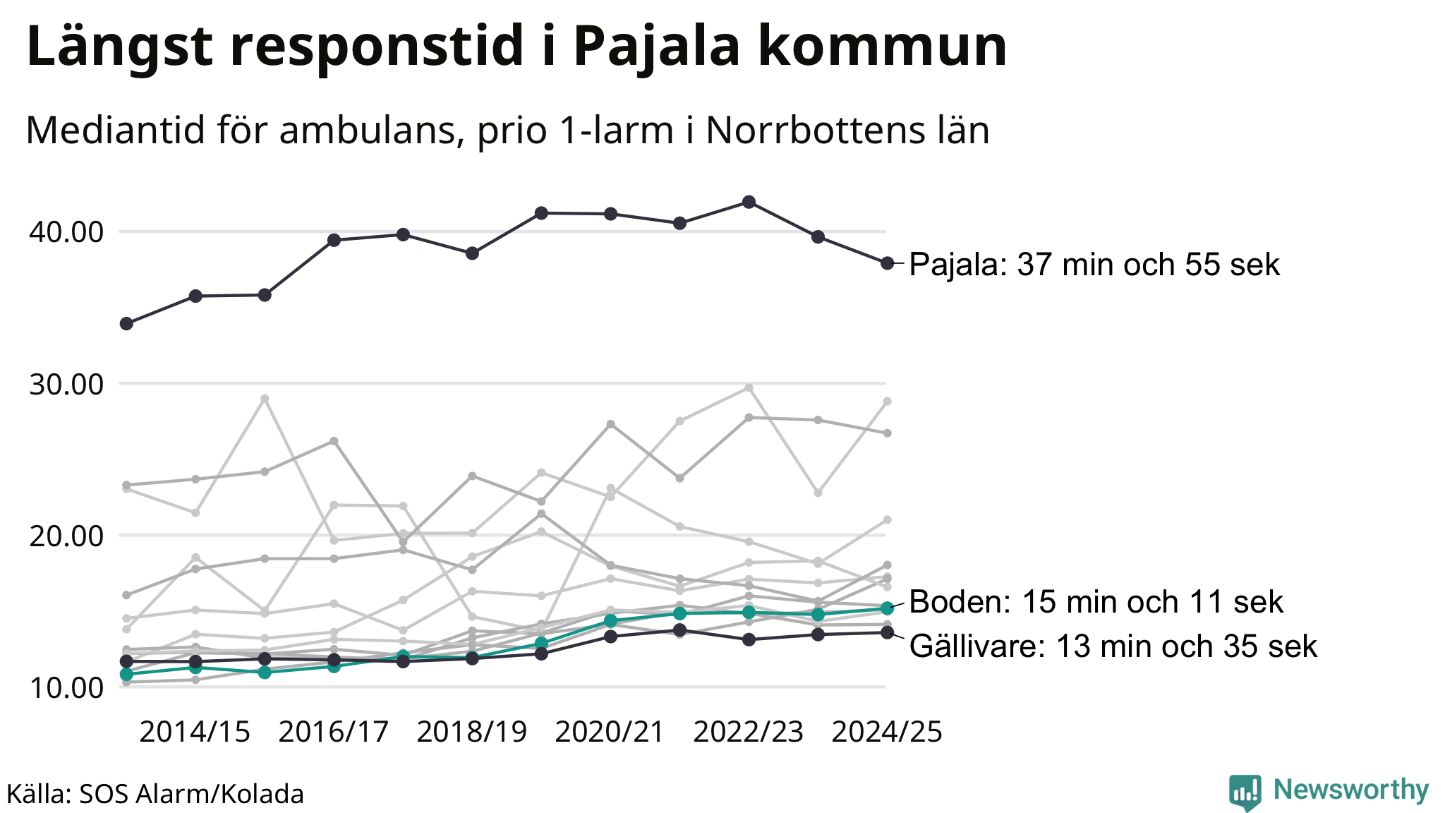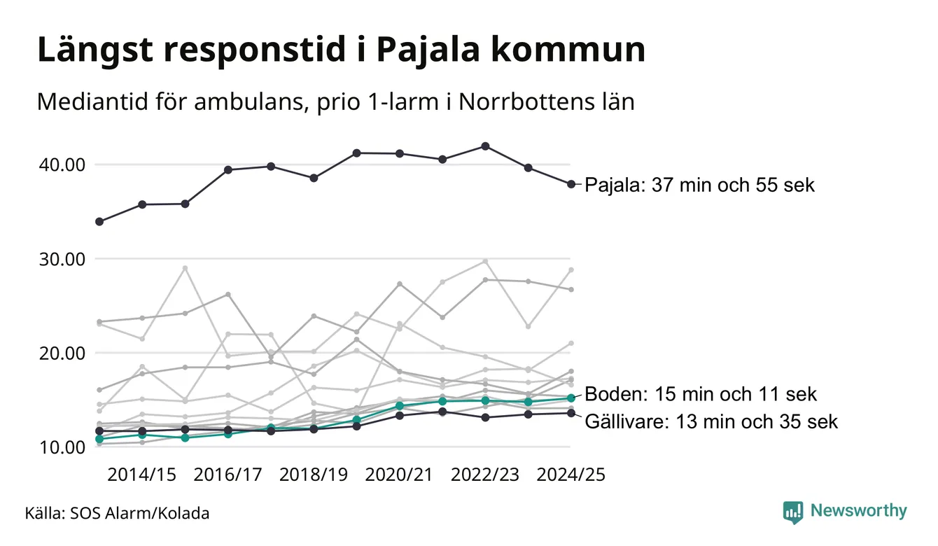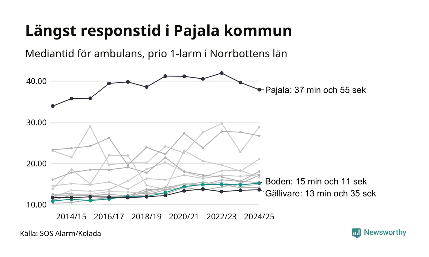 Det tar 15 minuter och 11 sekunder från att 112-samtalet når larmcentralen till att ambulansen är på plats i Bodens kommun. Det visar de senaste siffrorna från SOS Alarm. Tiden är en mediantid för alla prio 1-larm mellan 1 juni 2024 och 31 maj 2025 och ett nyckeltal som redovisas varje år.